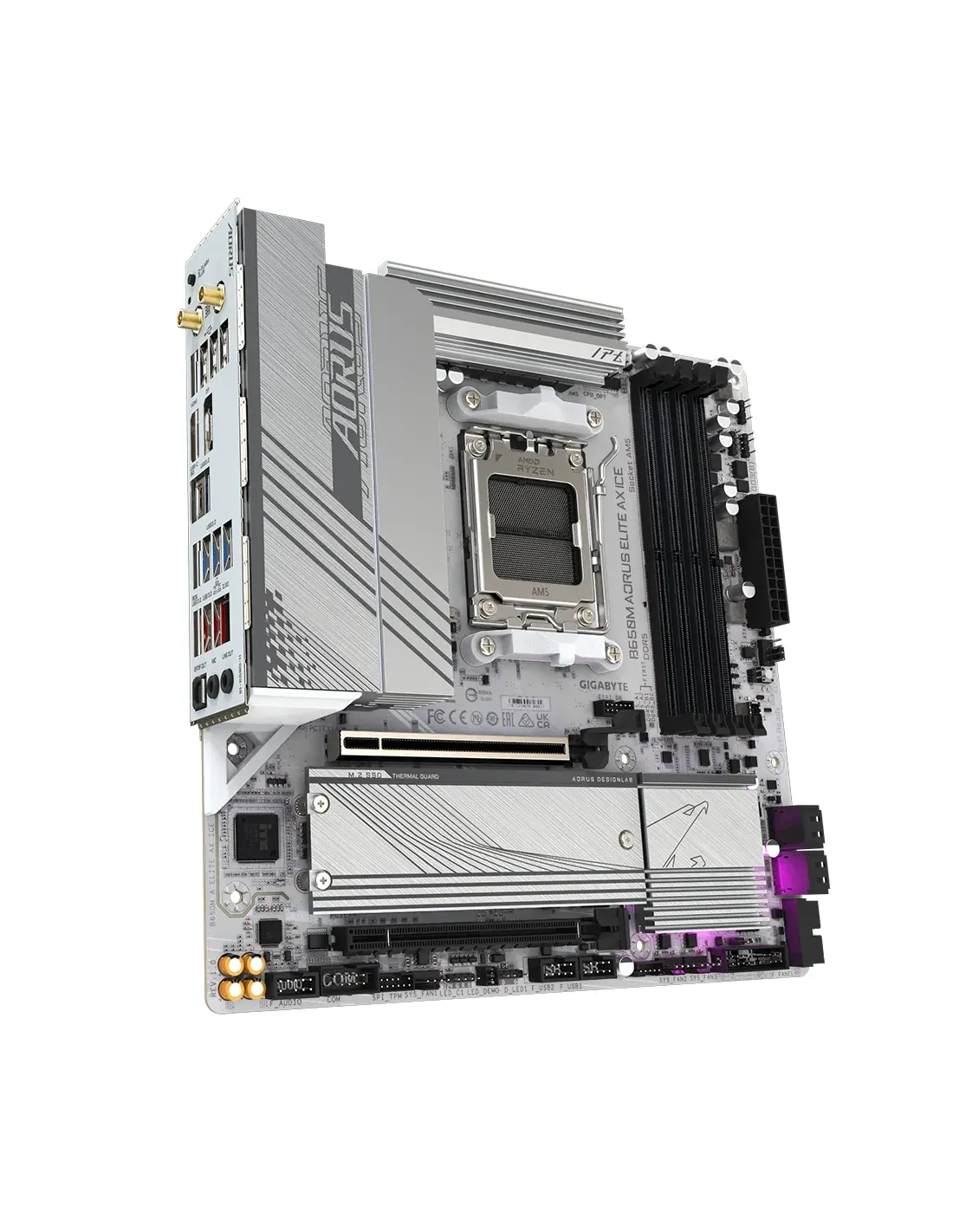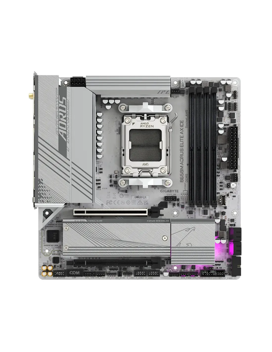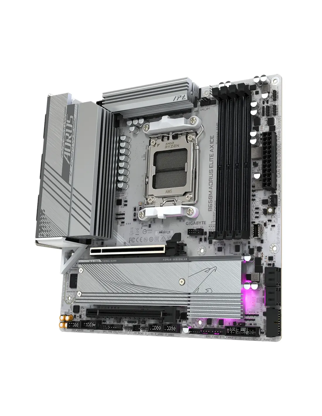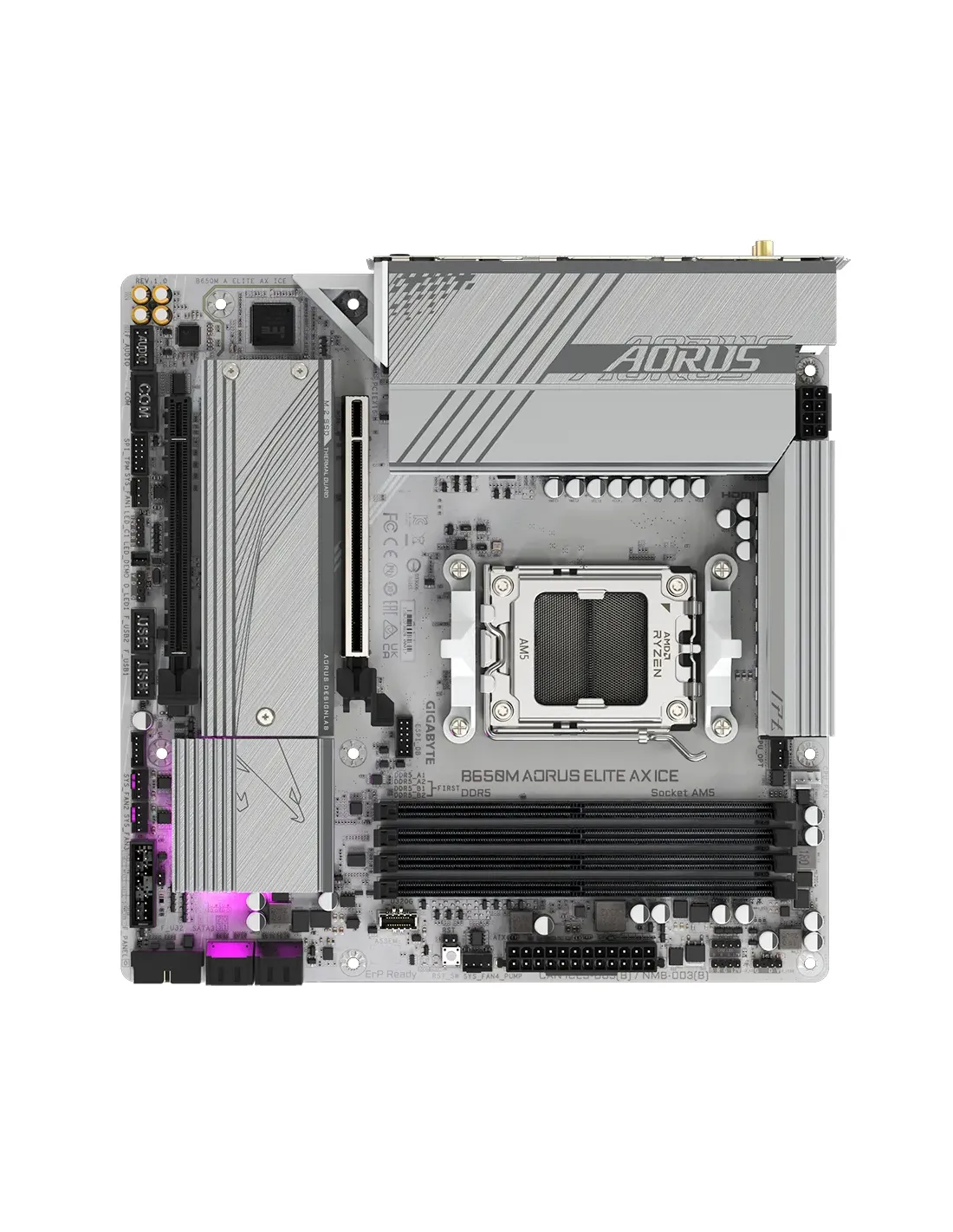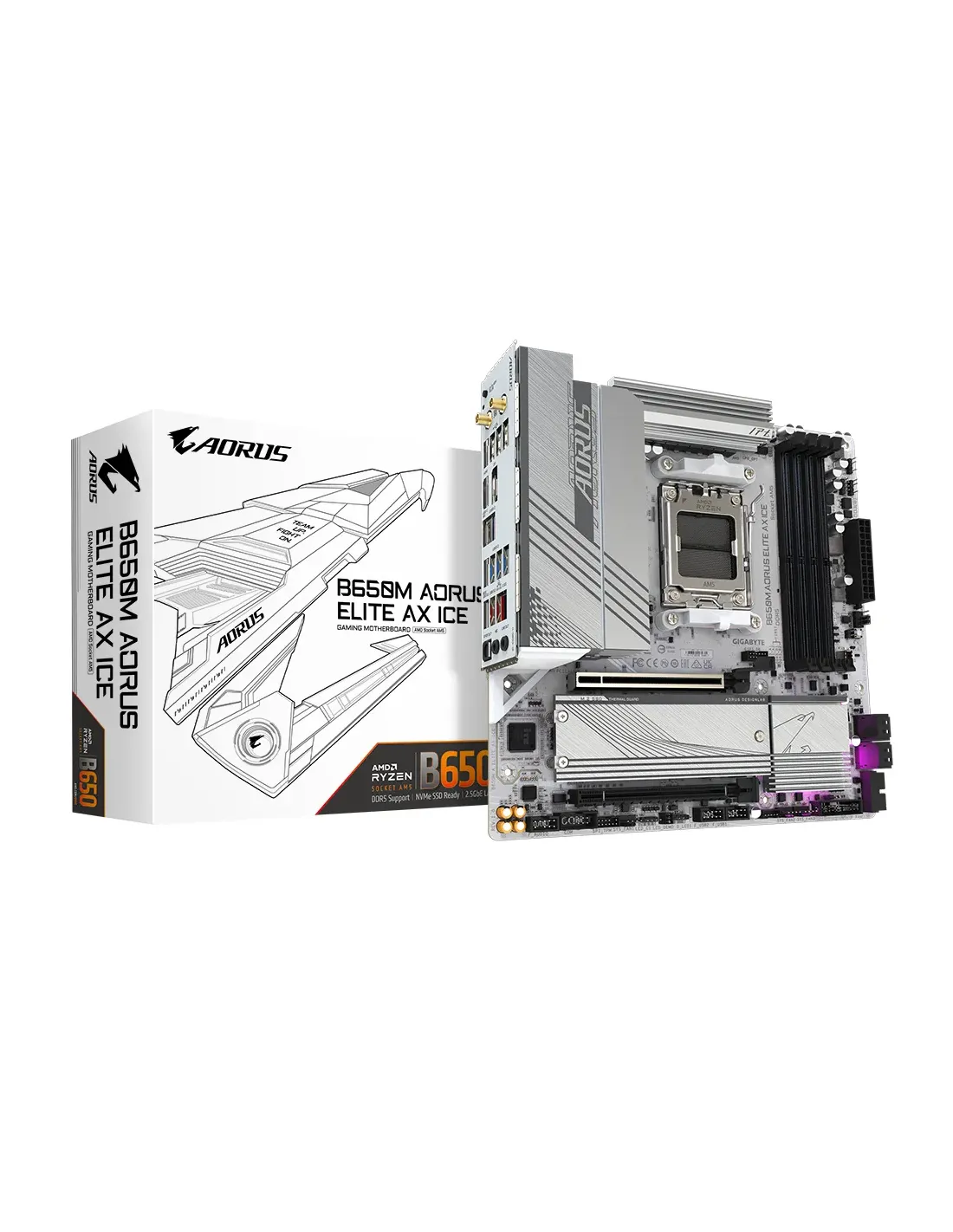 PLACA GIGABYTE B650M A ELITE AX ICE,AMD,AM5,B650,4DDR5,128GB,HDMI+DP,6SATA3+2M.2,2.5GBE+WIFI6E+BT5.3,7USB3.2,MATX (BLANCO)