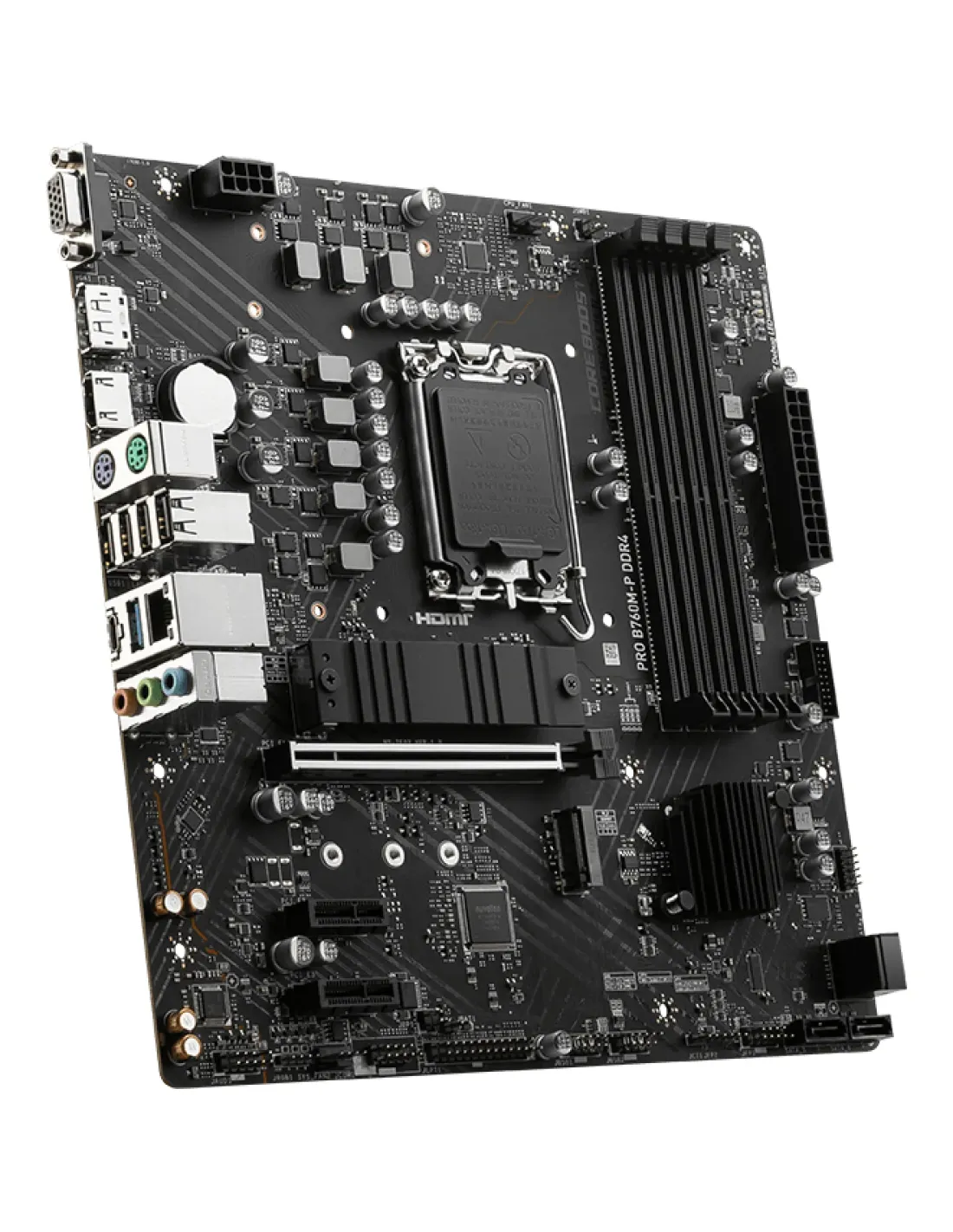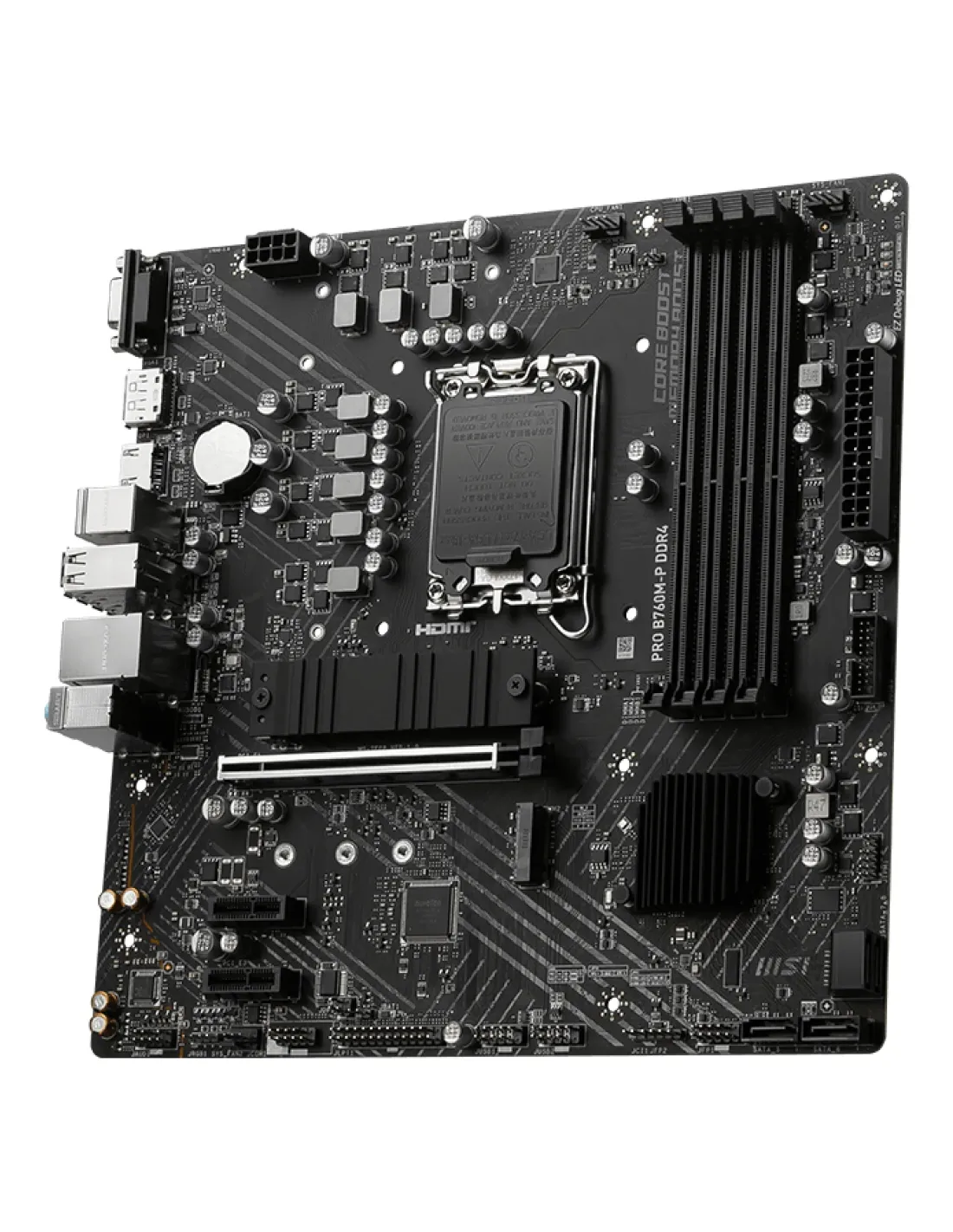 MSI PRO B760M-P DDR4. Fabricante de procesador: Intel, Socket de procesador: LGA 1700, Procesador compatible: Intel® Celeron®, Intel® Pentium® Gold. tipos de memoria compatibles: DDR4-SDRAM, Memoria interna máxima: 128 GB, Tipo de ranuras de memoria: DIMM. Interfaces de disco de almacenamiento soportados: M.2, SATA III, Niveles RAID: 0, 1, 5, 10. Tipo de interfaz ethernet: 2.5 Gigabit Ethernet. Componente para: PC, Factor de forma: micro ATX, Familia del chipset: Intel