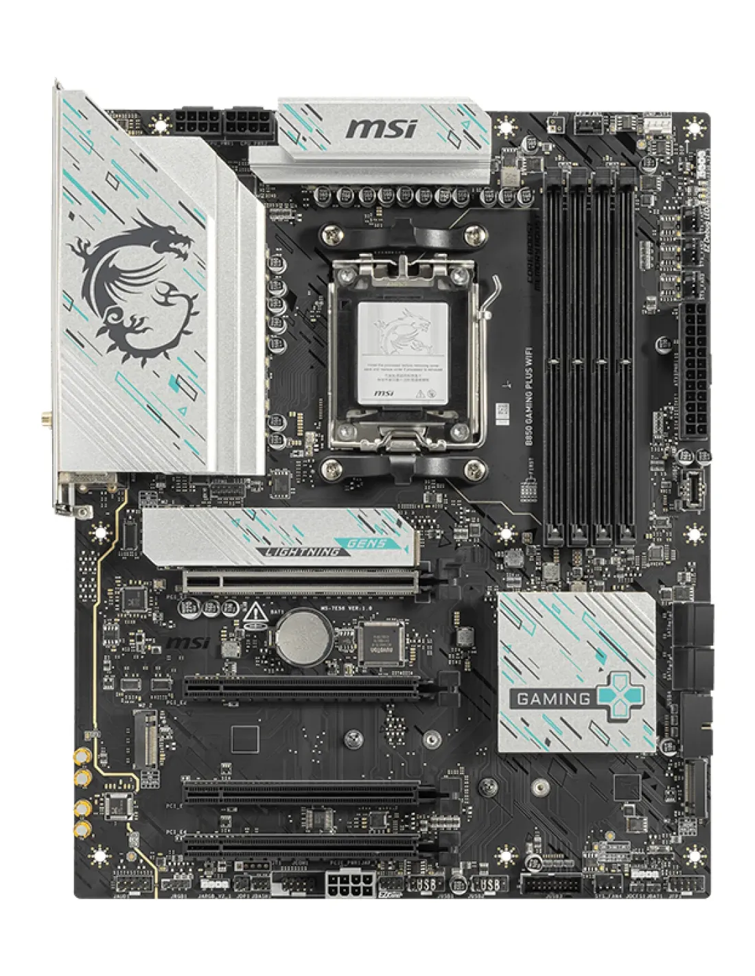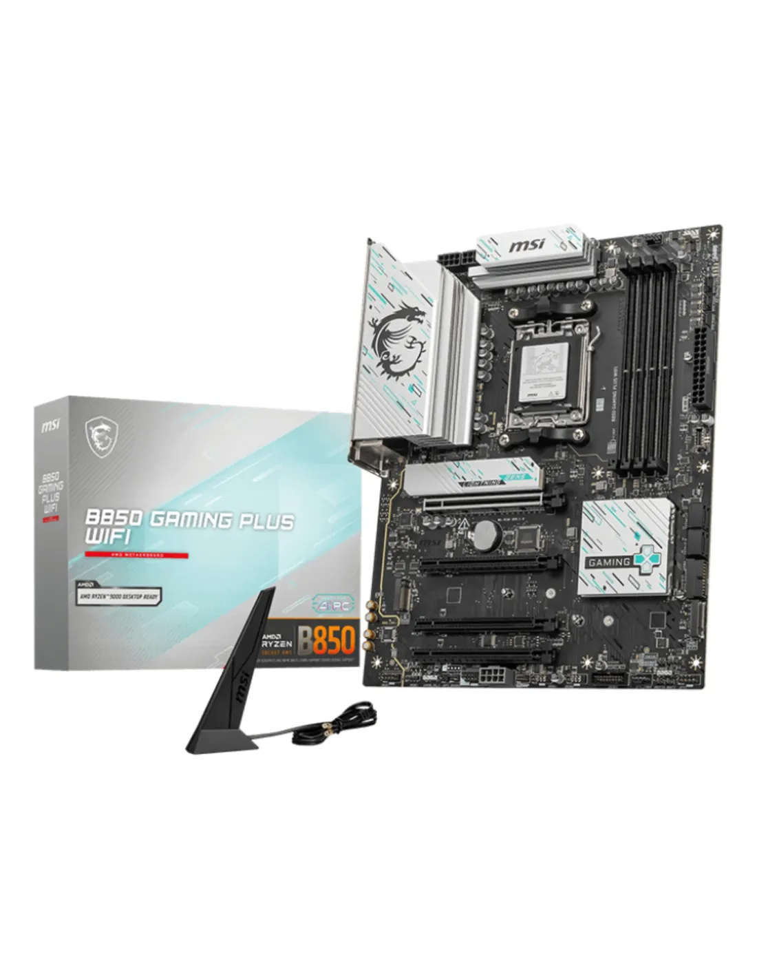 MSI B850 GAMING PLUS WIFI. Fabricante de procesador: AMD, Socket de procesador: Zócalo AM5, Procesador compatible: AMD Ryzen 7000 Series, AMD Ryzen 8000 Series, AMD Ryzen 9000 Series. tipos de memoria compatibles: DDR5-SDRAM, Memoria interna máxima: 256 GB, Tipo de ranuras de memoria: DIMM. Interfaces de disco de almacenamiento soportados: M.2, Micro SATA III, Tipos de unidades de almacenamiento admitidas: HDD & SSD, Niveles RAID: 0, 1. Tipo de interfaz ethernet: 5 Gigabit Ethernet, Estándar Wi-Fi: Wi-Fi 7 (802.11be), Wi-Fi estándares: 802.11a, 802.11b, 802.11g, Wi-Fi 4 (802.11n), Wi-Fi 5 (802.11ac), Wi-Fi 6 (802.11ax), Wi-Fi 6E.... Componente para: PC, Factor de forma: ATX, Familia del chipset: AMD