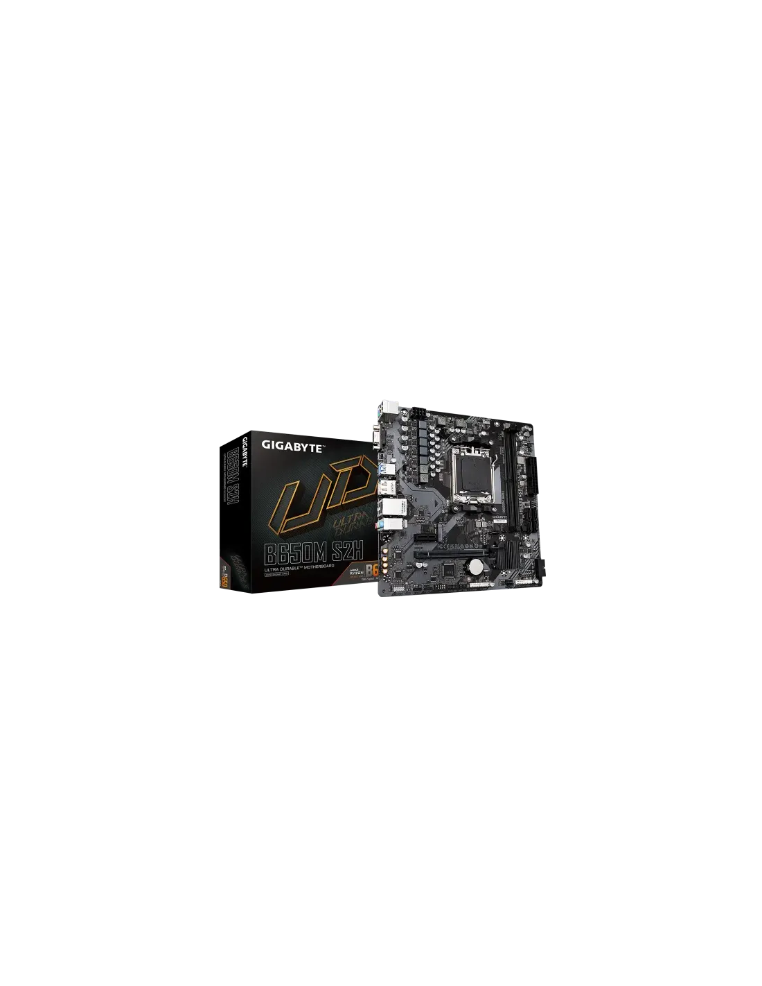 Gigabyte B650M S2H. Fabricante de procesador: AMD, Socket de procesador: Zócalo AM5, Procesador compatible: AMD Ryzen 5 7th Gen, AMD Ryzen 7 7th Gen, AMD Ryzen 9 7th Gen. tipos de memoria compatibles: DDR5-SDRAM, Memoria interna máxima: 96 GB, Tipo de ranuras de memoria: DIMM. Interfaces de disco de almacenamiento soportados: M.2, SATA III, Tipos de unidades de almacenamiento admitidas: HDD & SSD, Niveles RAID: 0, 1, 10. Máxima resolución: 4096 x 2160 Pixeles. Conector USB: USB tipo A