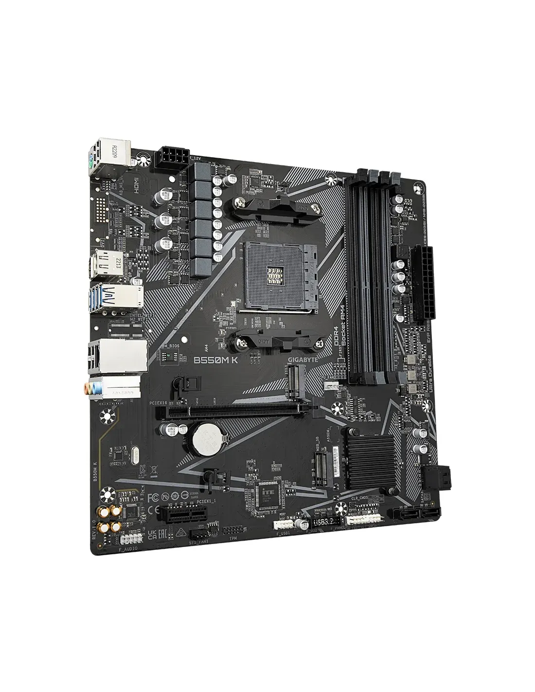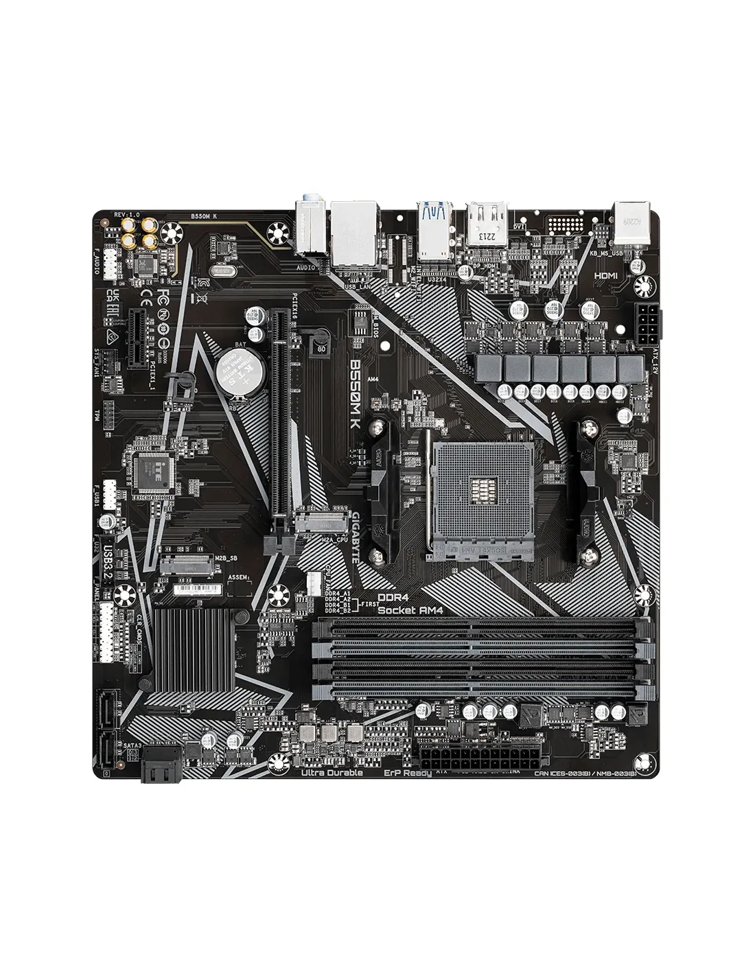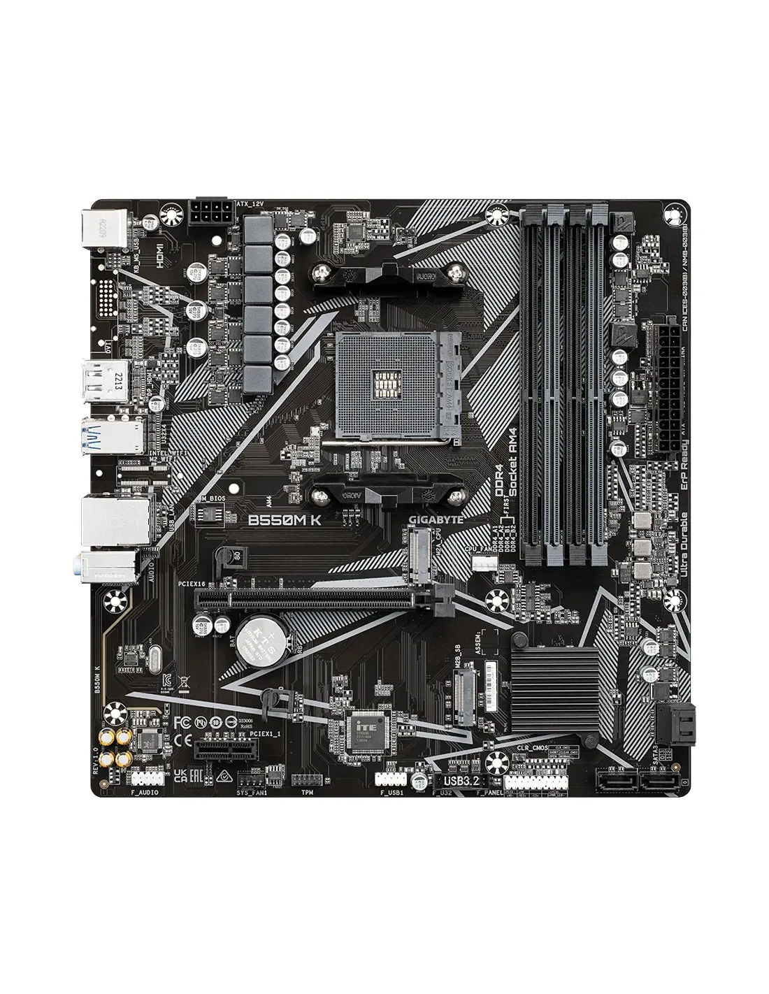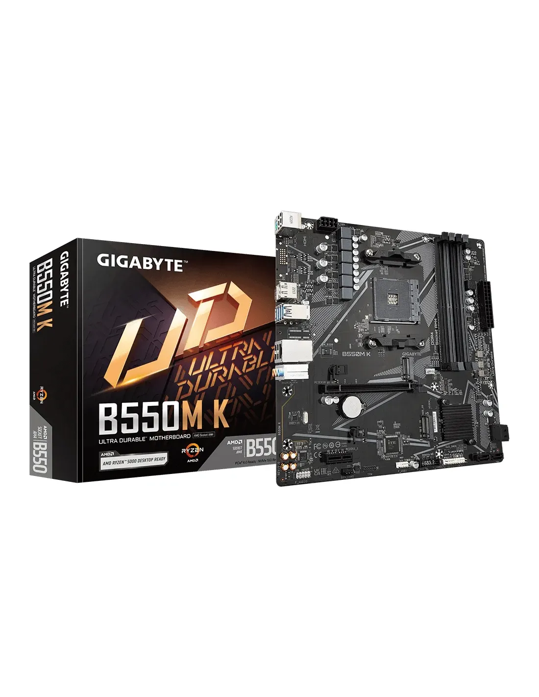 Gigabyte B550M K 1.0. Fabricante de procesador: AMD, Socket de procesador: Zócalo AM4, Procesador compatible: AMD Ryzen™ 5. tipos de memoria compatibles: DDR4-SDRAM, Memoria interna máxima: 128 GB, Tipo de ranuras de memoria: DIMM. Interfaces de disco de almacenamiento soportados: M.2, PCI Express 3.0, PCI Express 4.0, SATA, Tipos de unidades de almacenamiento admitidas: SSD, Niveles RAID: 0, 1, 10. Graphics chipset: AMD, Máxima resolución: 5120 x 2880 Pixeles. Tipo de interfaz ethernet: Gigabit Ethernet