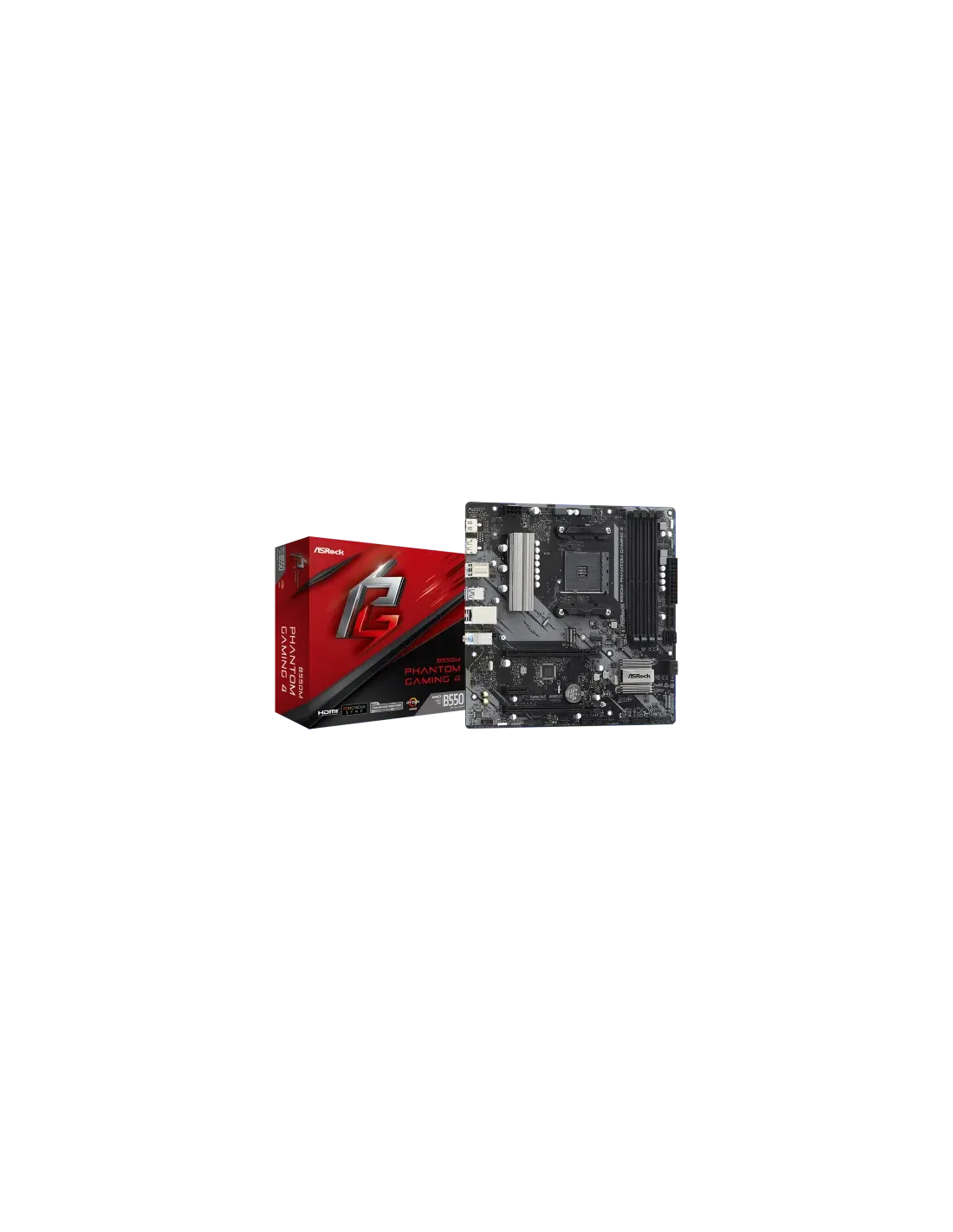 Asrock B550M Phantom Gaming 4. Fabricante de procesador: AMD, Socket de procesador: Zócalo AM4, Procesador compatible: AMD Ryzen™ 3, AMD Ryzen™ 5, AMD Ryzen™ 7, 3rd Generation AMD Ryzen™ 9. tipos de memoria compatibles: DDR4-SDRAM, Memoria interna máxima: 128 GB, Tipo de ranuras de memoria: DIMM. Interfaces de disco de almacenamiento soportados: SATA III, Tipos de unidades de almacenamiento admitidas: HDD & SSD. Máxima resolución: 5120 x 2880 Pixeles. Tipo de interfaz ethernet: Gigabit Ethernet, Controlador LAN: Realtek RTL8111H
