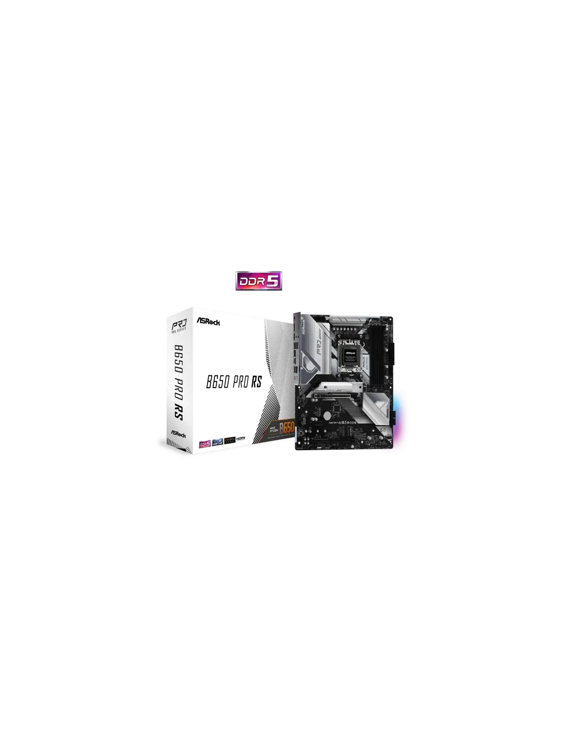 Asrock B650 Pro RS. Fabricante de procesador: AMD, Socket de procesador: Zócalo AM5, Procesador compatible: AMD Ryzen™ 7, AMD Ryzen 9 7th Gen, AMD Ryzen™ 5. tipos de memoria compatibles: DDR5-SDRAM, Memoria interna máxima: 128 GB, Tipo de ranuras de memoria: DIMM. Interfaces de disco de almacenamiento soportados: M.2, SATA III, Tipos de unidades de almacenamiento admitidas: HDD & SSD, Niveles RAID: 0, 1, 10. Tipo de interfaz ethernet: 2.5 Gigabit Ethernet, Controlador LAN: Dragon RTL8125BG. Componente para: PC, Factor de forma: ATX, Familia del chipset: AMD