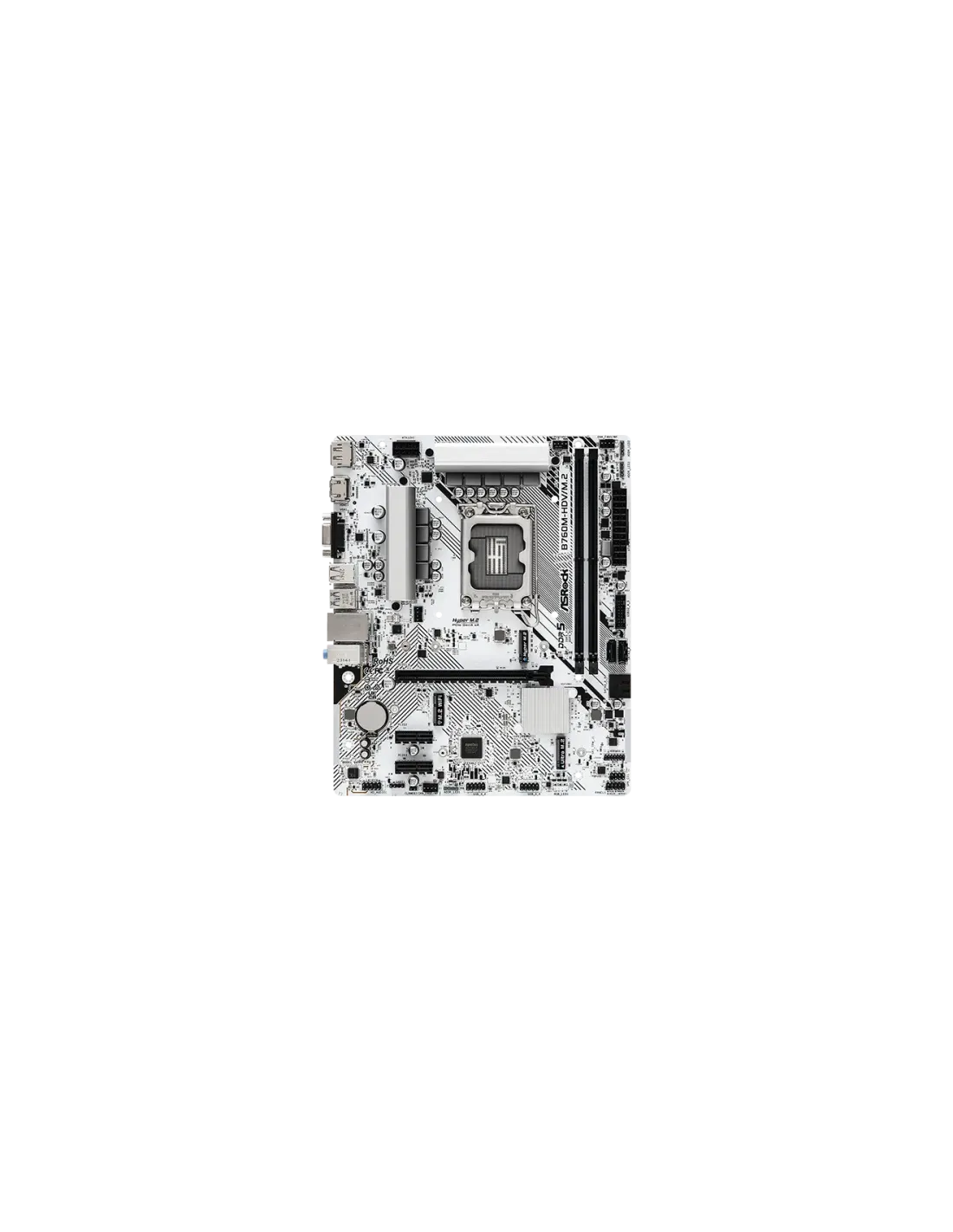 Asrock B760M-HDV/M.2. Fabricante de procesador: Intel, Socket de procesador: LGA 1700, Procesador compatible: Intel Core i3 12th Gen, Intel Core i3 13th Gen, Intel Core i5 12th Gen, Intel Core i5 13th Gen,.... tipos de memoria compatibles: DDR5-SDRAM, Memoria interna máxima: 96 GB, Tipo de ranuras de memoria: DIMM. Interfaces de disco de almacenamiento soportados: M.2, SATA III, Niveles RAID: 0, 1, 5, 10. Tipo de interfaz ethernet: 2.5 Gigabit Ethernet, Controlador LAN: Dragon RTL8125BG. Componente para: PC, Factor de forma: micro ATX, Familia del chipset: Intel