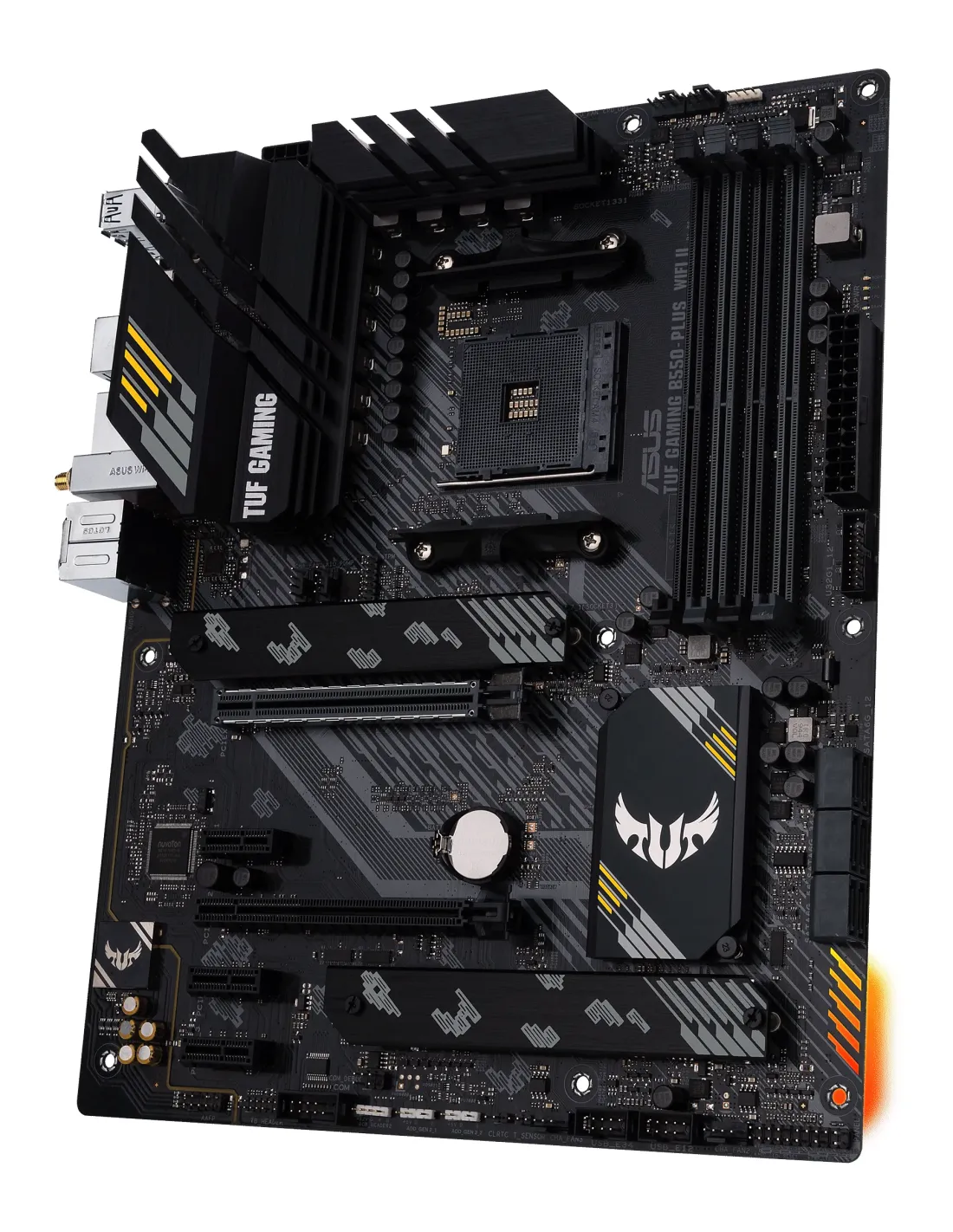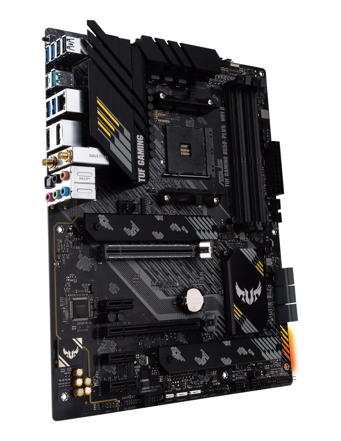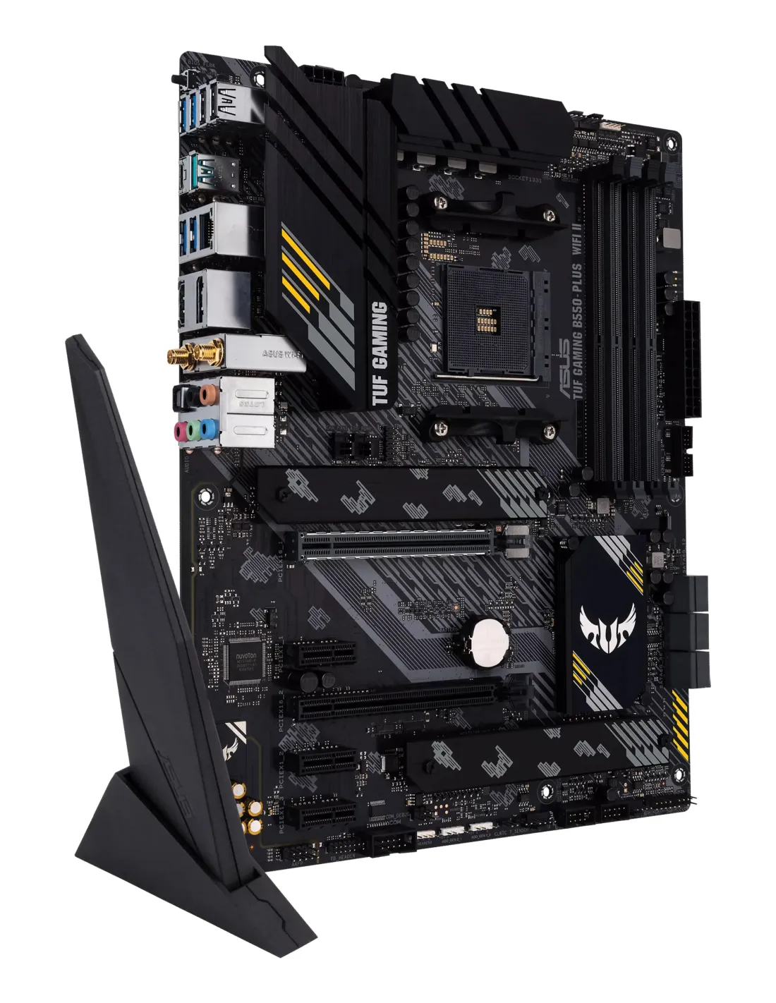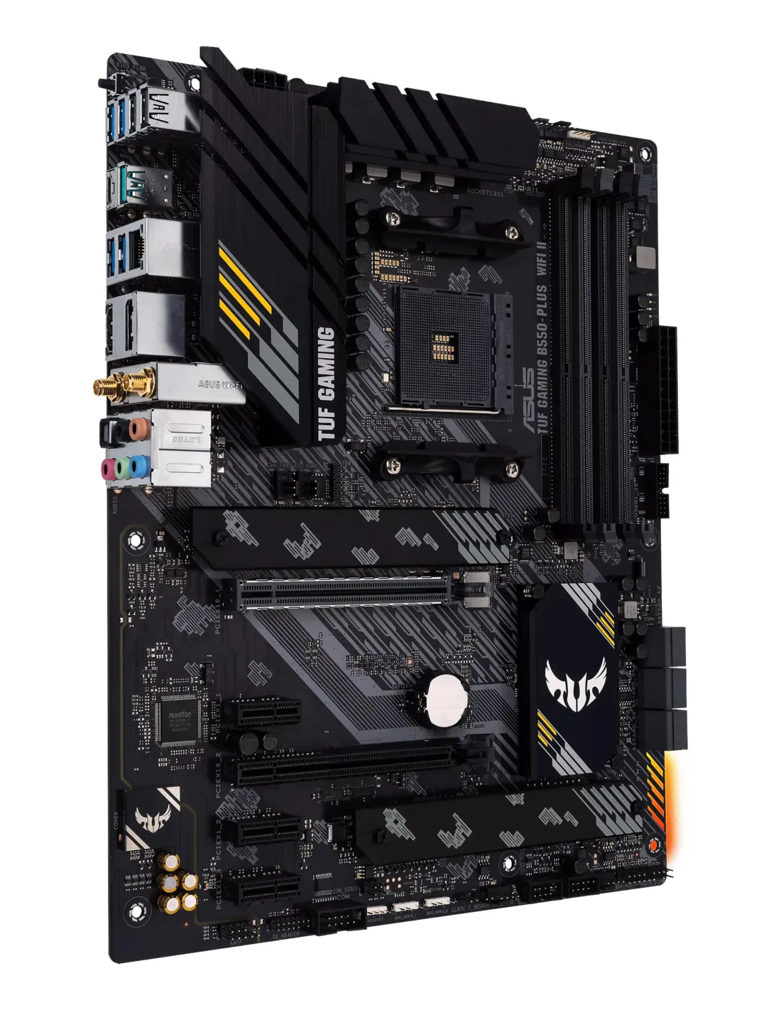 ASUS TUF GAMING B550-PLUS WIFI II. Fabricante de procesador: AMD, Socket de procesador: Zócalo AM4, Procesador compatible: 3rd Generation AMD Ryzen 5, 3rd Generation AMD Ryzen 7, 3rd Generation AMD Ryzen 9. tipos de memoria compatibles: DDR4-SDRAM, Memoria interna máxima: 128 GB, Tipo de ranuras de memoria: DIMM. Interfaces de disco de almacenamiento soportados: M.2,SATA, Tipos de unidades de almacenamiento admitidas: HDD & SSD. Conector USB: USB tipo A, USB Tipo C. Tipo de interfaz ethernet: 2.5 Gigabit Ethernet, Controlador LAN: Realtek RTL8125B, Estándar Wi-Fi: Wi-Fi 6 (802.11ax)