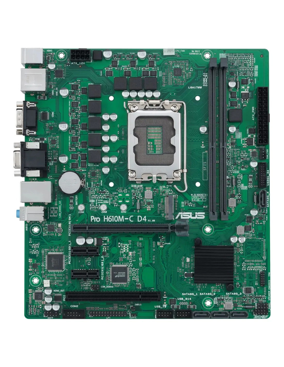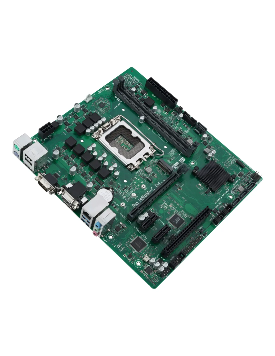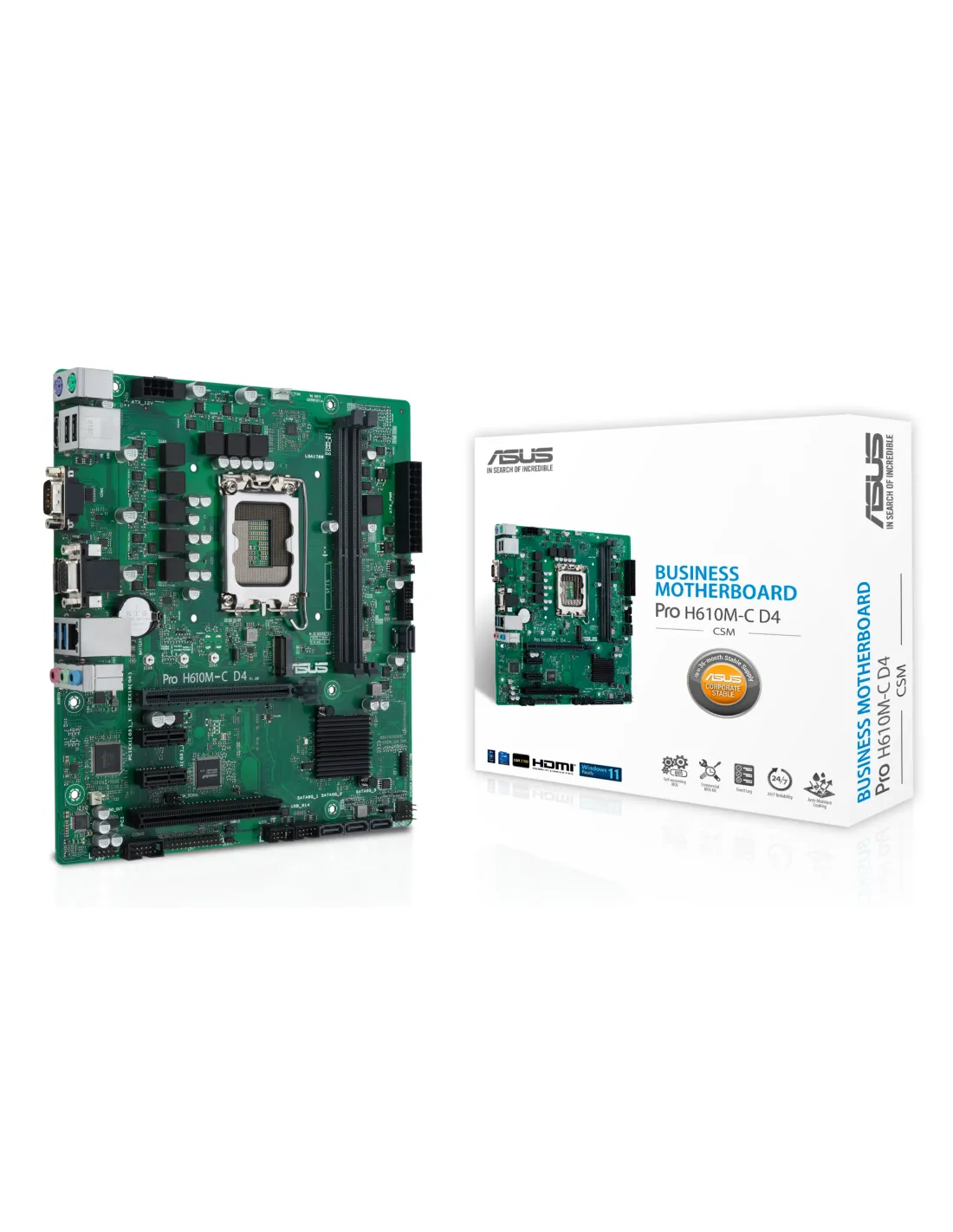 ASUS PRO H610M-C D4-CSM. Fabricante de procesador: Intel, Socket de procesador: LGA 1700, Procesador compatible: Intel® Celeron®, Intel® Core™ i3, Intel® Core™ i5, Intel® Core™ i7, Intel® Core™ i9, Intel® Pentium®. tipos de memoria compatibles: DDR4-SDRAM, Memoria interna máxima: 64 GB, Tipo de ranuras de memoria: DIMM. Interfaces de disco de almacenamiento soportados: M.2, SATA III, Tipos de unidades de almacenamiento admitidas: HDD & SSD. Tipo de interfaz ethernet: Gigabit Ethernet. Componente para: PC, Factor de forma: micro ATX, Familia del chipset: Intel