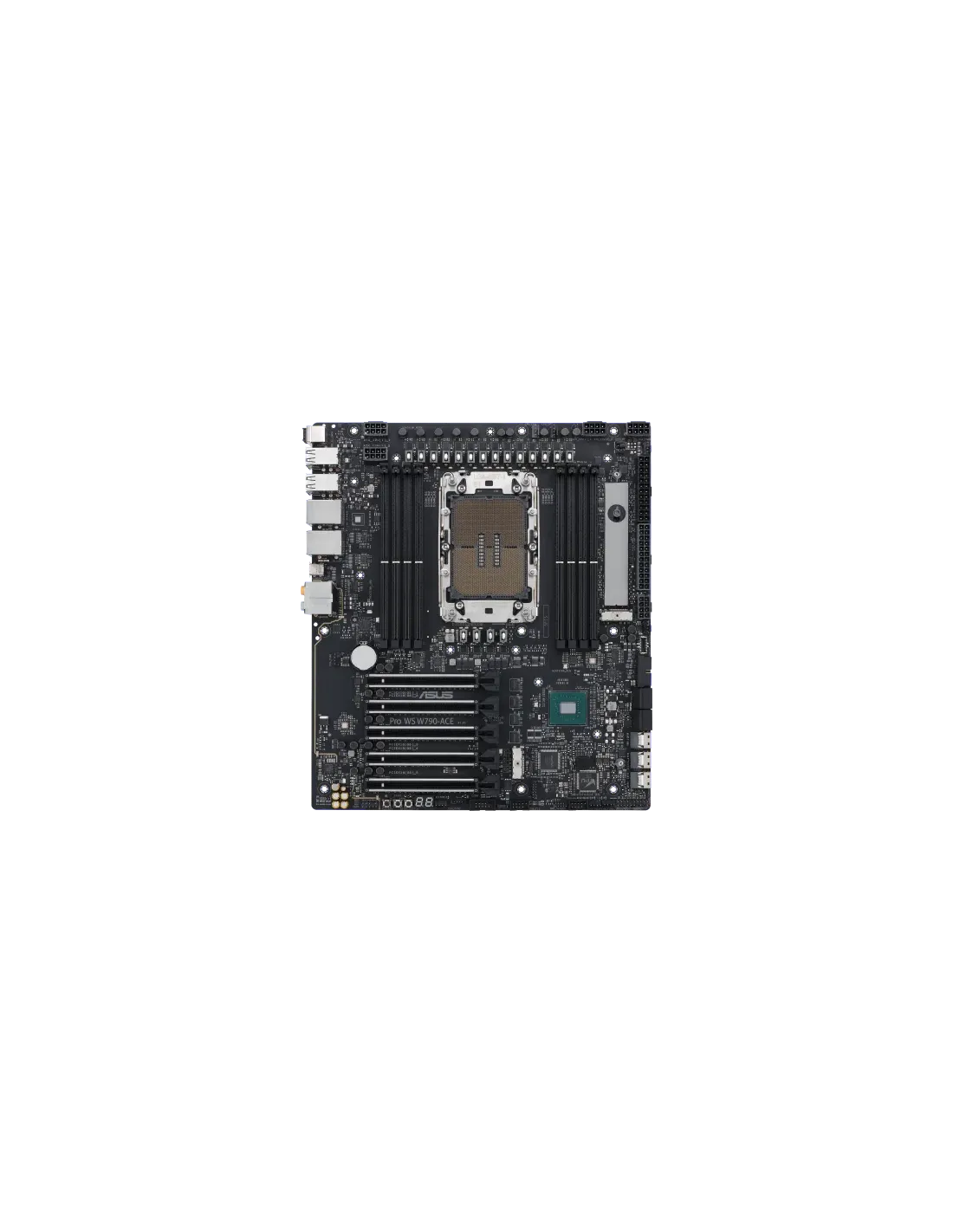 ASUS PRO WS W790-ACE. Fabricante de procesador: Intel, Socket de procesador: LGA 4677, Procesador compatible: Intel® Xeon® W. tipos de memoria compatibles: DDR5-SDRAM, Memoria interna máxima: 2,05 TB, Tipo de ranuras de memoria: DIMM. Interfaces de disco de almacenamiento soportados: M.2, SATA III, Tipos de unidades de almacenamiento admitidas: HDD & SSD, Niveles RAID: 0, 1, 5, 10. Tipo de interfaz ethernet: 2.5 Gigabit Ethernet, 10 Gigabit Ethernet, Ethernet rápido, Gigabit Ethernet. Componente para: Puesto de trabajo, Familia del chipset: Intel, Chipset: Intel W790