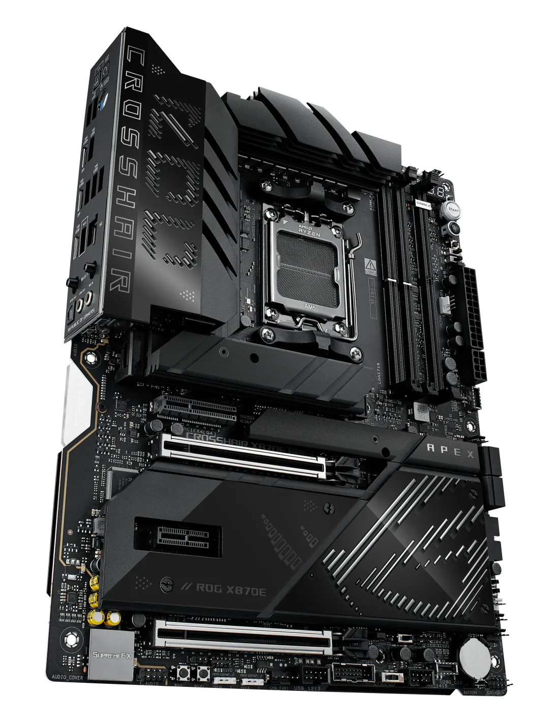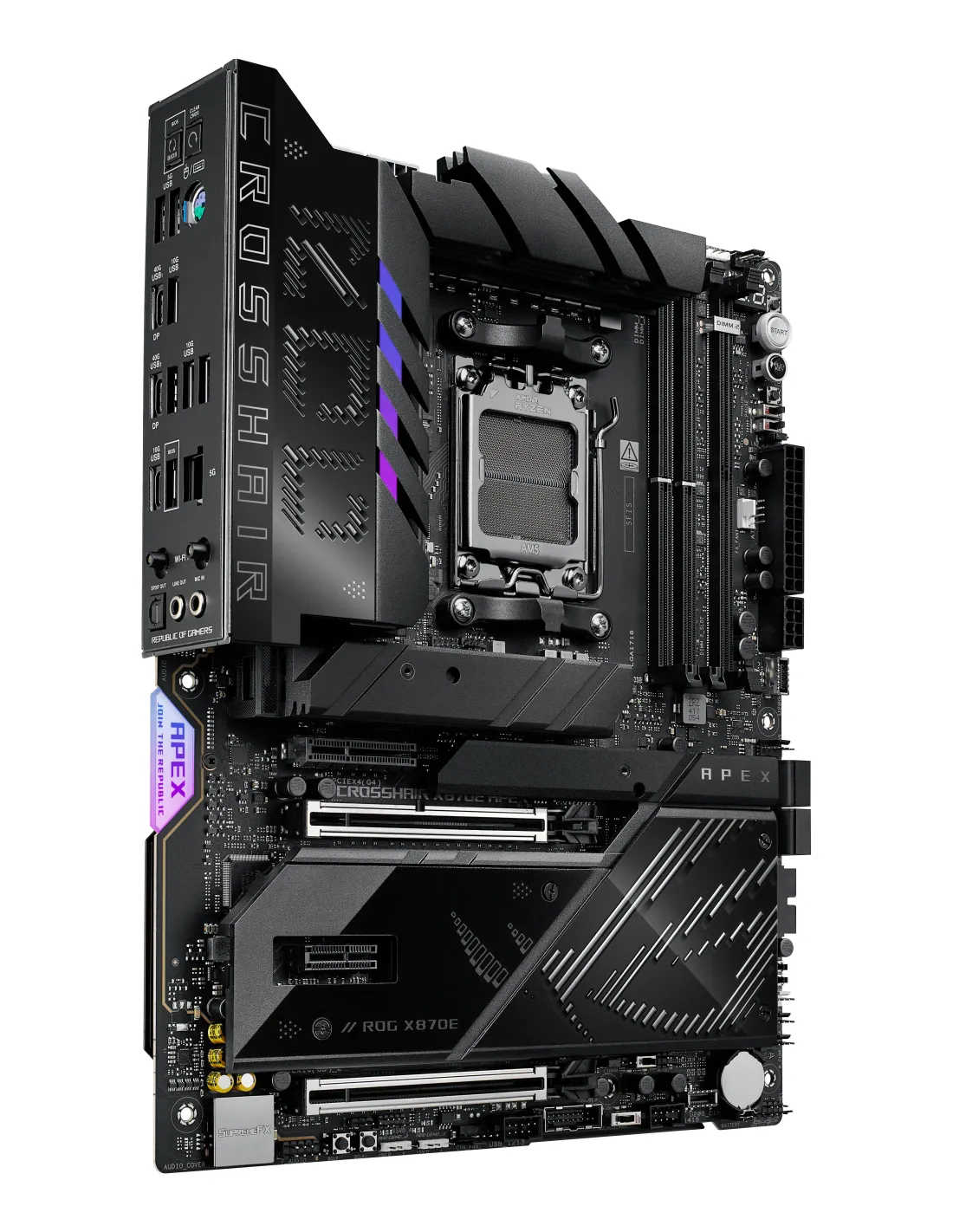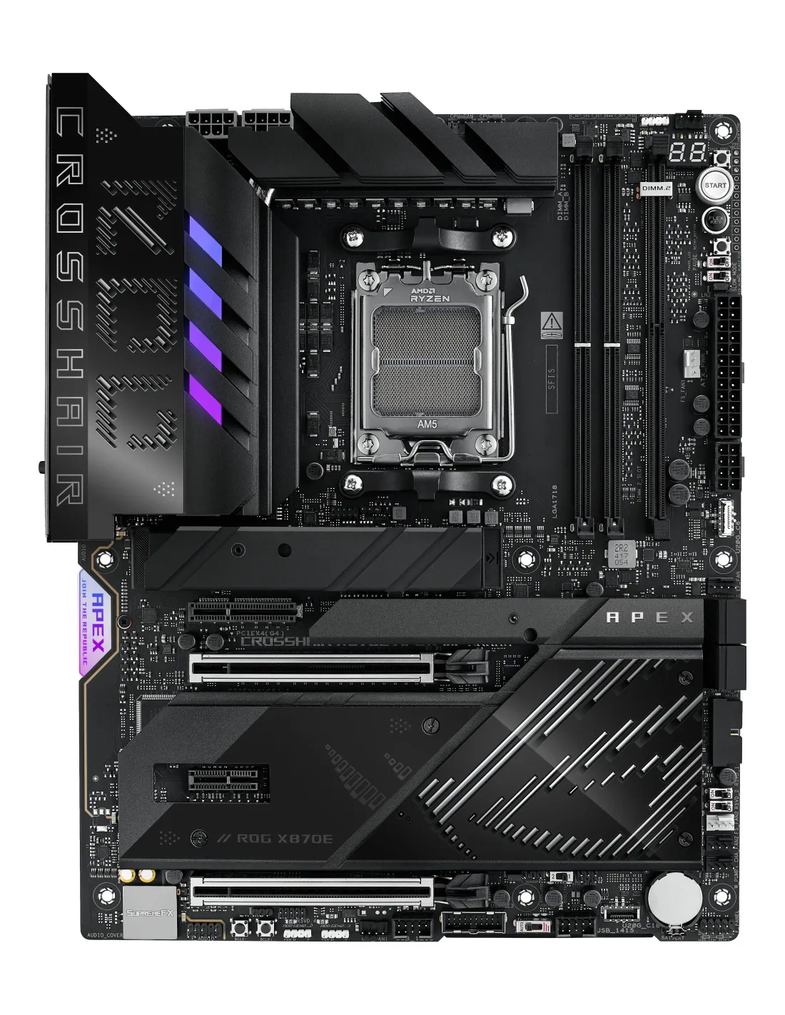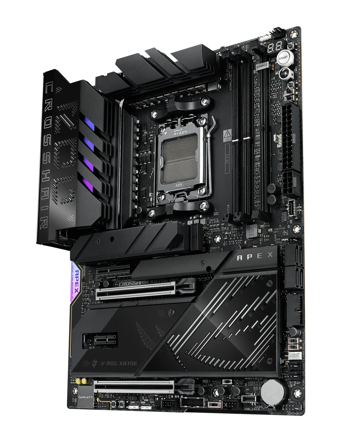 ASUS ROG CROSSHAIR X870E APEX. Fabricante de procesador: AMD, Socket de procesador: Zócalo AM5, Procesador compatible: AMD Ryzen 7000 Series, AMD Ryzen 8000 Series, AMD Ryzen 9000 Series. tipos de memoria compatibles: DDR5-SDRAM, Memoria interna máxima: 128 GB, Tipo de ranuras de memoria: DIMM. Interfaces de disco de almacenamiento soportados: M.2, SATA III, Tipos de unidades de almacenamiento admitidas: HDD & SSD, Niveles RAID: 0, 1, 5, 10. Tipo de interfaz ethernet: 5 Gigabit Ethernet, Estándar Wi-Fi: Wi-Fi 7 (802.11be), Wi-Fi estándares: Wi-Fi 7 (802.11be). Componente para: PC, Factor de forma: ATX, Familia del chipset: AMD