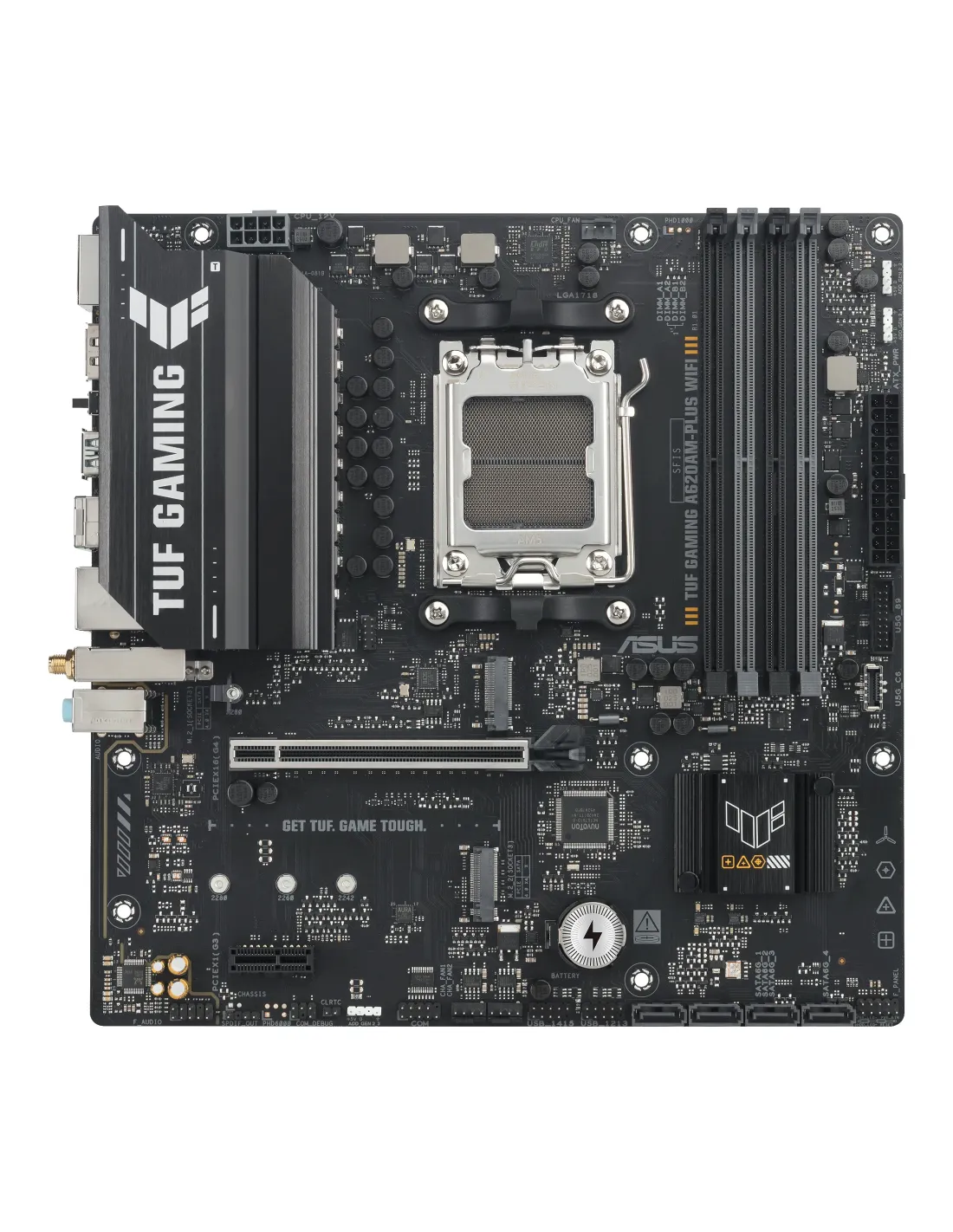 ASUS TUF GAMING A620AM-PLUS WIFI. Fabricante de procesador: AMD, Socket de procesador: Zócalo AM5, Procesador compatible: AMD Ryzen 7000 Series, AMD Ryzen 8000 Series, AMD Ryzen 9000 Series. tipos de memoria compatibles: DDR5-SDRAM, Memoria interna máxima: 256 GB, Tipo de ranuras de memoria: DIMM. Interfaces de disco de almacenamiento soportados: M.2, SATA III, Tipos de unidades de almacenamiento admitidas: HDD & SSD, Niveles RAID: 0, 1, 5, 10. Tipo de interfaz ethernet: 2.5 Gigabit Ethernet, Estándar Wi-Fi: Wi-Fi 6 (802.11ax), Wi-Fi estándares: Wi-Fi 6 (802.11ax). Componente para: PC, Factor de forma: micro ATX, Familia del chipset: AMD