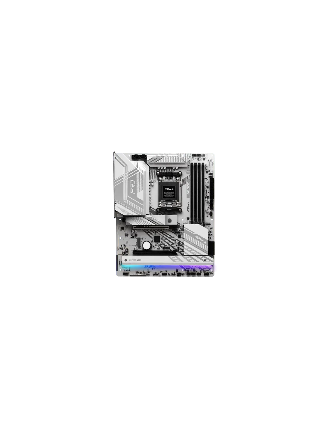 Asrock X870 PRO RS. Fabricante de procesador: AMD, Socket de procesador: Zócalo AM5, Procesador compatible: AMD Ryzen 7000 Series, AMD Ryzen 8000 Series, AMD Ryzen 9000 Series. tipos de memoria compatibles: DDR5-SDRAM, Memoria interna máxima: 256 GB, Tipo de ranuras de memoria: DIMM. Interfaces de disco de almacenamiento soportados: PCI Express 3.0, PCI Express 4.0, PCI Express 5.0, SATA III, Tipos de unidades de almacenamiento admitidas: HDD & SSD, Niveles RAID: 0, 1, 10. Soporte para proceso paralelo: CrossFire, Máxima resolución: 7680 x 4320 Pixeles. Tipo de interfaz ethernet: 2.5 Gigabit Ethernet, Controlador LAN: Dragon RTL8125BG