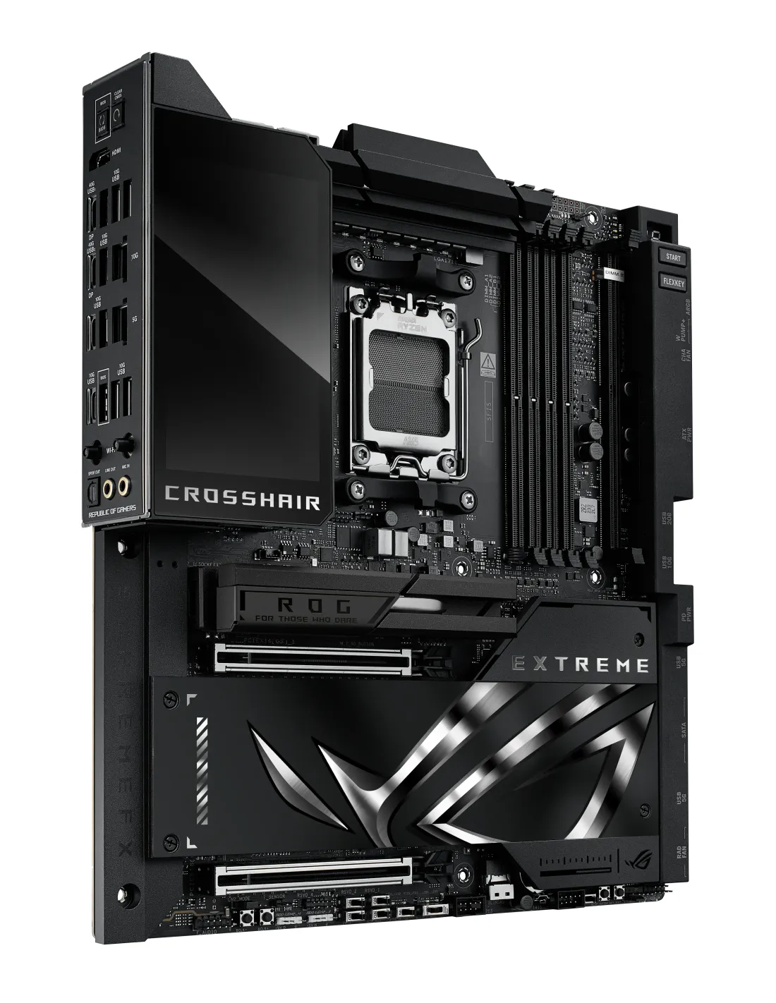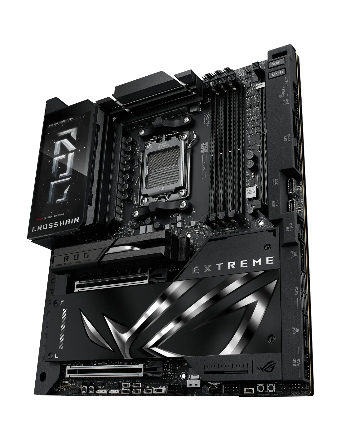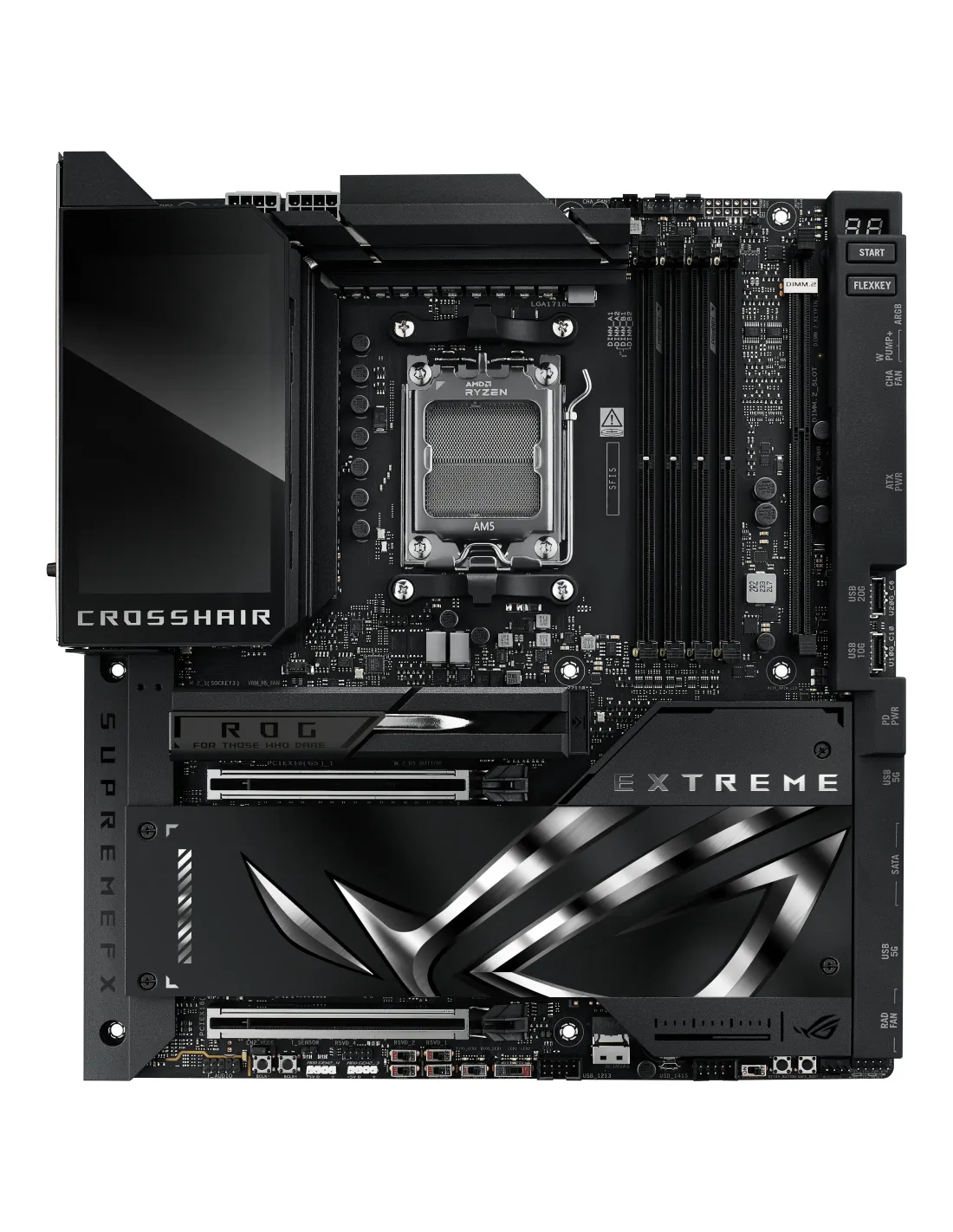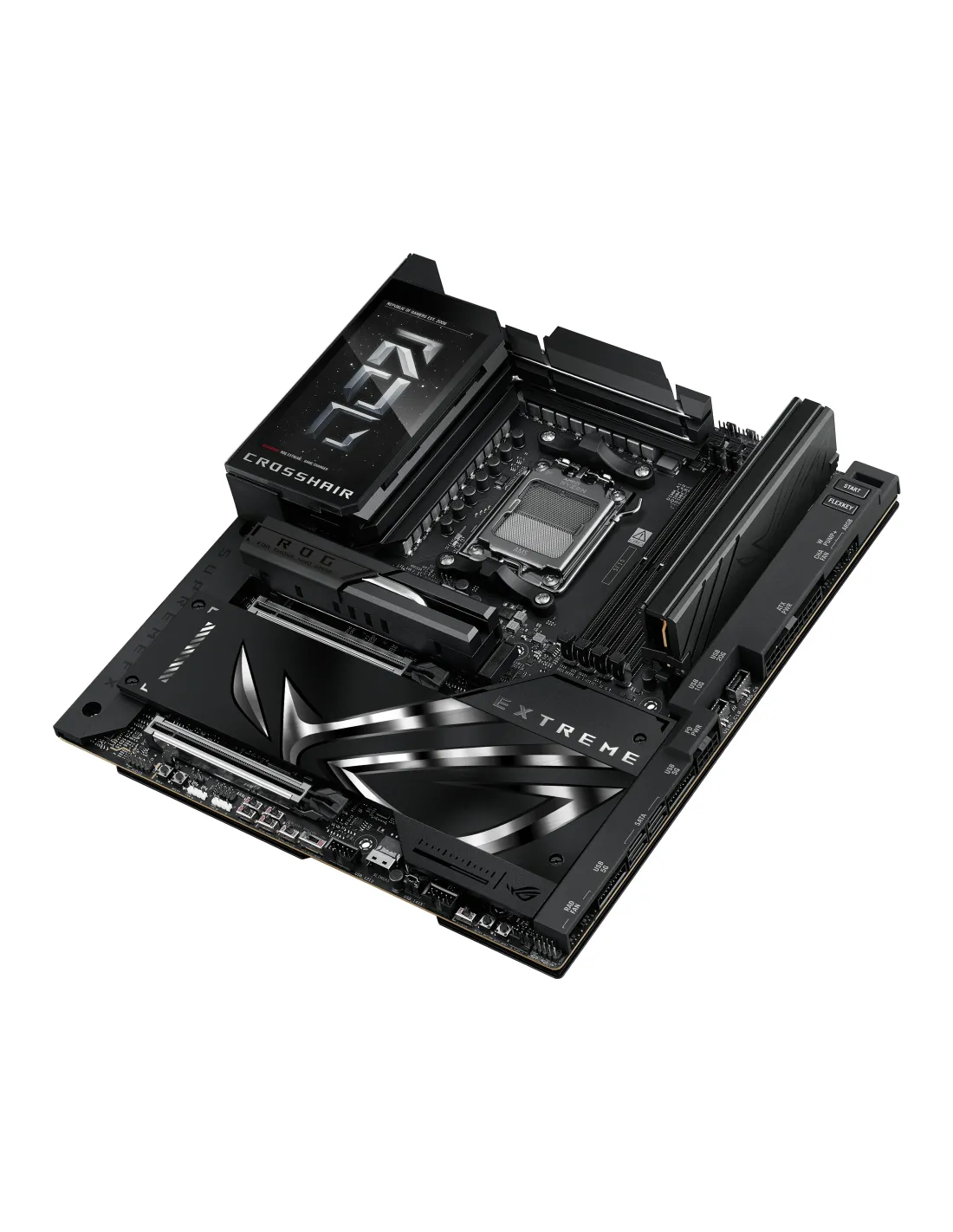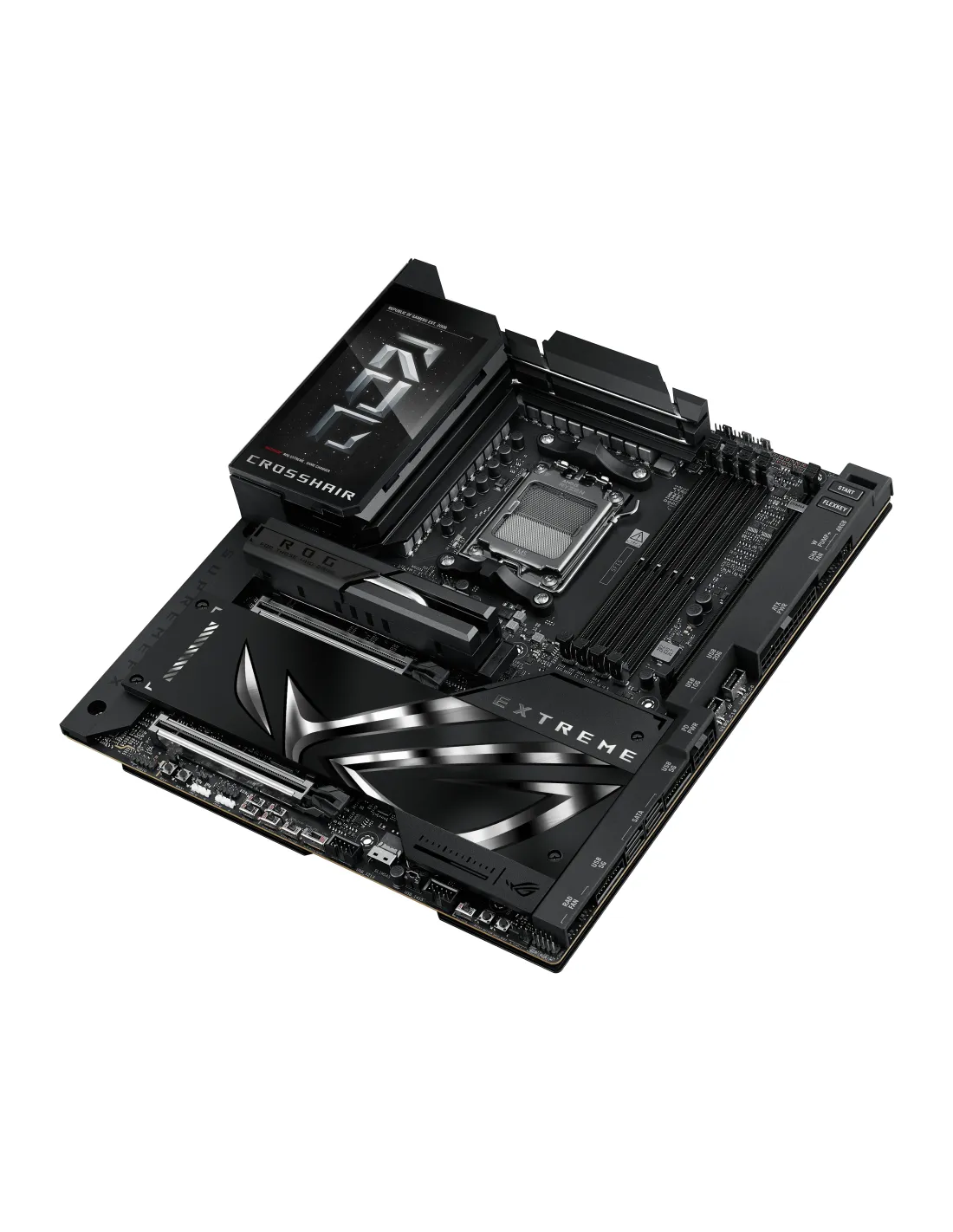 ASUS ROG CROSSHAIR X870E EXTREME. Fabricante de procesador: AMD, Socket de procesador: Zócalo AM5, Procesador compatible: AMD Ryzen 7000 Series, AMD Ryzen 8000 Series, AMD Ryzen 9000 Series. tipos de memoria compatibles: DDR5-SDRAM, Memoria interna máxima: 256 GB, Tipo de ranuras de memoria: DIMM. Interfaces de disco de almacenamiento soportados: M.2, SATA III, SlimSAS, Tipos de unidades de almacenamiento admitidas: HDD & SSD, Niveles RAID: 0, 1, 5, 10. Tipo de interfaz ethernet: 5 Gigabit Ethernet, 10 Gigabit Ethernet, Estándar Wi-Fi: Wi-Fi 7 (802.11be), Wi-Fi estándares: Wi-Fi 7 (802.11be). Componente para: PC, Factor de forma: ATX extendida, Familia del chipset: AMD