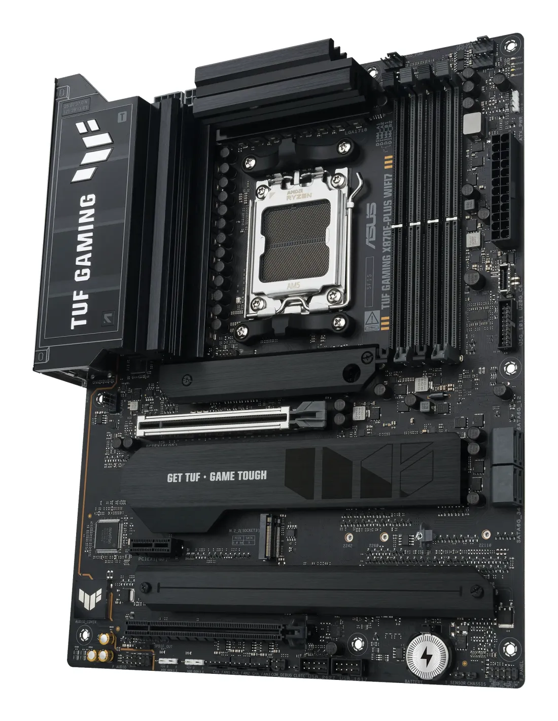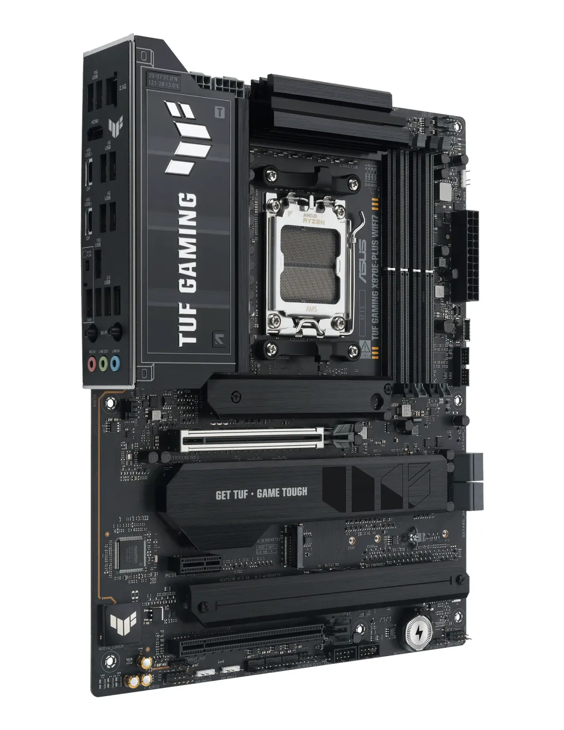 ASUS TUF GAMING X870E-PLUS WIFI7. Fabricante de procesador: AMD, Socket de procesador: Zócalo AM5, Procesador compatible: AMD Ryzen 7000 Series, AMD Ryzen 8000 Series, AMD Ryzen 9000 Series. tipos de memoria compatibles: DDR5-SDRAM, Memoria interna máxima: 256 GB, Tipo de ranuras de memoria: DIMM. Interfaces de disco de almacenamiento soportados: M.2, PCI Express 4.0, PCI Express 5.0, SATA III, Tipos de unidades de almacenamiento admitidas: HDD & SSD, Niveles RAID: 0, 1, 5, 10. Tipo de interfaz ethernet: 2.5 Gigabit Ethernet, Estándar Wi-Fi: Wi-Fi 7 (802.11be), Wi-Fi estándares: Wi-Fi 7 (802.11be). Componente para: PC, Factor de forma: ATX, Familia del chipset: AMD