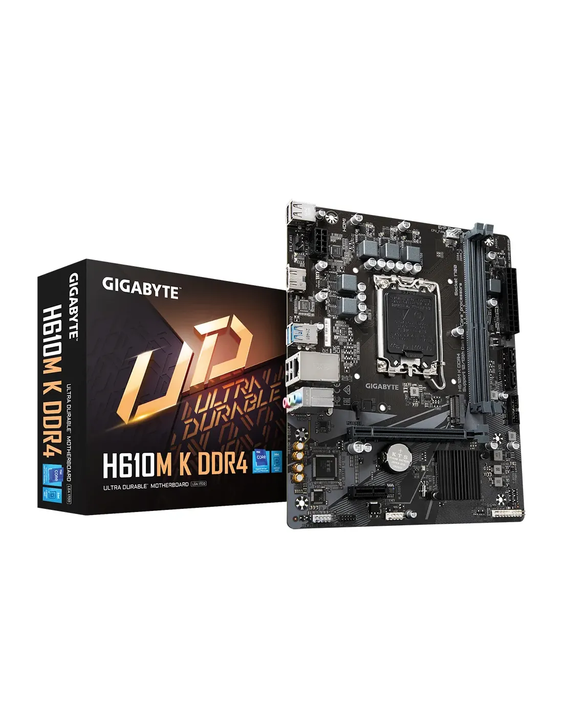 Gigabyte H610M K DDR4 1.0. Fabricante de procesador: Intel, Socket de procesador: LGA 1700, Procesador compatible: Intel® Celeron®, Intel® Core™ i3, Intel® Core™ i7, Intel® Core™ i9, Intel® Pentium® Gold. tipos de memoria compatibles: DDR4-SDRAM, Memoria interna máxima: 64 GB, Tipo de ranuras de memoria: DIMM. Interfaces de disco de almacenamiento soportados: M.2, PCI Express 3.0, SATA. Graphics chipset: Intel, Adaptador gráfico: HD Graphics, Máxima resolución: 4096 x 2160 Pixeles. Tipo de interfaz ethernet: Gigabit Ethernet