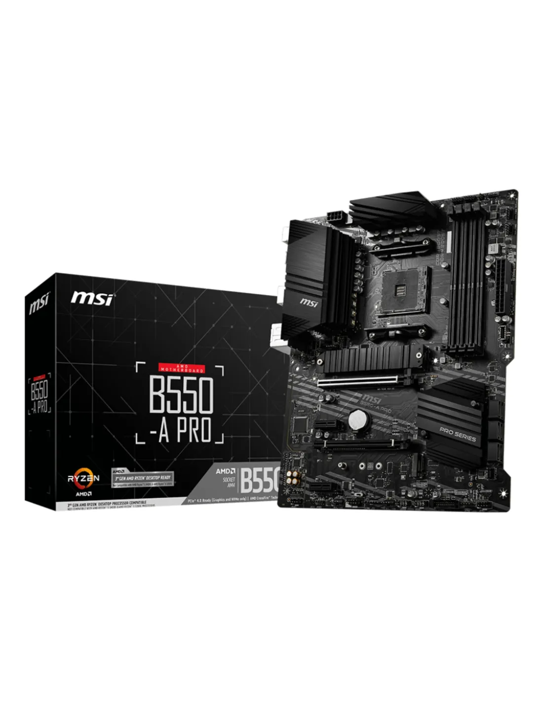 MSI B550-A PRO. Fabricante de procesador: AMD, Socket de procesador: Zócalo AM4, Procesador compatible: AMD Ryzen 3 3rd Gen, 3rd Generation AMD Ryzen 5, 3rd Generation AMD Ryzen 7, 3rd Generation AMD.... tipos de memoria compatibles: DDR4-SDRAM, Tipo de ranuras de memoria: DIMM, Velocidades de reloj de memoria soportadas: 1866,2133,2400,2667,2800,2933,3000,3066,3200,3466,3600,3733,3866,4000,4133,4266,4400,4800 MHz. Interfaces de disco de almacenamiento soportados: Serial ATA III, Tipos de unidades de almacenamiento admitidas: HDD & SSD. Soporte para proceso paralelo: 2-Way CrossFireX, Memoria máxima de adaptador de gráficos: 16000 MB, Máxima resolución: 4096 x 2160 Pixeles. Tipo de interfaz ethernet: Gigabit Ethernet, Controlador LAN: Realtek 8111H