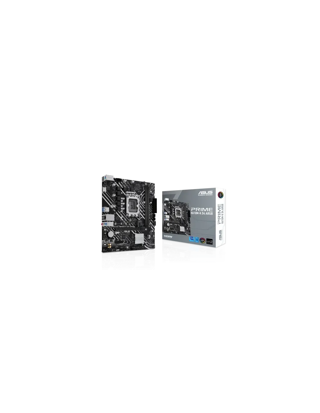 ASUS PRIME H610M-K D4 ARGB. Fabricante de procesador: Intel, Socket de procesador: LGA 1700, Procesador compatible: Intel® Celeron®, Intel® Pentium® Gold, Intel® Core™ i3, Intel® Core™ i5, Intel® Core™.... tipos de memoria compatibles: DDR4-SDRAM, Memoria interna máxima: 64 GB, Tipo de ranuras de memoria: DIMM. Interfaces de disco de almacenamiento soportados: M.2, SATA III, Tipos de unidades de almacenamiento admitidas: HDD & SSD. Tipo de interfaz ethernet: Gigabit Ethernet. Componente para: PC, Factor de forma: micro ATX, Familia del chipset: Intel