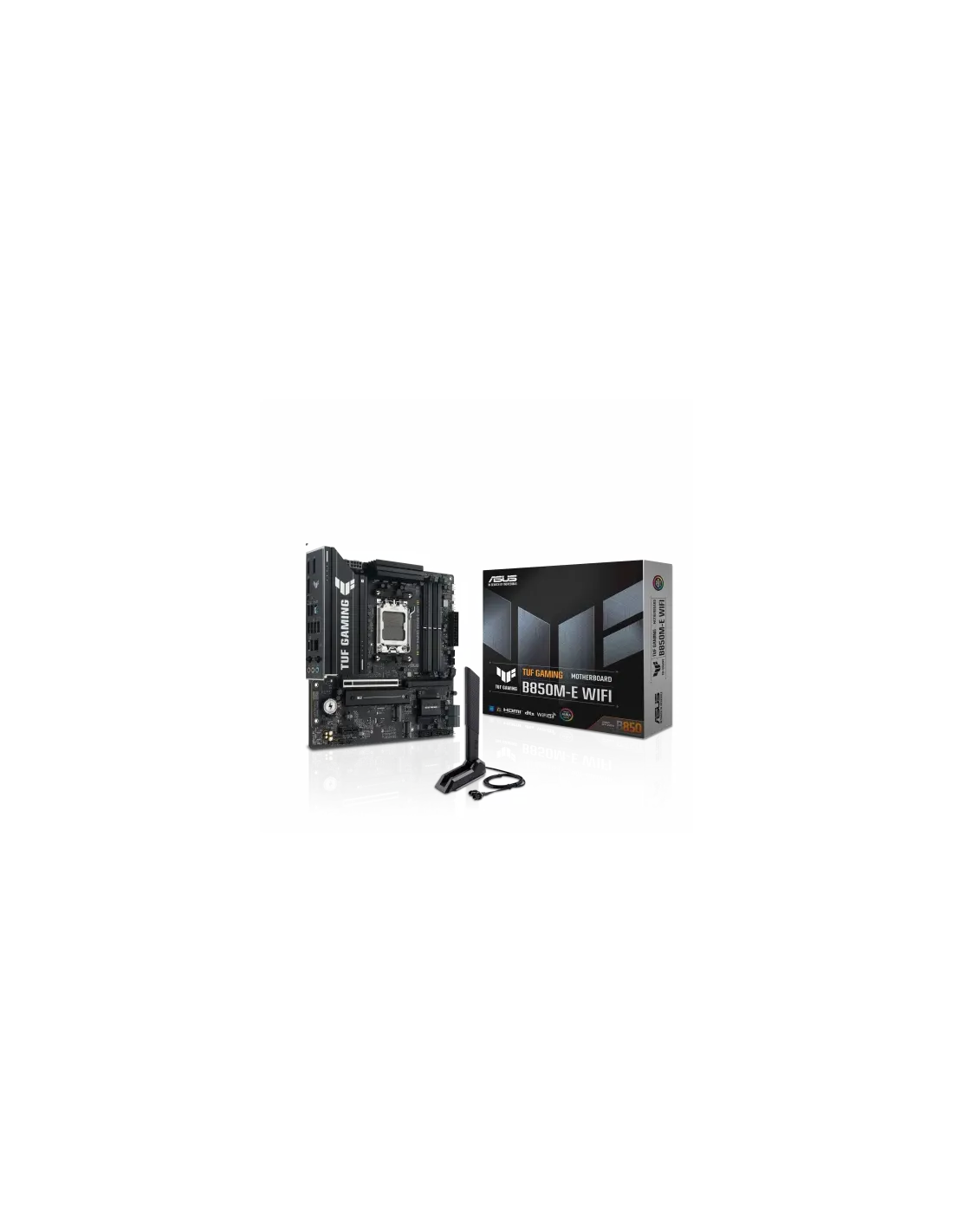 ASUS TUF GAMING B850M-E WIFI. Fabricante de procesador: AMD, Socket de procesador: Zócalo AM5, Procesador compatible: AMD Ryzen 7000 Series, AMD Ryzen 8000 Series, AMD Ryzen 9000 Series. tipos de memoria compatibles: DDR5-SDRAM, Memoria interna máxima: 256 GB, Tipo de ranuras de memoria: DIMM. Interfaces de disco de almacenamiento soportados: M.2, PCI Express 4.0, PCI Express 5.0, SATA III, Tipos de unidades de almacenamiento admitidas: HDD & SSD, Niveles RAID: 0, 1, 5, 10. Tipo de interfaz ethernet: 2.5 Gigabit Ethernet, Estándar Wi-Fi: Wi-Fi 6E (802.11ax), Wi-Fi estándares: Wi-Fi 6E (802.11ax). Componente para: PC, Factor de forma: micro ATX, Familia del chipset: AMD