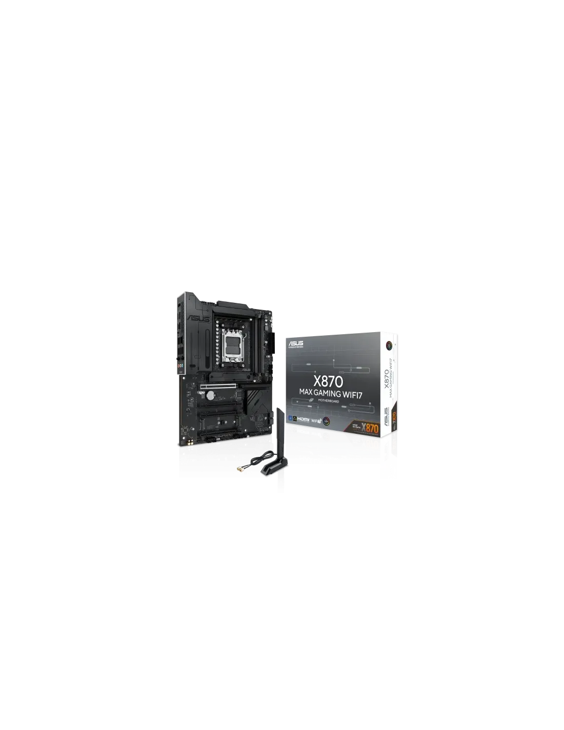 ASUS X870 MAX GAMING WIFI7. Fabricante de procesador: AMD, Socket de procesador: Zócalo AM5, Procesador compatible: AMD Ryzen 7000 Series, AMD Ryzen 8000 Series, AMD Ryzen 9000 Series. tipos de memoria compatibles: DDR5-SDRAM, Memoria interna máxima: 256 GB, Tipo de ranuras de memoria: DIMM. Interfaces de disco de almacenamiento soportados: M.2, SATA III, Tipos de unidades de almacenamiento admitidas: HDD & SSD, Niveles RAID: 0, 1, 5, 10. Conector USB: USB tipo A, USB Tipo C. Tipo de interfaz ethernet: 2.5 Gigabit Ethernet, Estándar Wi-Fi: Wi-Fi 7 (802.11be)