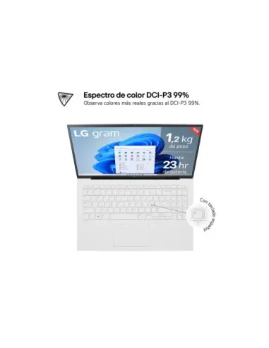 Lg gram de 15 pulgadas laptop. Ultraligero, con tan solo 1,2kg de peso, nueva batería de hasta 23 horas de autonomía* y un grosor de 16,9mm. Windows 11 Home. Pantalla IPS (1920x1080) (WQXGA) con tratamiento antirreflejos de 39,6cm (15") en formato 16:9, con un amplio rango de color DCI-P3 99%.Chasis de aluminio de gran resistencia superando 7 pruebas del estándar militar STD-MIL-810H.Procesador Intel® Core™ Ultra 7, con memoria RAM ultrarrápida LPDDR5x de 16GB integrada en placa y disco duro SSD de 512GB NVMe de 4ª Generación con doble ranura ampliable. Gráfica Intel® Arc™ para trabajar con contenido 4K UHD con la máxima fluidez .Alta conectividad con 6 puertos (2 x USB 3.2, USB Tipo C con Thunderbolt 4 integrado para carga ultrarrápida, USB 3.2 Tipo C compatible con DisplayPort1.4, HDMI 2.1.)