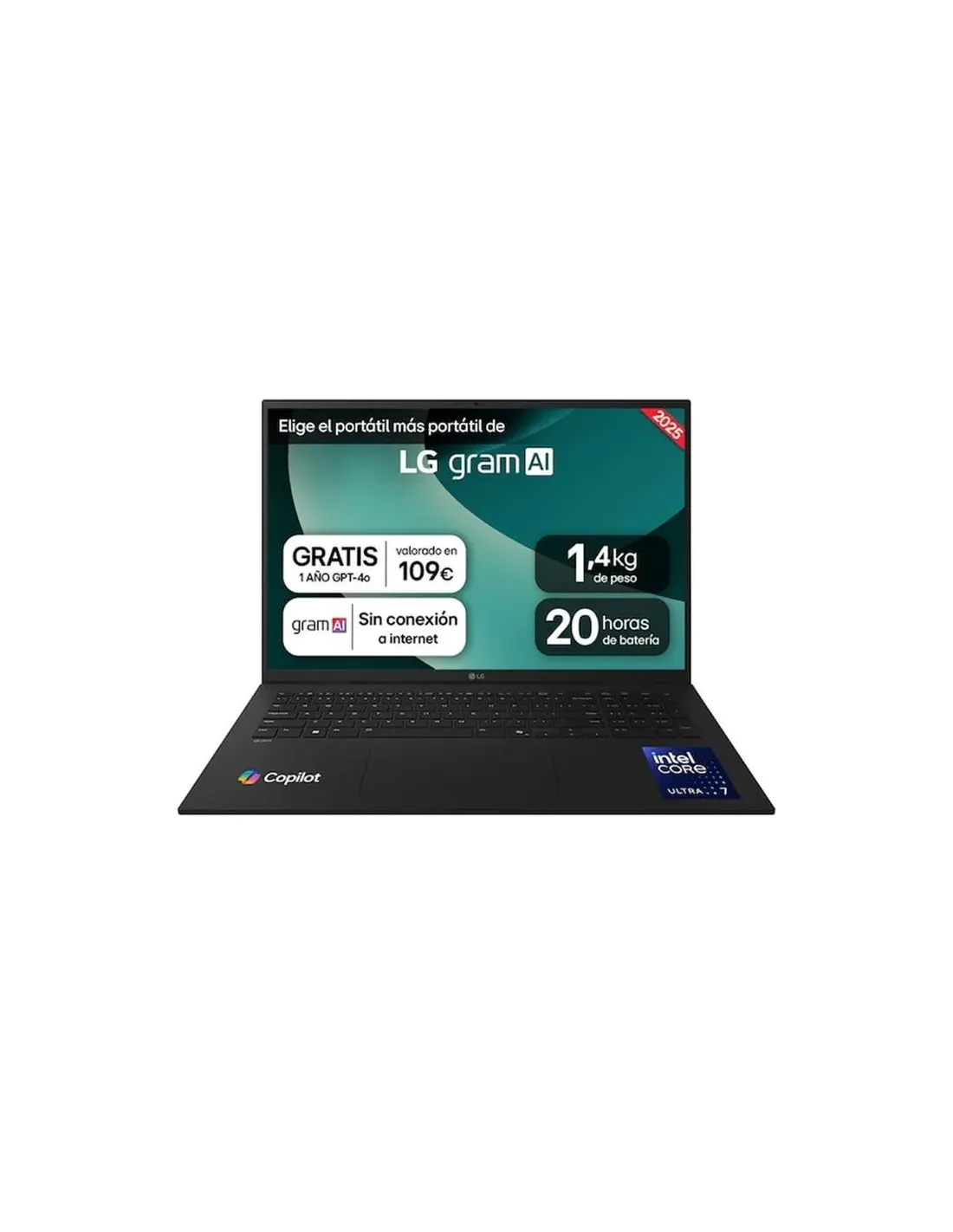 Características del Portátil LG gram 17ZD90T-G.AX88BEl LG gram 17" 17ZD90T es un portátil de alta gama diseñado para quienes buscan un equipo ultraligero, potente y preparado para el futuro. Su procesador Intel® Core? Ultra 7 de última generación, junto con sus 32 GB de RAM LPDDR5X y 1 TB SSD NVMe Gen4, ofrecen un rendimiento excepcional tanto para tareas creativas, como edición multimedia, diseño o programación, como para productividad avanzada. Todo esto en un chasis resistente, con apenas 1,35 kg de peso y hasta 20 horas de autonomía.Pantalla IPS WQXGA de 17" con gran fidelidad de colorDisfruta de una experiencia visual envolvente gracias a su panel IPS de 17 pulgadas con resolución WQXGA (2560x1600) y formato 16:10, ideal para el trabajo multitarea. Su cobertura del 99% del espacio DCI-P3 garantiza colores vivos y precisos, mientras que el brillo de 350 nits proporciona buena visibilidad incluso en entornos luminosos.Resolución: WQXGA (2560x1600)Brillo: 350 nitsCobertura de color: DCI-P3 99%Rendimiento de nueva generación con Intel® Core? Ultra 7Equipado con el procesador Intel® Core? Ultra 7 255H de arquitectura híbrida (16 núcleos), este portátil ofrece un excelente equilibrio entre eficiencia y potencia. Acompañado de 32 GB de RAM LPDDR5X de alta frecuencia y un SSD de 1 TB NVMe Gen4, permite un trabajo fluido incluso con aplicaciones exigentes.Procesador: Intel® Core? Ultra 7 255H (16C, 24MB Cache)Memoria: 32 GB LPDDR5X, 7467 MHzAlmacenamiento: 1 TB SSD M.2 NVMe Gen4Gráficos integrados Intel® Arc? y conectividad de última generaciónEl LG gram 17 incorpora gráficos integrados Intel® Arc? capaces de gestionar tareas gráficas exigentes y ofrecer soporte para múltiples pantallas 4K. Además, cuenta con Wi-Fi 7, Bluetooth 5.3 y una selección de puertos muy completa, incluyendo 2 USB-C con Thunderbolt 4, HDMI 2.1 y más.Gráficos: Intel® Arc? integradosRed inalámbrica: Wi-Fi 7 + Bluetooth 5.3Puertos: 2x USB 4 (Thunderbolt 4), 2x USB-A 3.2, HDMI 2.1, jack 3.5 mmDiseño ultraligero y duradero, con autonomía para todo el díaSu chasis de nano carbono y magnesio combina ligereza y resistencia, cumpliendo con el estándar militar de durabilidad STD-MIL 810H. Todo ello con un peso de solo 1,35 kg y una batería de 77 Wh que puede alcanzar hasta 20 horas de uso en condiciones ideales.Peso: 1,35 kgDimensiones: 378,8 x 258,8 x 16 mmBatería: 4 celdas, 77 Wh, hasta 20 horasFunciones adicionales y seguridad avanzadaIncluye teclado retroiluminado con teclado numérico, sensor de huellas integrado en el botón de encendido, sonido Dolby Atmos con altavoces de 5W y cámara FHD con doble micrófono. También incorpora herramientas de productividad como LG Glance, Intel Unison y LG UltraGear Studio.Teclado completo retroiluminado con númeroBotón de encendido con lector de huellasCámara FHD + doble micrófonoSonido Dolby Atmos con altavoces de 2x2W (5W máx.)Otras especificacionesSistema operativo: Free OS (sin sistema preinstalado)Material: Chasis de nano carbono y magnesioAdaptador: 65W USB-C (incluido)Seguridad: fTPM, bloqueo Kensington, cifrado SSDSoftware incluido: LG Smart Assistant, Dolby Atmos, Intel Unison, McAfee y Microsoft 365 (30 días)