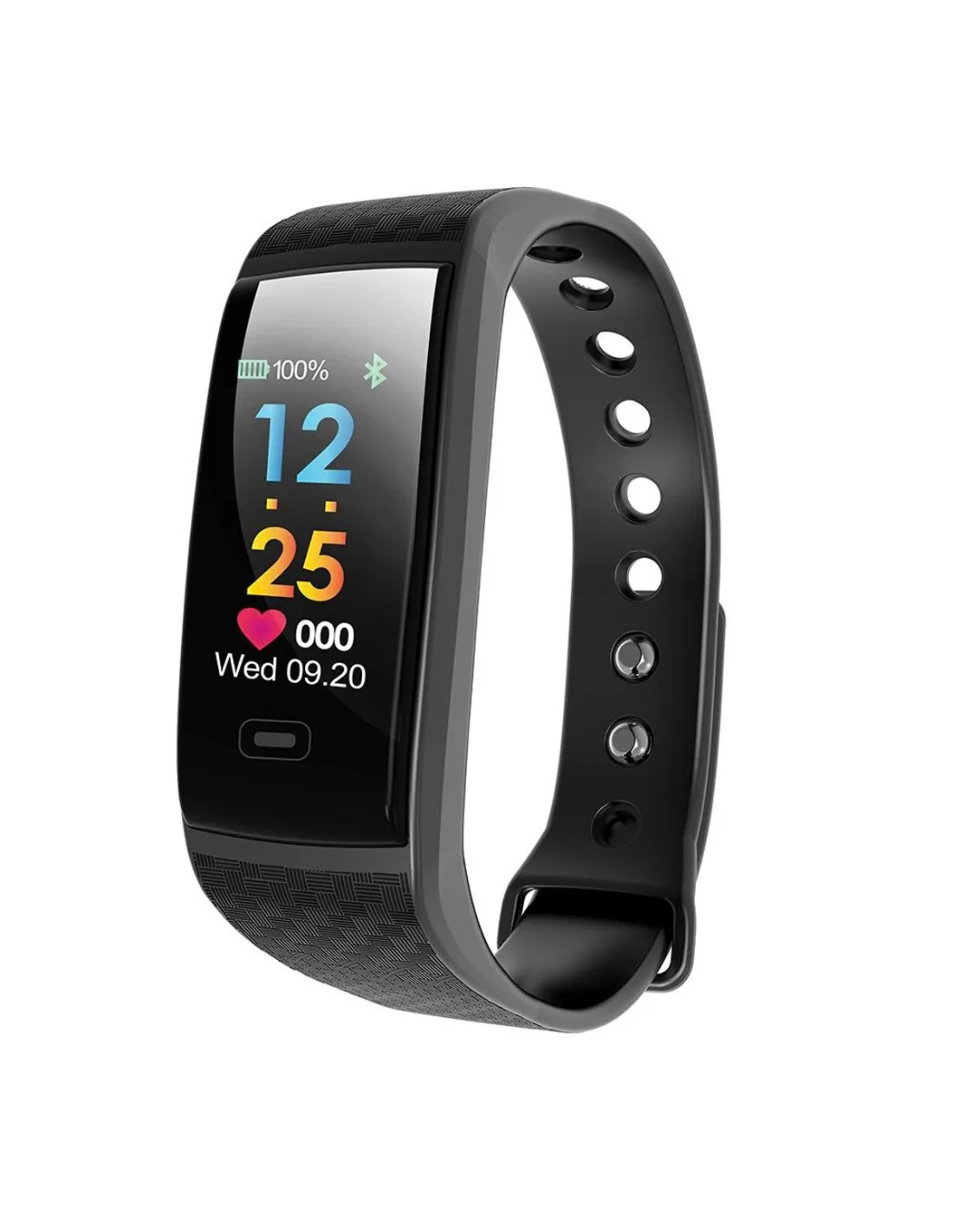 Pulsera inteligente de actividad y sueño Health Tensio de muvit iO, con pantalla a color y correas en color negro.