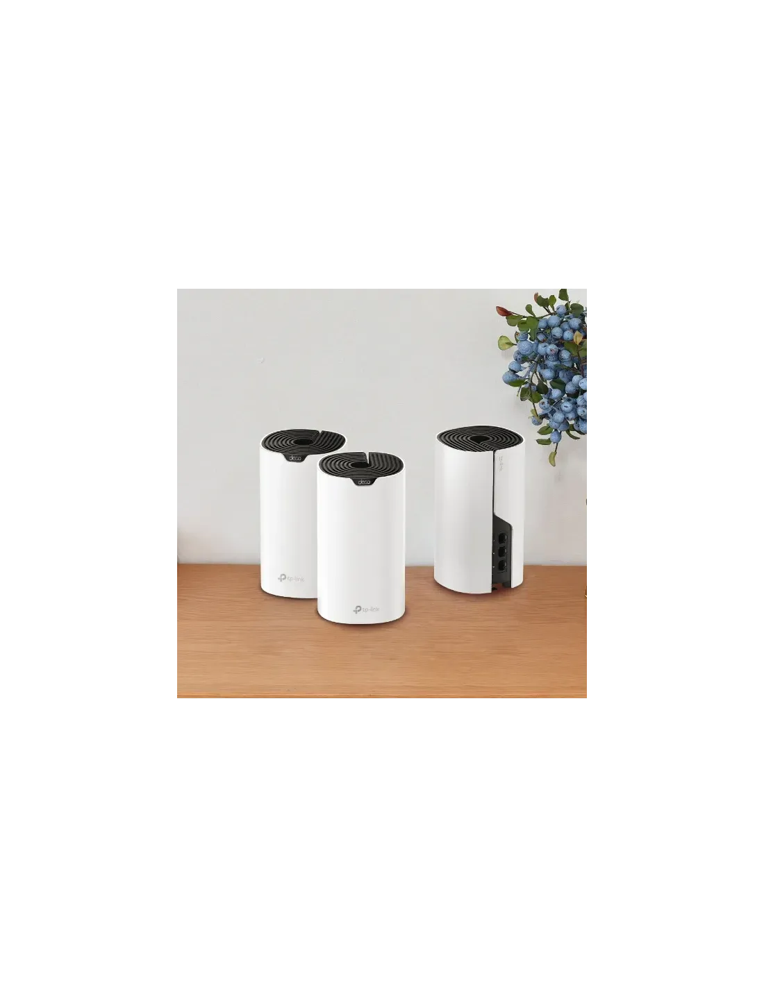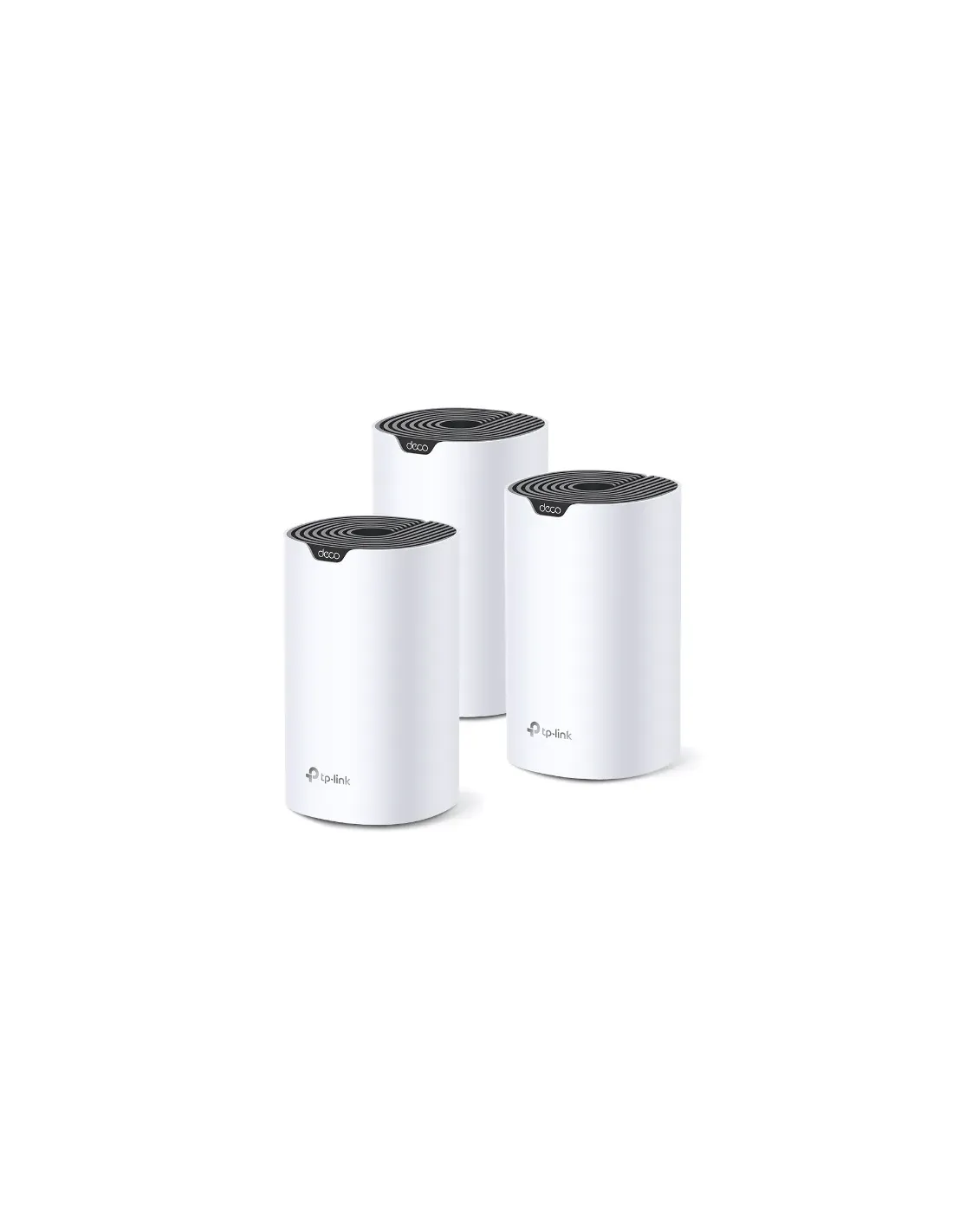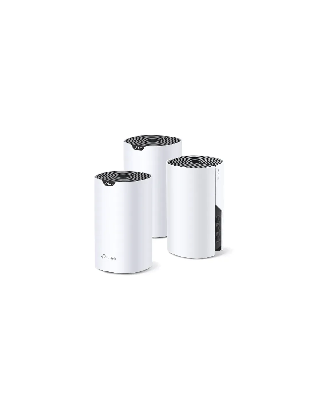 TP-Link Deco S7 (3-pack). Color del producto: Blanco, Negro, Tipo de antena: Interno, Tipo de producto: Sistema de malla. Banda Wi-Fi: Doble banda (2,4 GHz / 5 GHz), Estándar Wi-Fi: Wi-Fi 5 (802.11ac), Wi-Fi estándares: 802.11a, 802.11b, 802.11g, Wi-Fi 4 (802.11n), Wi-Fi 5 (802.11ac). Frecuencia del procesador: 1,2 GHz, Sistemas operativos móviles soportados: Android, iOS. Ancho: 90,7 mm, Profundidad: 90,7 mm, Altura: 162,3 mm. Número de productos incluidos: 3 pieza(s), Número de adaptadores incluidos: 3 pieza(s)