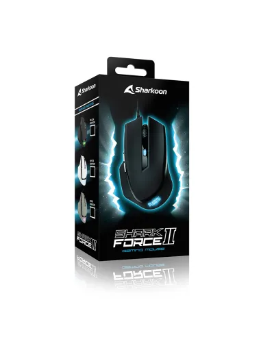 Sharkoon SHARK Force II. Factor de forma: mano derecha. Tecnología de detección de movimientos: Óptico, Interfaz del dispositivo: USB tipo A, Resolución de movimiento: 4200 DPI, Tipo de botones: Botones presionados, Cantidad de botones: 6, Tipo de desplazamiento: Rueda, Aceleración (máx.): 10 G. Fuente de energía: Cable. Color del producto: Negro