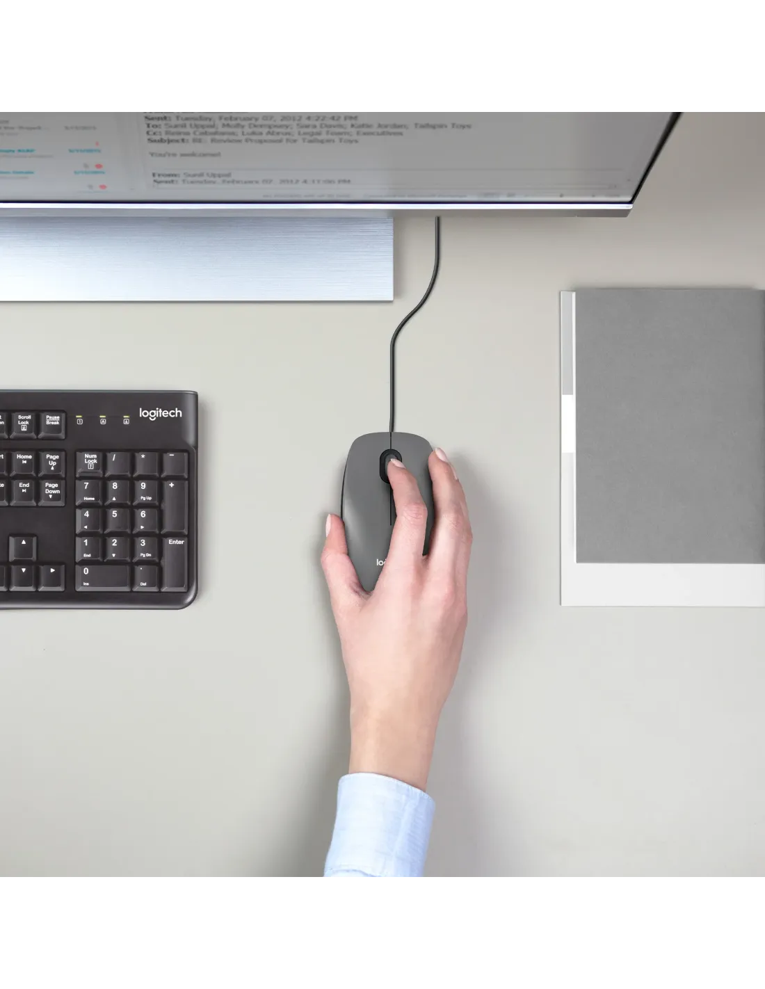 Logitech M100. Factor de forma: Ambidextro. Tecnología de detección de movimientos: Óptico, Interfaz del dispositivo: USB tipo A, Resolución de movimiento: 1000 DPI, Tipo de botones: Botones presionados, Cantidad de botones: 3, Tipo de desplazamiento: Rueda. Fuente de energía: Cable. Color del producto: Negro