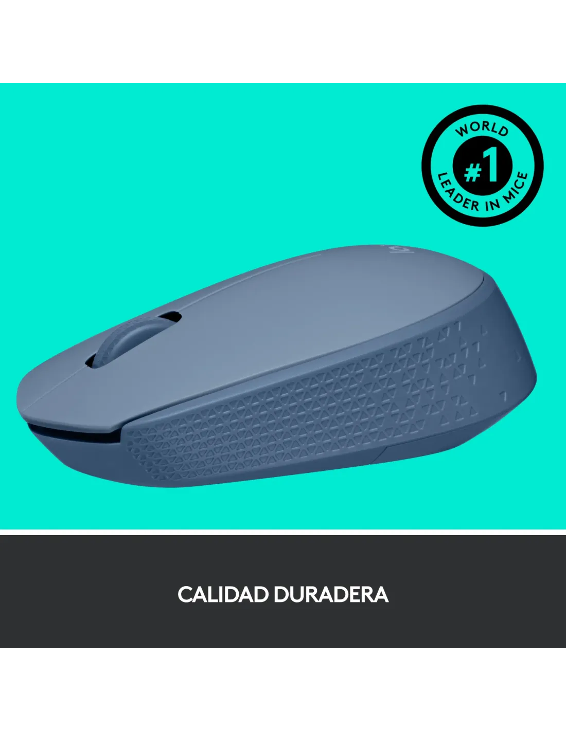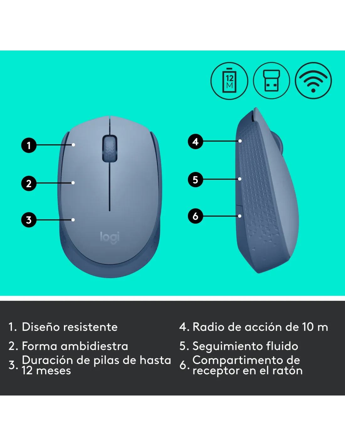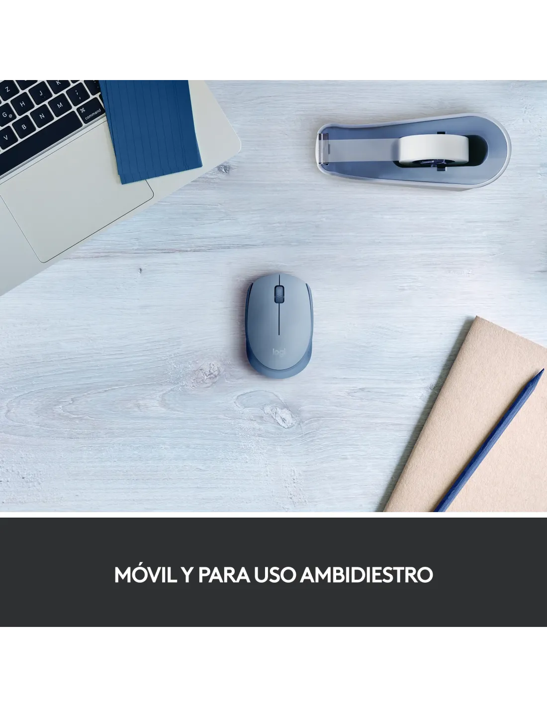 Características del Ratón Inalámbrico Logitech M171 Gris AzuladoEl Logitech M171 es un ratón inalámbrico compacto, fiable y cómodo, ideal para el uso diario en casa, la oficina o en desplazamientos. Gracias a su conexión por receptor USB y su diseño ambidiestro, es una opción funcional para quienes buscan una experiencia sin cables y sin complicaciones, compatible con múltiples sistemas operativos.Conexión inalámbrica rápida y estableEste modelo utiliza una conexión inalámbrica de 2,4 GHz, lo que garantiza una transmisión rápida y sin interrupciones hasta una distancia de 10 metros. El pequeño receptor USB se conecta de forma inmediata sin necesidad de instalar drivers adicionales.Conexión inalámbrica de 2,4 GHzAlcance de hasta 10 mIncluye nano receptor USB de 2,0 gAutonomía prolongada y eficiencia energéticaCon una sola pila AA, el Logitech M171 ofrece una autonomía de hasta 1 año, dependiendo del uso. Es un dispositivo eficiente y de bajo consumo energético, ideal para quienes buscan practicidad sin preocuparse por recargas constantes.Funciona con 1 pila AA (incluida)Duración estimada: 12 mesesModo de reposo automático para ahorrar energíaDiseño compacto, ergonómico y ambidiestroEl M171 presenta un diseño que se adapta cómodamente tanto a usuarios diestros como zurdos. Su formato ligero y dimensiones reducidas lo hacen ideal para espacios de trabajo limitados o para llevarlo contigo en cualquier mochila o maletín.Dimensiones: 97,7 x 61,5 x 35,2 mmPeso con pila: 70,5 gDiseño simétrico apto para ambas manosAmplia compatibilidad y uso inmediatoEste ratón es compatible con Windows, macOS, Chrome OS y Linux, y solo requiere un puerto USB libre para funcionar. Es un periférico tipo "plug and play", que no necesita instalación de software para su funcionamiento básico.Compatible con Windows 7, 8, 10 o posteriorCompatible con macOS X 10.8 o posteriorCompatible con Chrome OS y Linux kernel 2.6+Contenido del paqueteRatón inalámbrico Logitech M171Nano receptor USBDocumentación del usuarioSoftware opcional descargable (Logitech Options)Otras especificacionesDimensiones del receptor: 6,6 x 14,4 x 18,7 mmPeso del receptor: 2,0 g