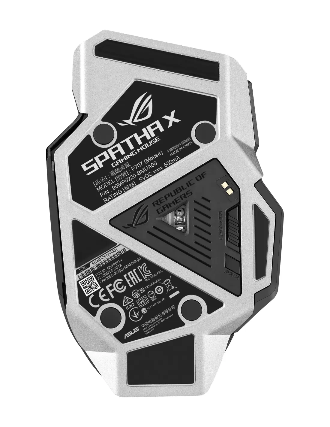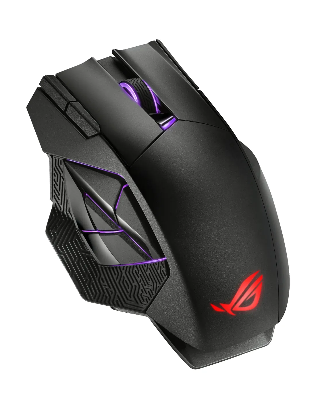 ASUS ROG Spatha X. Factor de forma: mano derecha. Tecnología de detección de movimientos: Óptico, Interfaz del dispositivo: RF Wireless+USB Type-A, Resolución de movimiento: 19000 DPI, Tipo de botones: Botones presionados, Cantidad de botones: 12, Tipo de desplazamiento: Rueda, Aceleración (máx.): 50 G. Iluminación de color: Multi. Fuente de energía: Baterías. Color del producto: Negro