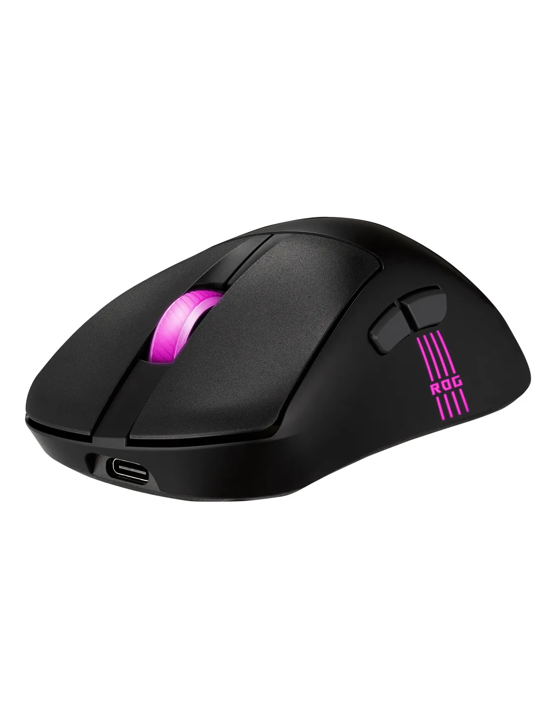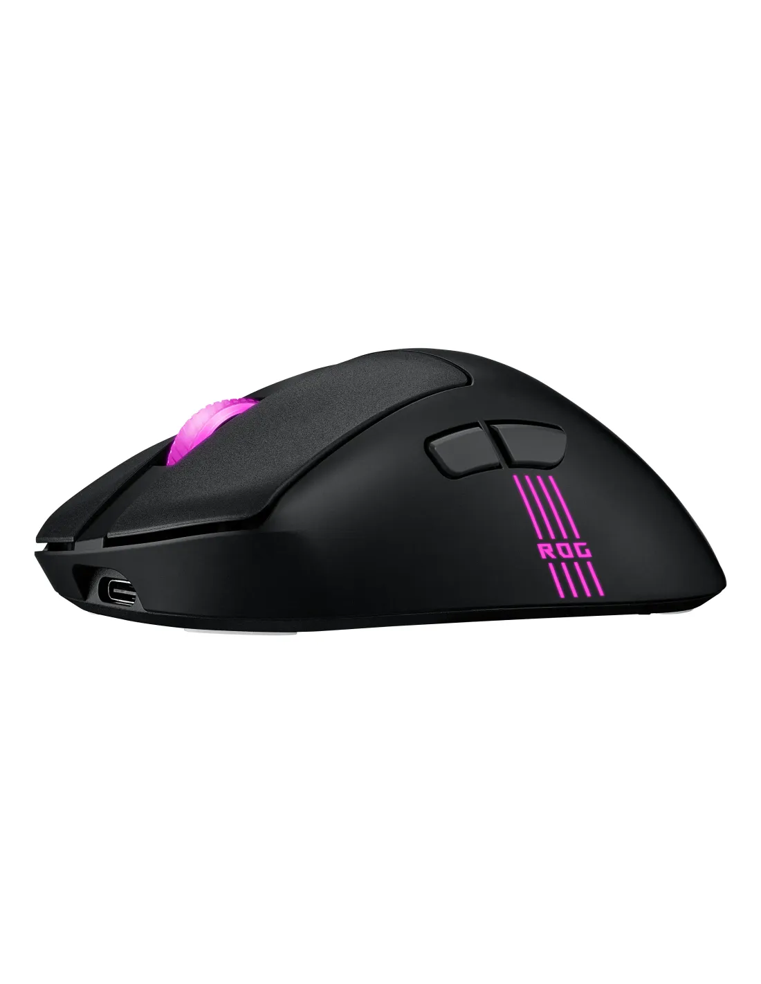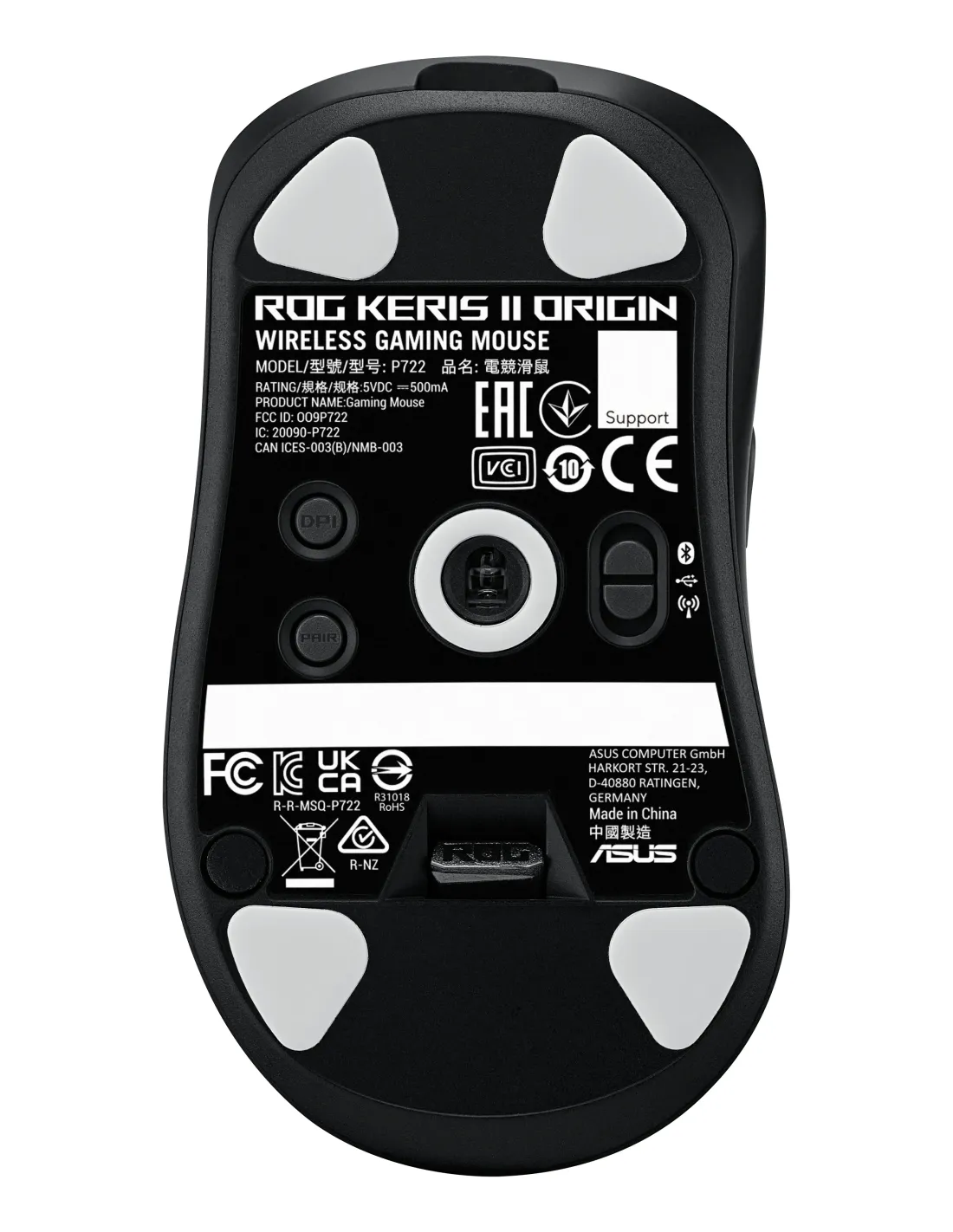 ASUS ROG Keris II Origin BLK. Factor de forma: mano derecha. Tecnología de detección de movimientos: Óptico, Interfaz del dispositivo: RF Wireless + Bluetooth + USB Type-A, Resolución de movimiento: 42000 DPI, Tipo de botones: Botones presionados, Cantidad de botones: 6, Tipo de desplazamiento: Rueda. Iluminación de color: Multi. Fuente de energía: Baterías/Cable. Color del producto: Negro