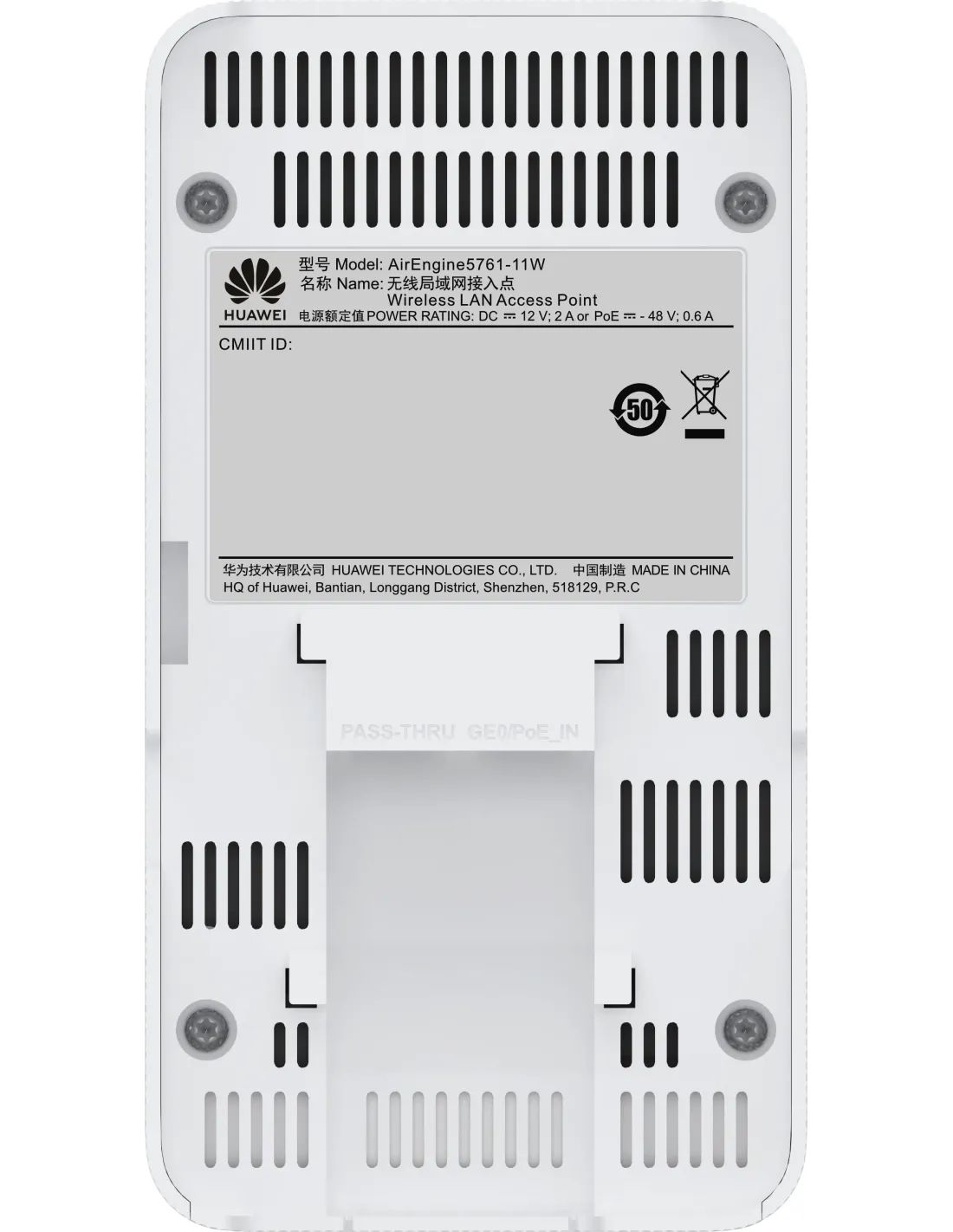 Huawei AirEngine 5761-11W. 2,4 GHz, 5 GHz, Rango máximo de transferencia de datos: 1775 Mbit/s. Algoritmos de seguridad soportados: 64-bit WEP, 128-bit WEP, 152-bit WEP, WPA2-PSK, WPA3-SAE. Ethernet LAN, velocidad de transferencia de datos: 10,100,1000 Mbit/s. Energía sobre Ethernet (PoE). Color del producto: Blanco. Consumo de energía (max): 12,7 W