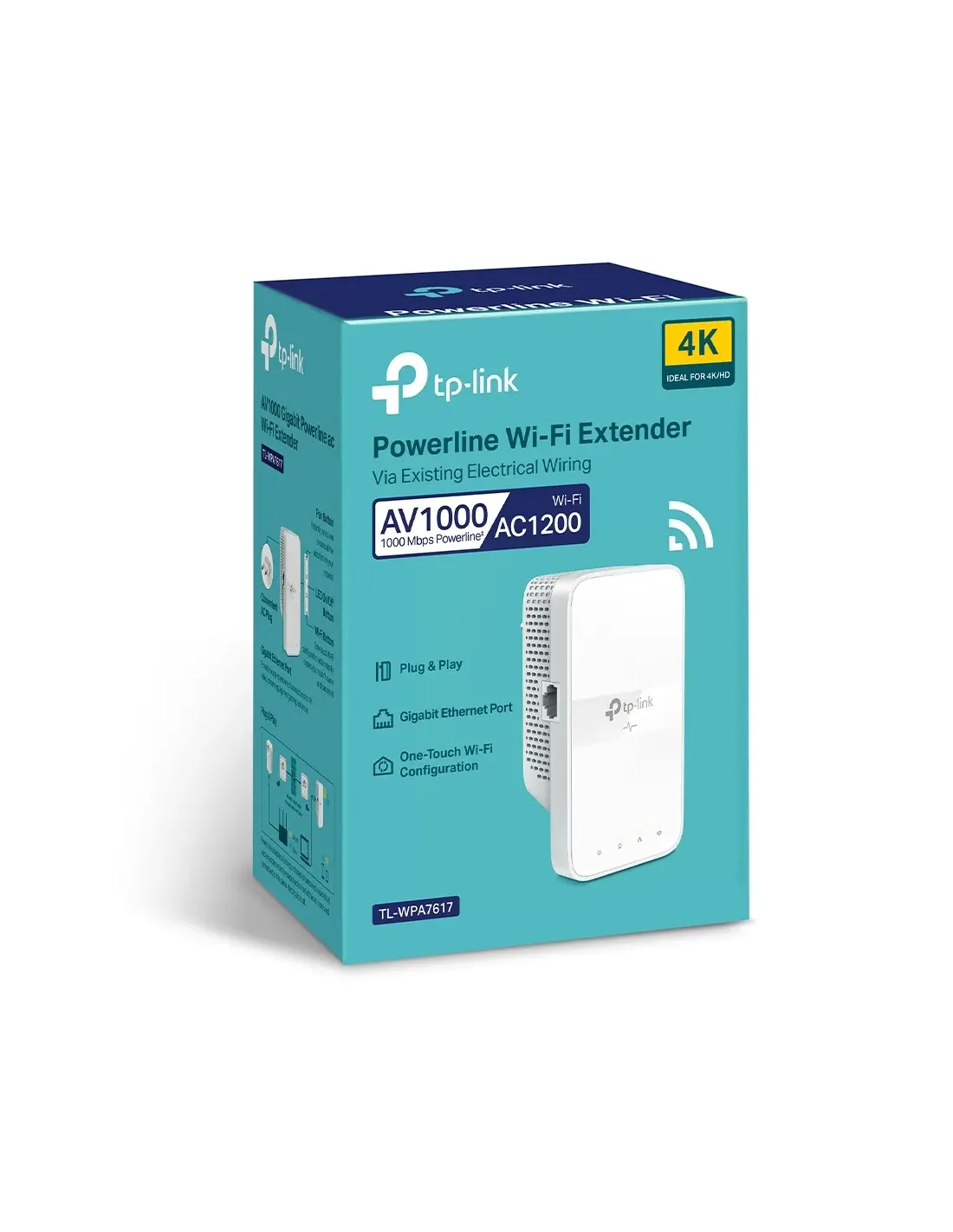 TP-Link TL-WPA7617. Rango máximo de transferencia de datos: 1200 Mbit/s, Estándares de red: IEEE 802.11a, IEEE 802.11ac, IEEE 802.11b, IEEE 802.11g, IEEE 802.11n, IEEE 802.3, IEEE 802.3ab,..., Conector: Tipo E / F. Consumo energético: 6,5 W. Color del producto: Blanco, Tipo de antena: Interno. Ancho: 69,5 mm, Profundidad: 35 mm, Altura: 124,1 mm. Certificados de conformidad: CE, RoHS