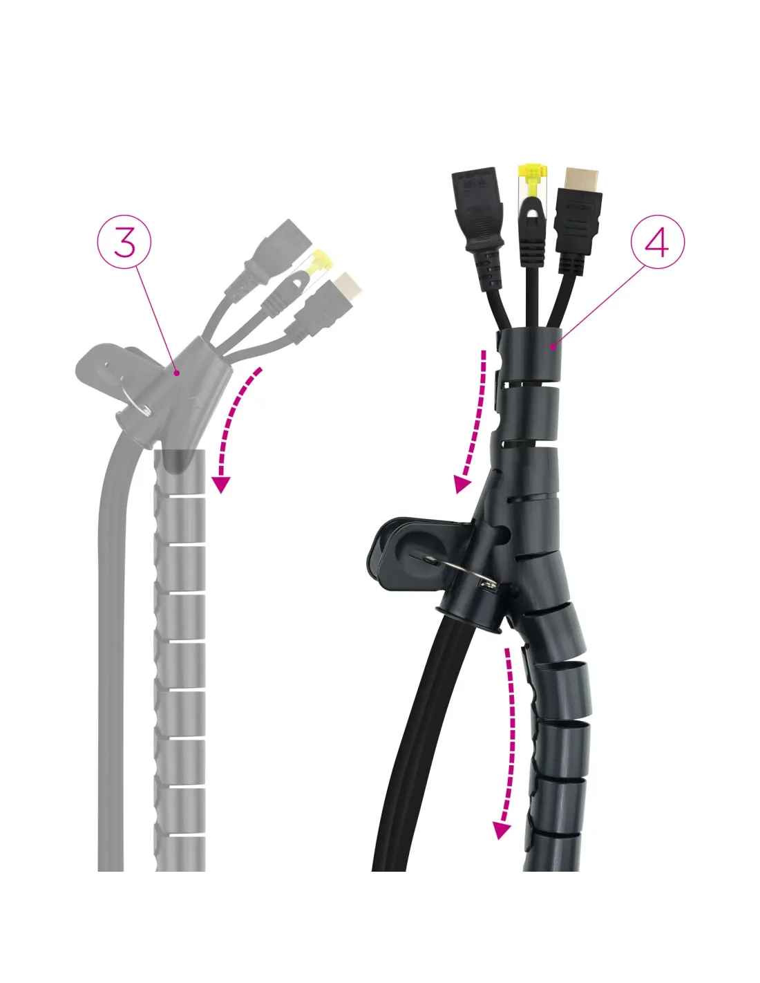 ORGANIZADOR DE CABLES¿Los cables se lían solos? Ahora puedes mantener tu espacio de trabajo y hogar totalmente ordenado y sin cables a la vista. Además, nuestro organizador está disponible en blanco y negro.Se coloca el adaptador con la flecha hacia arriba y se abre ubicando los cables en su interior.Se introduce el adaptador con los cables por un extremo del organizador.Se desliza el adaptador a lo largo de todo el organizador, dejando a su paso los cables dentro.El organizador de cables es perfecto para recoger los cables de manera práctica y sencilla en cualquier entorno. Gracias a su composición flexible y resistente de un metro de longitud y un diámetro de 25 mm otorga una fácil y rápida instalación, dejando como resultado los cables ordenados y disimulados en su interior.