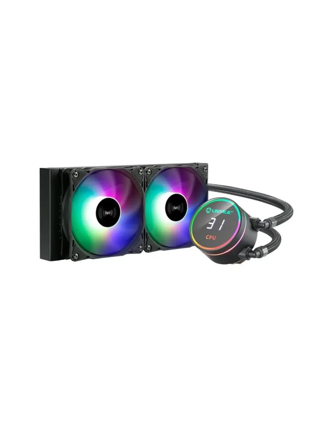 UNYKAch presenta su nueva refrigeración líquida AquaStorm 240, la solución perfecta para mantener los procesadores Intel y AMD en óptimas condiciones de temperatura. Con una bomba de alta calidad que alcanza los2500 RPM, los usuarios podrán disfrutar de una refrigeración eficiente y silenciosa. Además, cuenta con un display que muestra la temperatura de la CPU en tiempo real, lo que permite a los usuarios tener un controlabsoluto sobre el rendimiento de su equipo.Los ventiladores de 1800 RPM cuentan con sensor PWM, garantizando un flujo de aire óptimo en todo momento. Y no solo eso, la AquaStorm 240 también es visualmente impresionante gracias a su efecto RGB Rainbowen la bomba. Con este modelo, los usuarios pueden personalizar el aspecto de su equipo y darle un toque único y llamativo.LECTOR DE TEMPERATURA DE LA CPUUna de las características más útiles de esta refrigeración líquida es su capacidad para mostrar la temperatura de la CPU en tiempo real. A través de un display integrado, podrás controlar constantemente el rendimientotérmico de tu procesador.Esta función te brinda una tranquilidad adicional, ya que siempre estarás al tanto de la salud de tu CPU y podrás tomar medidas preventivas si es necesario.TUBO TRENZADONuestro diseño trenzado no solo proporciona una estética impresionante a tu sistema de refrigeración, sino que también mejora la flexibilidad del tubo, facilitando su instalación en cualquier configuración de PC. Gracias asu estructura trenzada, el tubo ofrece una mayor resistencia a la deformación, lo que garantiza un flujo de líquido sin restricciones para una refrigeración óptima de todos los componentes de tu PC.MAXIMA EFICIENCA DE REFRIGERACIÓNCon una capacidad de refrigeración de hasta 250W de TDP (Potencia de Diseño Térmico), este radiador está preparado para mantener tus componentes frescos y protegidos incluso en los entornos más desafiantes. Yasea que estés realizando tareas intensas de edición, jugando a los últimos títulos o ejecutando aplicaciones exigentes, nuestro radiador y ventilador trabajarán sin descanso para asegurar un rendimiento de primera clase.UNYKAch AquaStorm 240. Tipo: Sistema de refrigeración líquida todo en uno, Diámetro de ventilador: 12 cm. Ancho: 120 mm, Profundidad: 275 mm, Altura: 52 mm. Color del producto: NegroDesempeñoLocalización adecuada ProcesadorTipo Sistema de refrigeración líquida todo en unoDiámetro de ventilador 12 cmSockets de procesador soportados LGA 1150 (Zócalo H3), LGA 1151 (Zócalo H4), LGA 1155 (Socket H2), LGA 1156 (Socket H), LGA 1200 (Socket H5), LGA 1700, LGA 2011-v3 (Socket R), LGA 2066, Socket AM2, SocketAM3, Socket AM3, Socket AM3+, Zócalo AM4, Zócalo AM5, Socket FM1, Socket FM2, Socket FM2+Compatible con modulación por ancho de pulsos (PWM) SiNivel de ruido del ventilador (máx.) 25 dBTecnología de rodamiento de ventilador Rodamiento hidráulicoCantidad por paquete 1 pieza(s)Velocidad de ventilador (max) 1800 RPMTiempo medio de fallo (MTTF) de la bomba 50000 hTiempo medio de fallo (MTTF) del ventilador 50000 hDiseñoColor del producto NegroMaterial AluminioNúmero de ventiladores 2 Ventilador(es)Número de aspas del ventilador 9Iluminación LED SiIluminación de color MultiConector de ventilador 4 pinesCertificación CE / ROHSControl de energíaPotencia de diseño térmico (TDP) 250 WPeso y dimensionesAncho 120 mmAncho de radiador 12 cmProfundidad de radiador 27,5 cmAltura de radiador 2,7 cmLongitud del tubo 35 cmAltura 52 mmPeso 1,8 kgDimensiones del ventilador (A x A x P) 120 x 120 x 25 mmAncho del paquete 223 mmProfundidad del paquete 336 mmAltura del paquete 135 mmPeso del paquete 2,11 kgContenido del embalajeTipo de embalaje CajaKit de montaje SiSoporte(s) de CPU Si