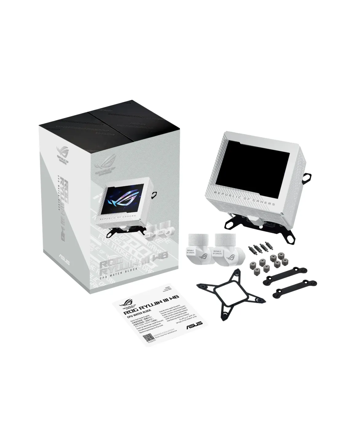 ASUS ROG RYUJIN III WB White Edition. Tipo: Bloque de agua, Material: Cobre, Color del producto: Blanco. Ancho: 89 mm, Profundidad: 89 mm, Altura: 107 mm. Cantidad por paquete: 1 pieza(s), Ancho del paquete: 124 mm, Profundidad del paquete: 121 mm