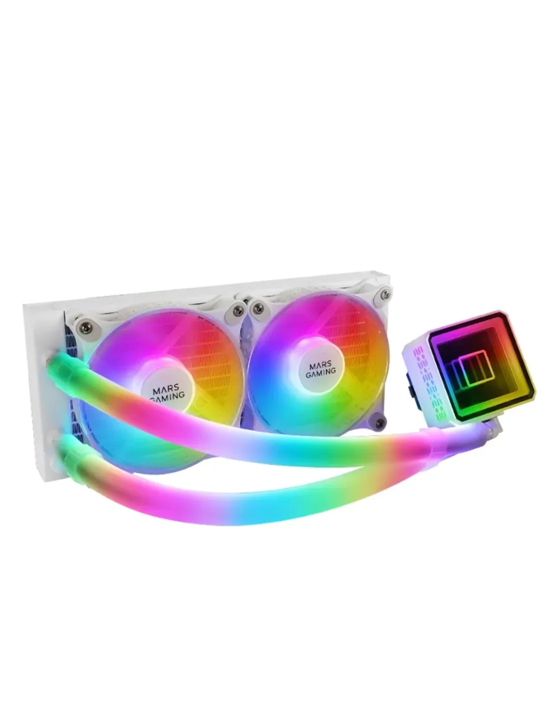 MARS GAMING Cooler ML-ULTRA240 FULL ARGB WHITEMarca Mars GamingModelo MLULTRA240WCaracteristicas generales - TDP: 500W- Tubos: 400mm / Teflon- Radiador: 275x120x27mm / Aluminum- RGB Addressable: FRGB con efecto espejo infinito- CPU Socket:INTEL LGA 2066/ 2011/ 1700/ 1200/ 1156/ 1155/1151/1150 y AMDsTRX4/ sTR4/ SP3/ AM5/ AM4 /AM3+ / AM3/ AM2+/ AM2/ FM2/ FM1- Conectores iluminación: Addressable RGB +5V 3 pin + VDG 3 pin- Peso total: 1120gBomba - Dimensiones: 69x89x55mm- Velocidad: 3200 RPM10%- Material: Cobre- Nivel sonoro: 15 dBA- Conector: PWM 4 pinVentilador - Dimensiones: 120x120x25mm- Velocidad: 600-1800 10% RPM- Nivel sonoro: 9-26 dBA- Flujo de aire: 27.2-69.2 CFM- Rodamientos: Hidráulico- Conector: PWM 4 pin- Voltaje / Corriente ventilador: 12V DC / 0.15A- Voltaje / Corriente ARGB: 5V DC / 0.25A