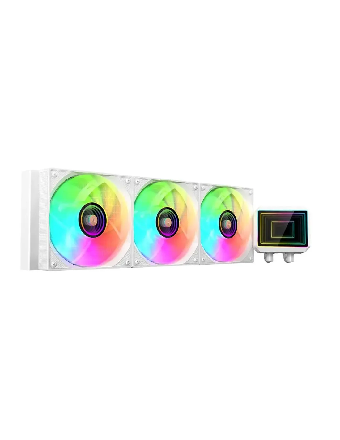 Características del Sistema de Refrigeración Líquida Mars Gaming ML-TWO360W 3x120mm ARGB BlancoEl Mars Gaming ML-TWO360W es un sistema de refrigeración líquida AIO de alto rendimiento diseñado para mantener bajo control las temperaturas de las CPUs más exigentes. Con una capacidad de disipación de hasta 600W TDP, un radiador de 360 mm y tres ventiladores ARGB de 120 mm, ofrece un equilibrio perfecto entre potencia térmica, funcionamiento silencioso y una estética gaming avanzada. Su espectacular iluminación con efecto Infinity Mirror convierte cualquier equipo en una configuración visualmente impactante.Capacidad de disipación extrema de hasta 600W TDPEste sistema de refrigeración está diseñado para soportar las CPUs de alto rendimiento de última generación, manteniendo temperaturas estables incluso bajo cargas intensivas de trabajo o sesiones gaming prolongadas. Su radiador de gran tamaño y su sistema optimizado garantizan una disipación de calor eficiente.TDP máximo soportado: 600WRadiador de gran tamaño de 360 mmDiseñado para configuraciones gaming y profesionalesIluminación ARGB con efecto Infinity MirrorEl diseño visual del ML-TWO360W destaca por su doble efecto Infinity Mirror, presente tanto en el bloque de la bomba como en los ventiladores. Este sistema de iluminación ARGB permite crear una estética gaming envolvente y totalmente personalizable, integrándose con los principales sistemas de sincronización RGB del mercado.Iluminación ARGB direccionableEfecto Infinity Mirror en bomba y ventiladoresCompatible con ASUS Aura Sync, Mystic Light y RGB FusionBomba Opti-Chamber de 4ª generaciónLa tecnología Opti-Chamber de cuarta generación optimiza el flujo del líquido refrigerante para mejorar la transferencia térmica. Junto a su base de cobre con microcanales de alta precisión, garantiza una disipación de calor eficiente directamente desde el procesador.Bomba Opti-Chamber de 4ª generaciónBase de cobre con microcanales de alta precisiónVelocidad de bomba de 2800 RPM ± 10%Ventiladores de alto rendimiento con rodamientos FDBEl sistema incorpora tres ventiladores de 120 mm equipados con rodamientos Fluid Dynamic Bearing (FDB), diseñados para ofrecer un flujo de aire potente y estable con un funcionamiento silencioso. Además, ayudan a reducir vibraciones y mejorar la durabilidad del conjunto.3 ventiladores ARGB de 120 mmVelocidad: 800 - 2000 ± 10% RPMFlujo de aire: 27.2 - 69.2 CFMDiseño duradero con tubos de teflónLos tubos optimizados están fabricados en teflón de baja resistencia, lo que facilita una mejor circulación del líquido refrigerante y aumenta la durabilidad del sistema. Su longitud de 400 mm permite una instalación cómoda en una amplia variedad de cajas.Longitud de tubos: 400 mmMaterial de tubos: teflón de baja resistenciaRadiador de aluminio de alta eficienciaAmplia compatibilidad con sockets Intel y AMDEl ML-TWO360W ofrece compatibilidad universal con plataformas Intel y AMD, facilitando su instalación en la mayoría de sistemas modernos. Esto lo convierte en una solución ideal para equipos gaming, estaciones de trabajo o actualizaciones de refrigeración.Intel: LGA 2066 / 2011 / 1851 / 1700 / 1366 / 1200 / 115xAMD: AM5 / AM4Otras especificacionesDimensiones de la bomba: 84 x 70 x 48 mmConector de la bomba: PWM 4 pinVoltaje / corriente de la bomba: 12V DC / 0.25ADimensiones del radiador: 395 x 120 x 28 mmMaterial del radiador: aluminioVoltaje / corriente del ventilador: 12V DC / 0.15ADimensiones del artículo: radiador 395 x 120 x 28 mmPeso neto: 1510 g