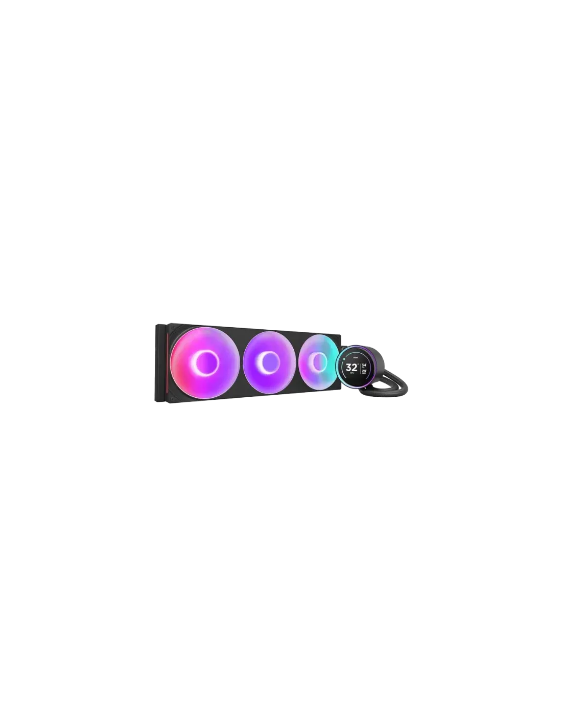 El Kraken Elite V2 es más que un disipador: es una pieza central. Su unidad RGB Core de triple ventilador fusiona tres ventiladores de 140 mm en un solo chasis, generando una alta presión estática con un ruido mínimo, ideal para conjuntos de aletas densos y configuraciones de chasis que priorizan el flujo de aire. Sobre la bomba, una pantalla IPS de 2,72", rodeada por un anillo RGB brillante, añade una capa visual dinámica que muestra la temperatura del sistema, logotipos personalizados o gráficos animados, todo controlado mediante NZXT CAM. En esencia, la bomba de turbina mantiene el refrigerante en movimiento con silenciosa confianza, diseñada para una carga térmica sostenida sin el zumbido ni la vibración habituales. Todo está integrado mediante tubos de malla resistentes, cableado despreocupado y un diseño que luce tan elegante como funciona: sin desorden ni concesiones, solo claridad y control.