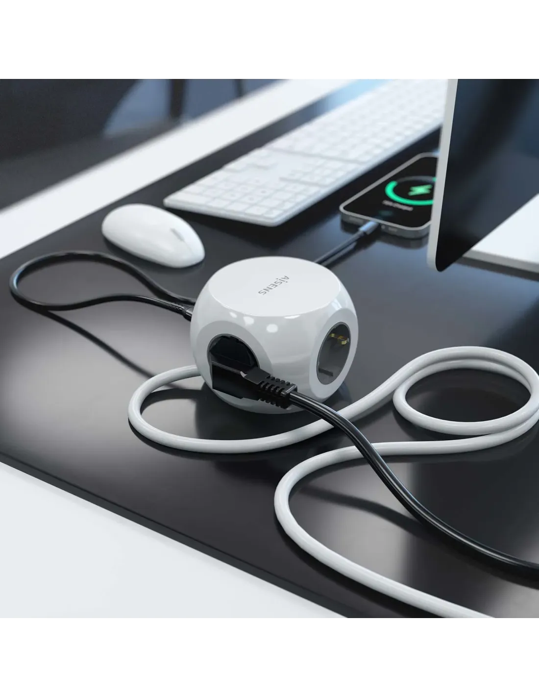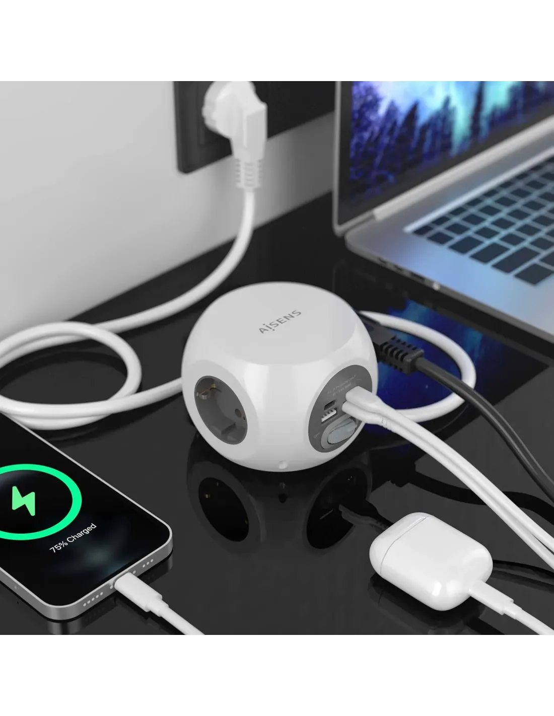 AISENS® ? Base múltiple multifunción de sobremesa (regleta de enchufes) con interruptor y 3 tomas Schuko, 2 puertos USB-C, 2 puertos USB-A. El cable de alimentación tiene una longitud de 1.4 metros y una sección de 3×1.5mm2.
