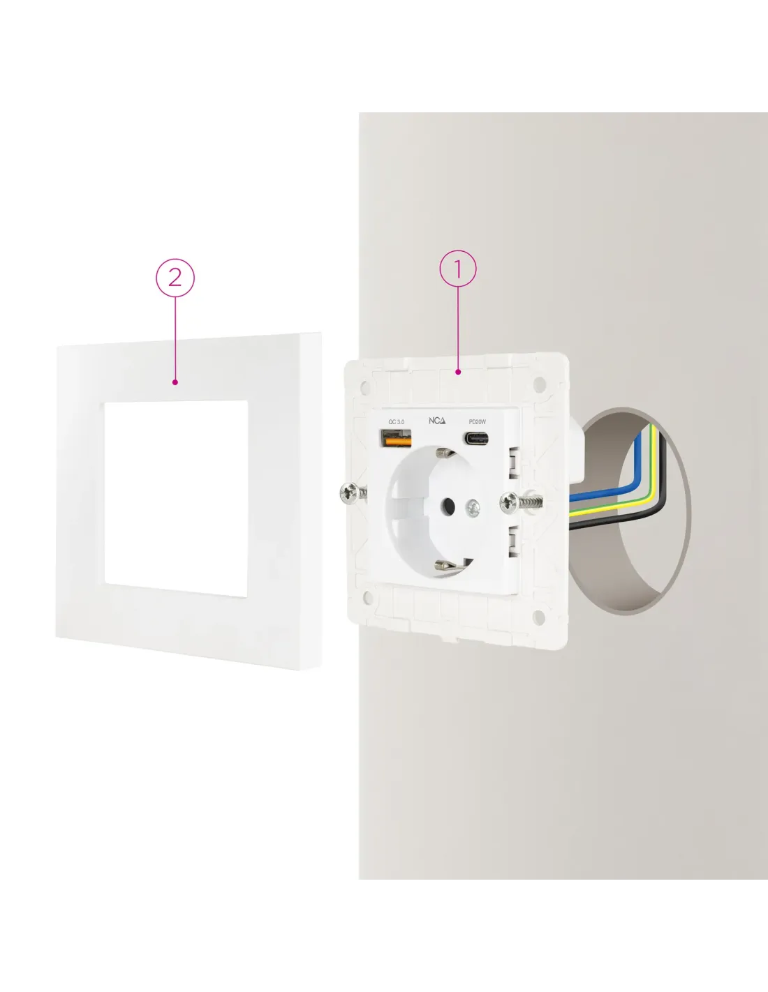 Marca Nanocable Modelo 10.35.0011 Características - Instalacion: apto para cajetin universal redondo o cuadrado mediante tornillos - Toma de corriente: CEE 7/3 con toma de tierra - Puertos de carga: 1 x USB Tipo A con QC 3.0 1 x USB Tipo C PD o USB Tipo A - Corriente maxima USB: 5 V / 3,4 A total - Potencia USB PD: 20 W - Entrada electrica maxima: 16 A / 250 V - Seccion maxima de cable admitida: 2,5 mm - Proteccion: cortocircuitos - Certificaciones: CE, RoHS, LVD, KEMA Contenido - 1 x enchufe - 2 x tornillos - 1 x manual de usuario Fecha de revisión 21-01-2026 por IS