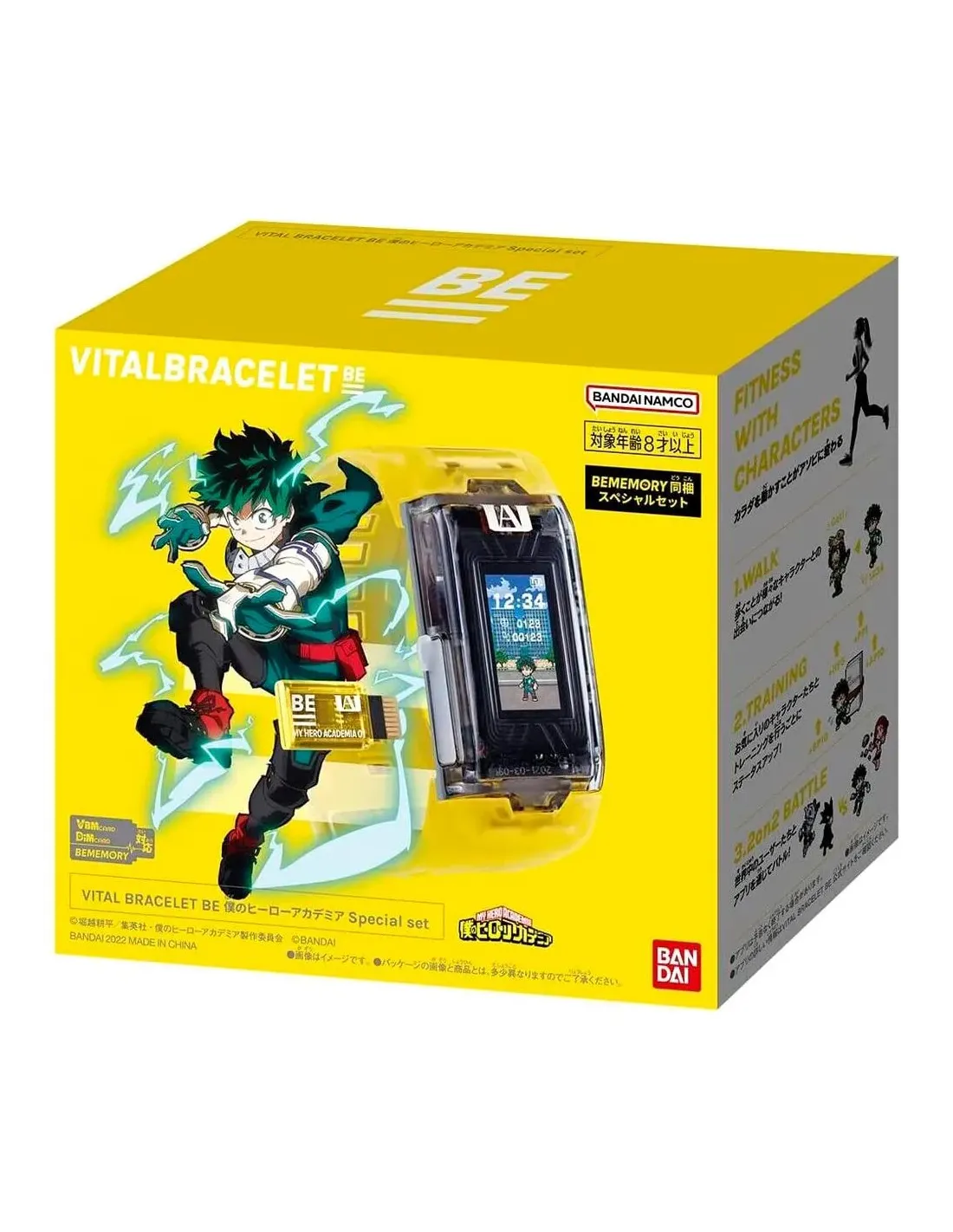 CaracterísticasJuego de pulsera Vital Bracelet My Hero Academia: Entrena a tu mascota cibernética y a ti mismo con el juego de pulseras vitales My Hero Academia y controla el crecimiento de tu personaje con tuactividad. Este juego de reloj de fitness My Hero Academia es un gran regalo de anime para cualquier fan de la serie.Training: A medida que completes Actividad física que tu mascota electrónica cambiará de forma con 25 formularios para descubrir. Puedes entrenar diferentes estadísticas con diferentes ejercicioscomo puñetazos, sentadillas, abdominales y correr. Capacidad para hasta 4 caracteres en el reloj digital con más en la aplicación.Battle: A medida que caminas se te presentarán nuevos personajes, objetivos y enemigos para superar todos los días. Cuando estés seguro de la habilidad de tus mascotas cibernéticas, cárgalas a laaplicación y participa en batallas en línea con tu equipo.Colecciónalos todos. La pulsera Vital BE es compatible con tarjetas de memoria BE que te permiten introducir nuevos personajes y mundos a tu dispositivo digital. Con cartas que representan aDigimon, Tokyo Revengers y Demon Slayer, qué tipo de equipo construirás?Especificaciones Bandai Vital Bracelet My Hero AcademiaFuncionalidad de comunicación de campo cercano (NFC) para iniciar, en contacto con varios dispositivos (estaciones de metro, terminales de pago sin contacto, etc.), peleas.Lucha contra otros jugadores que poseen los relojes Vital My Hero Academia.Descarga la aplicación Vital Lab en tu teléfono Android e iOS (disponible solo en francés e inglés) para ver tus estadísticas y las de tu personaje.Haz evolucionar a tu héroe. Gana trofeos completando misiones y gana puntos de vida usando el reloj durante las actividades deportivas o ganando peleas.Idiomas disponibles: Inglés y japonés. Español no disponible.Contenido:1 x Reloj de seguimiento de fitness Vital Bracelet con una correa amarilla transparente1 x Tarjeta de memoria My Hero Academia BE que te da la opción de criar y entrenar personajes del manga y anime1 x Cable de carga USB-CNota: El reloj no debe entrar en contacto con el agua.