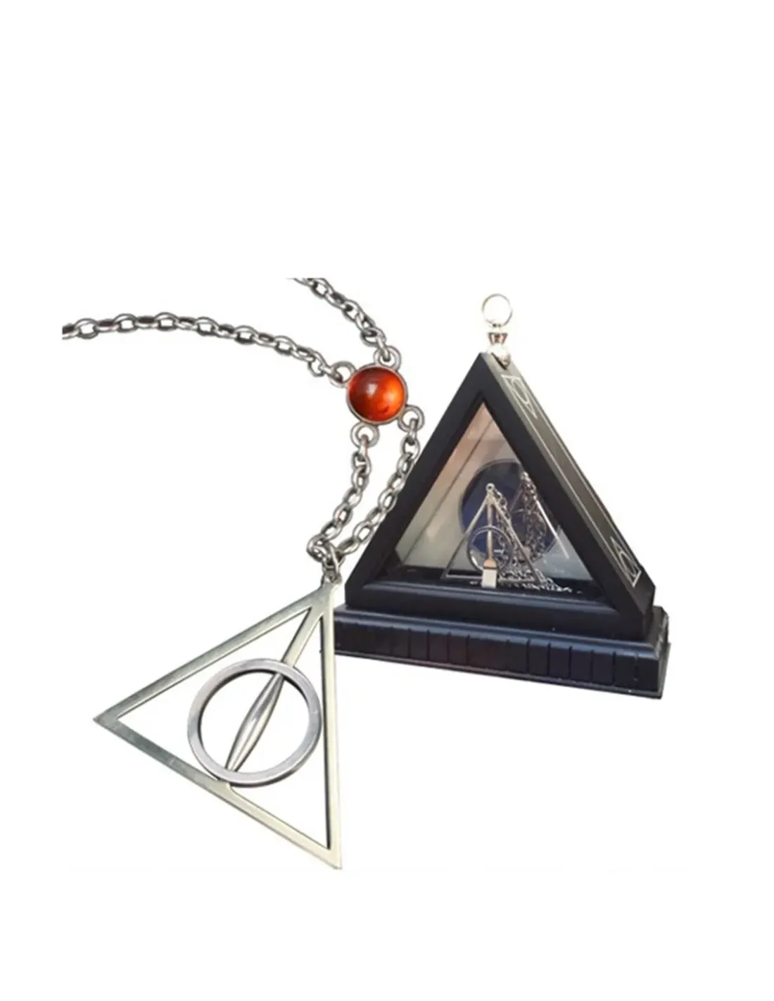 El triangulo es un símbolo que hace referencia a las reliquias de la muerte: La Varita de Saúco, la Piedra de Resurrección y la Capa de Invisibilidad.Finamente acabada, con un centro de rotación que lleva el símbolo de las Reliquias de la Muerte.El colgante incluye una cadena de 80 cm reglable y un cofre collectorMaterial: Chapado en plataDimensiones: 15 cm / 5 cm
