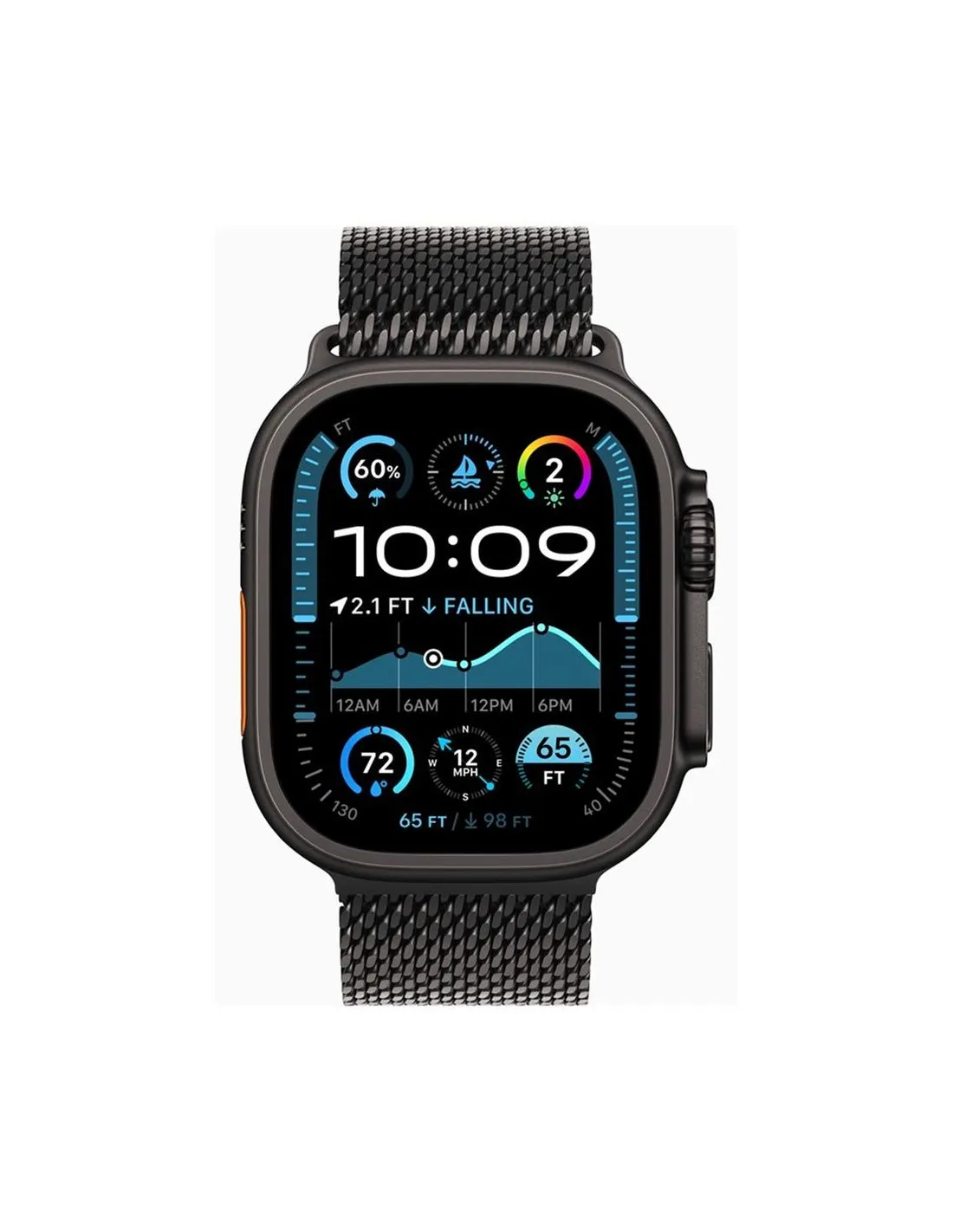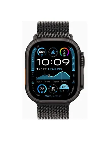 Con una caja fabricada en titanio negro de grado aeroespacial y resistencia certificada MIL-STD-810H, el Apple Watch Ultra 2 está pensado para condiciones extremas. Su pulsera Milanese Loop con cierre tipo paracaídas ofrece estilo y seguridad, y es apta para muñecas de 130 a 160 mm.
