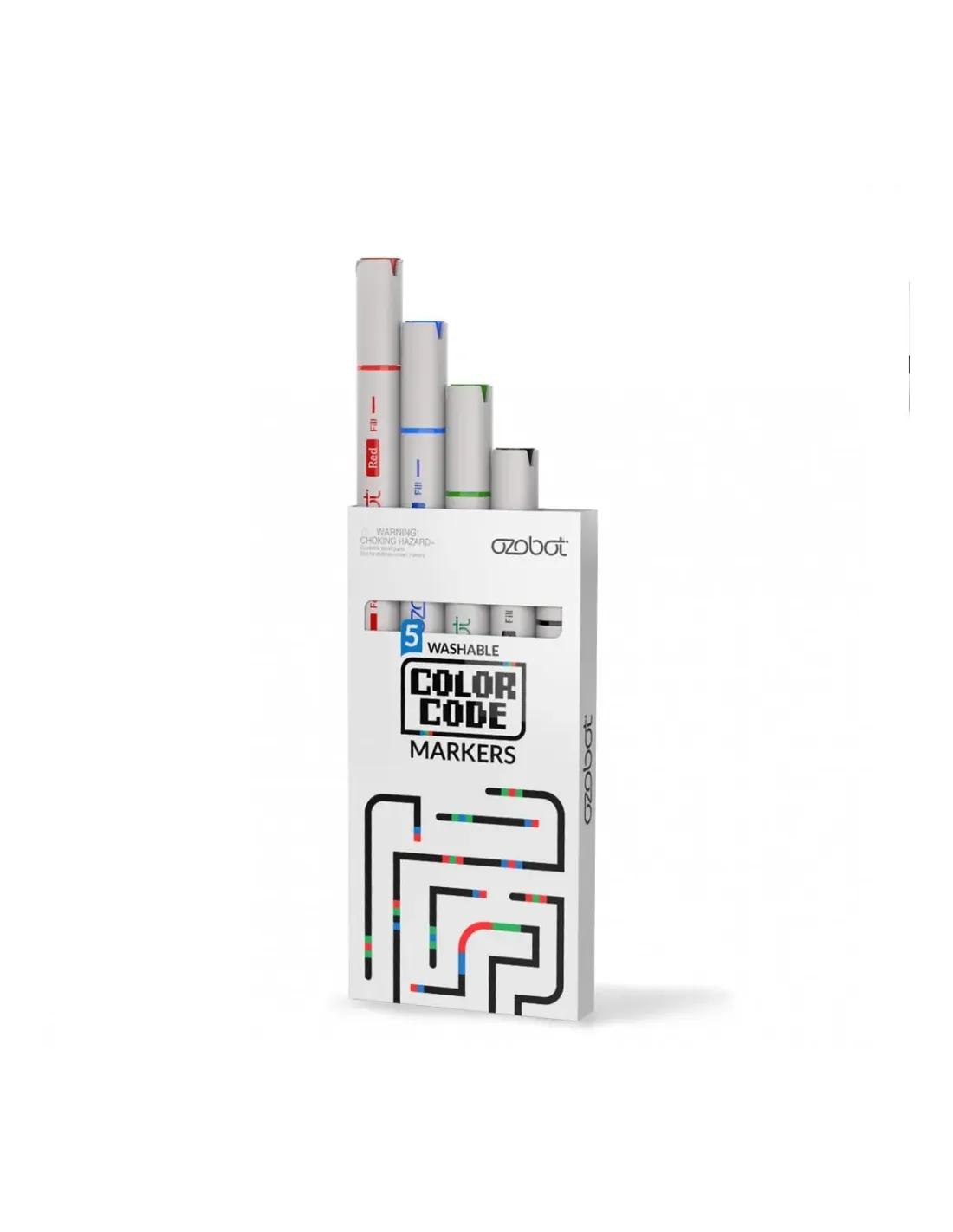 Set de CINCO rotuladores, rojo, azul, verde y dos negros, para marcar lineas y códigos de color. Programa tu Ozobot® BIT y EVO en papel.Con su doble punta, fina y plana facilita el correcto trazado de la linea y los detalles.El alumnado crea carreteras, recorridos, laberintos y mapas mientras trabaja las habilidades STEAM.A partir de 6 años.