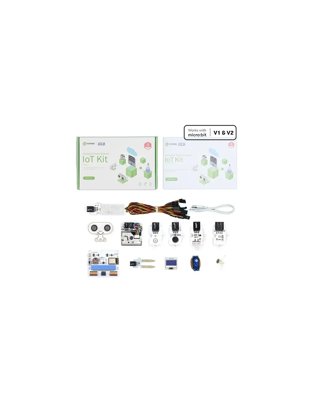 Smart Science IoT Kit está desarrollado en base a IoT:bit, una nueva placa de conexión compatible con sensores específicos para la realización de proyectos de ciencias (como el sensor ultrasónico, elsensor de polvo, el sensor de luz y el sensor de nivel de agua, incluidos RTC Timing y Módulo WIFI).No incluye la placa microbit.Edad: 12+Este kit se basa en la nueva placa IoT compatible con la nueva micro:bit v2, la IoT:bit (incluida). También se añaden varios sensores para crear proyectos con datos en la nube vía WIFI (Internet de lascosas).Puedes crear escenas como monitoreo de la calidad del aire, detección de ruido ambiental, una estación de monitoreo de la calidad ambiental, detección automática de riego, una estación de monitoreode autodefensa y más.Los ricos bloques de programación gráfica Makecode permiten a niños y niñas aprender a programar desde lo más simple hasta lo más complejo.La tarjeta incluye zumbador para emitir sonidos y un reloj RTC para obtener la hora actual.Características:WiFi ESP12F integradoRTC, zumbador pasivo y toma de auriculares integradosConectores GVS e IICLEGO compatible (4 orificios con separación estándar)Software: Makecode / Micropython / JavaScriptContiene:1 placa de extensión IoT:bit Internet WIFI para micro:bit1 BME 280 (sensor de presión, temperatura y humedad)1 Sonar:bit1 sensor PIR1 sensor de Luz1 sensor de Sonido1 sensor de Nivel de Agua1 sensor de Humedad del Suelo1 sensor de Polvo1 pantalla OLED1 servo de 180°1 cable micro USBCables puenteGuía en inglésNO Contiene:Tarjeta micro:bitPila de botón CR1220 necesaria para la alimentación del reloj RTCRecoge 10 lecturas de datos diferentesPresenciaIntensidad de luzRuidoPresión del aireTemperaturaHumedadPolvoHumedad del sueloNivel de aguaDistanciaProgramaciónLa programación se puede realizar mediante MakeCode ya que cuenta con una extensión desarrollada por el fabricante para IoT:bit, que facilita la conexión a la red WiFi además de implementar bloquesque permiten usar diferentes plataformas como: ThingSpeak, KidsIoT, MQTT y IFTTT.ThingSpeak permite desarrollar aplicaciones IoT y también analizar y visualizar los datos en MATLABKidsIoT destaca por su facilidad de usoMQTT es un protocolo que permite la comunicación máquina a máquina con un escaso uso de datosIFTTT está pensada para programar acciones "IF This Then That / Si ocurre esto, haz esoProyectos desarrollados (en inglés)Internet de las Cosas (IoT) es la red de dispositivos electrónicos que se conectan a la nube para interactuar e intercambiar datos. De esta manera, cualquier objeto cotidiano que incorpore esta tecnologíapuede ser monitorizado y controlado remotamente a través de Internet.En este kit se explican 5 proyectos de ejemplo:Detección de la calidad del aireDetección del ruido ambientalEstación de seguimiento de la calidad ambientalSistema automatizado de riegoSistema de seguridad