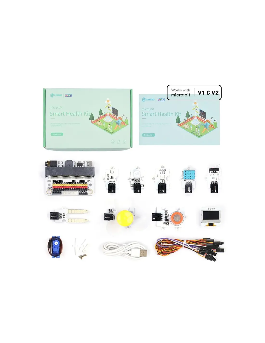 El kit de salud inteligente de micro:bit contiene una completa selección de sensores con los que podemos diseñar multitud de proyectos relacionados con los hábitos saludables: detector de luz UV,recordatorio de la postura sentada, detector de alcohol, cubo de basura inteligente y muchos más.No incluye la placa microbit.Edad: 8+Contiene:1 Sensor:bit1 sensor de alcohol MQ31 sensor de choque1 LED arcoíris1 sensor PIR (infrarrojo)1 sensor DHT11 (sensor de temperatura y humedad ambiente)1 sensor UV1 sensor de humedad del suelo1 motor con ventilador1 pantalla OLED1 servo de 180°1 cable micro USBCables puenteGuía en inglésNO Contiene:Tarjeta micro:bitProyectos que puedes hacer:Dispositivo de lavado de manos sin contactoDispositivo de detección de luz ultravioletaVentiladores con Control de TemperaturaDispositivo de detección de alcoholDispositivo de riego de flores para interioresEl recordatorio de beber aguaMonitorizar Humedad y TemperaturaContador de pasosRecordatorio de sedentarismoEl recordatorio de la postura sentadaCubo de basura inteligenteLa Detección de Ruido en las Aulas