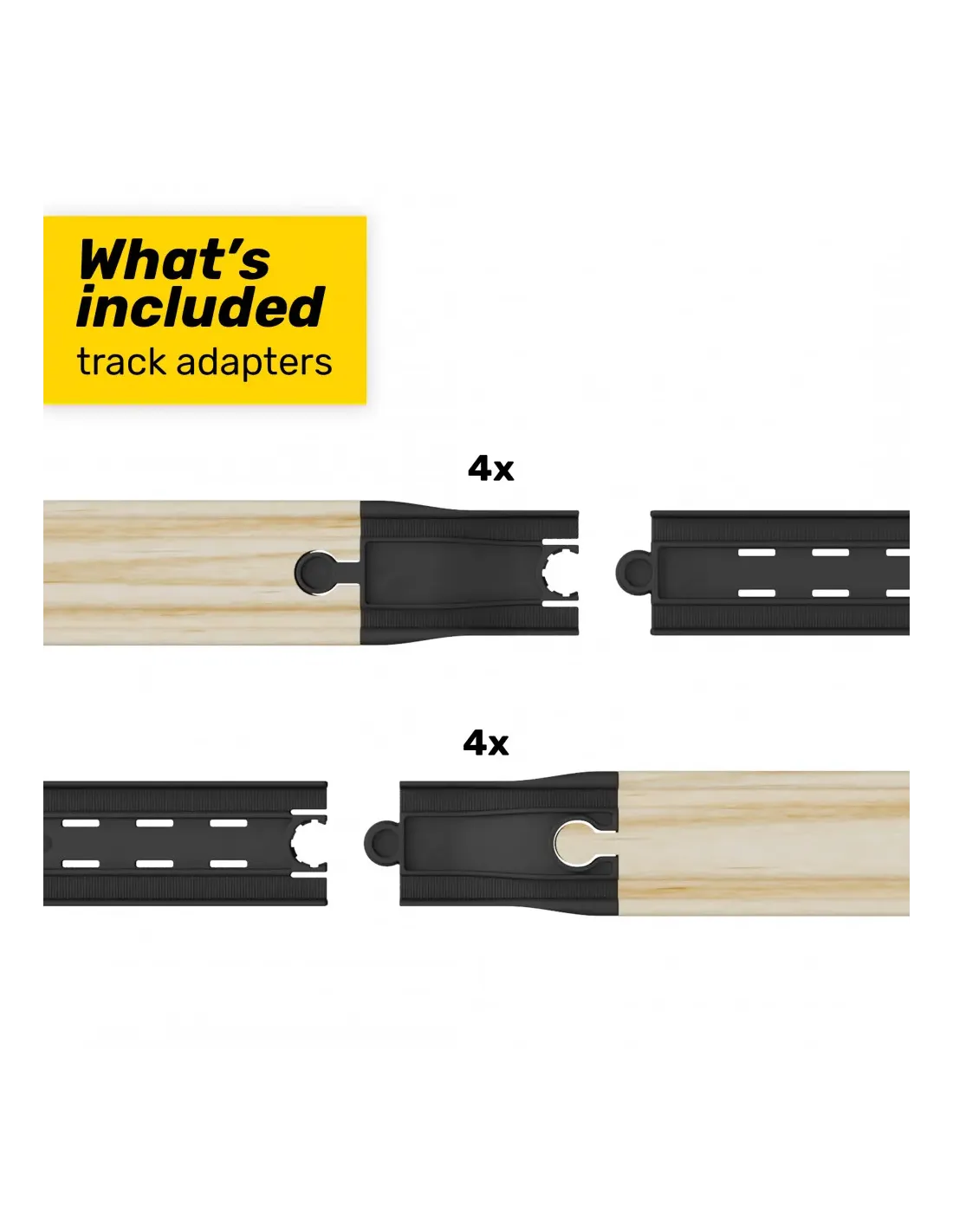 El Tren INTELINO está diseñado para ser compatible con los sistemas de trenes de madera más populares.Con estos adaptadores las pistas intelino también pueden interconectarse con las pistas de madera.Los adaptadores de las vias de madera conectan perfectamente con lasvias de Intelino y con las vias de madera clásicas. ¡Combina intelino y tusjuegos de trenes de madera favoritos y amplia las posibilidades de juego!Este kit incluye 8 adaptadores: 4 piezas de intelino-to-wood y 4 piezas dewood-to-intelino (las pistas de madera no estan incluidas).Las uniones de ajuste rápido de la pista son fáciles de unir y separar mientras brindan soporte en seis grados de libertad. Sin embargo, las uniones ofrecen la flexibilidad suficiente para la construcciónlibre de frustraciones de diseños de pistas personalizadas.Contiene:8 adaptadores