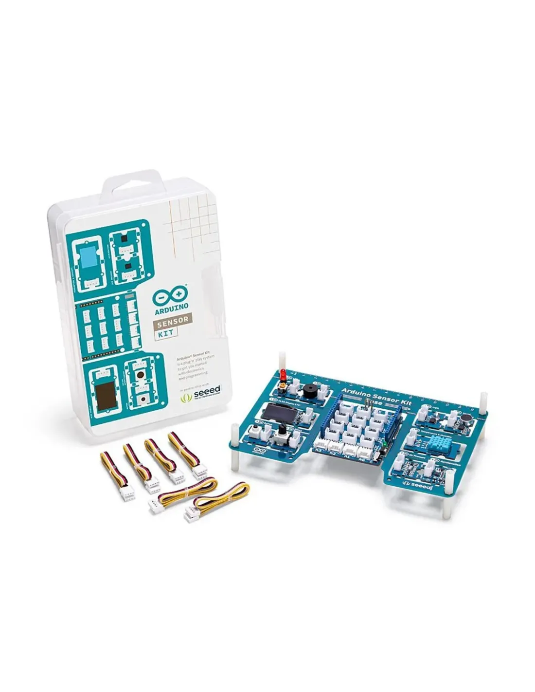 Kit de sensores de ARDUINOEl ARDUINO Sensor Kit - Bundle incluye la placa Arduino UNO más un conjunto de los sensores más vendidos. Todos los módulos están precableados en la PCB¡Simplemente conecta tu placa Arduino al Shield y comienza a medir!Edad: 12-99Nº de estudiantes por kit: 1-2Qué es ARDUINO Sensor KitEl ARDUINO Sensor Kit - Bundle está hecho para makers y/o estudiantes que acaban de comenzar a usar Arduino para explorar el vasto espacio de la electrónica y la programación.Este kit enseña cómo conectar y programar módulos Grove básicos que incluyen sensores y actuadores junto con Arduino Uno.Grove es un conjunto de herramientas de código abierto, modulado y listo para usar y adopta un enfoque de bloques de construcción para ensamblar componentes electrónicos.Este kit incluye un escudo base al que se pueden conectar los distintos módulos Grove, tanto individualmente como juntos en varias combinaciones para crear proyectos divertidos y emocionantes.Todos los módulos utilizan un conector Grove, que conecta cada uno de los componentes a un Base Shield en solo unos segundos. El escudo base se puede montar en una placa Arduino UNO y sepuede programar utilizando el IDE de Arduino. Las instrucciones para conectar y programar los diferentes módulos también se incluyen en este kit.Este kit fue elaborado en colaboración con Seeed Studio y brinda a la comunidad Arduino la oportunidad de construir proyectos con un esfuerzo mínimo tanto de cableado como de codificación. Este kitactúa como un puente hacia el mundo de Grove y proporciona una forma flexible para que los fabricantes amplíen sus proyectos para incluir otros módulos complejos de Grove.El Kit incluye acceso a una Plataforma En Línea con todas las instrucciones necesarias para conectar, dibujar y jugar con los diferentes Módulos Grove.El kit incluye:HARDWARE1 Arduino Uno Rev31 Base Shield que está diseñada para caber en la parte superior de una placa Arduino UNO.Viene equipado con 16 conectores de ranura que, cuando se colocan en la parte superior del UNO, brindan funcionalidad a varios pines.Incluye:7x conexiones digitales4 conexiones analógicas4x conexiones I2C1x conexión UARTLos 10 módulos Grove incluidos se pueden conectar al blindaje de la base, ya sea a través de los conectores digitales, analógicos o I2C del blindaje. Echemos un vistazo rápido a ellos:El LED: LED simple que se puede encender, apagar o atenuar.El botón - pulsador que puede estar en estado ALTO o BAJO.El potenciómetro: una resistencia variable que aumenta o disminuye la resistencia al girar su perilla.El zumbador: un altavoz piezoeléctrico que se utiliza para producir sonidos binarios.El sensor de luz: un fotorresistor que lee la intensidad de la luz.El sensor de sonido: un pequeño micrófono que mide las vibraciones del sonido.El sensor de presión de aire: lee la presión de aire mediante el protocolo I2C.El sensor de temperatura: lee la temperatura y la humedad al mismo tiempo.El acelerómetro: un sensor utilizado para la orientación, utilizado para detectar movimiento.La pantalla OLED: una pantalla en la que se pueden imprimir valores o mensajes.Los 6 cables Grove le permiten conectar fácilmente los módulos a la Base Shield sin necesidad de soldaduras.ATENCIÓN: El cable USB no está incluido en el SOFTWARE del paquete del kit del sensor.La biblioteca del ARDUINO Sensor Kit es un contenedor que contiene enlaces a otras bibliotecas relacionadas con ciertos módulos, como el acelerómetro, el sensor de presión de aire, el sensor detemperatura y la pantalla OLED.Esta biblioteca proporciona apis fáciles de usar que lo ayudarán a construir un modelo mental claro de los conceptos que usará.MATERIALES DE APRENDIZAJEAcceso a una Plataforma en Línea con todas las instrucciones necesarias para conectar, dibujar y jugar con los diferentes Módulos Grove. Hay 10 lecciones y son:01 El LED02 El Botón03 El potenciómetro04 El zumbador05 El sensor de luz06 El sensor de sonido07 El sensor de presión de aire08 El sensor de temperatura09 El sensor de movimiento10 La pantalla OLED