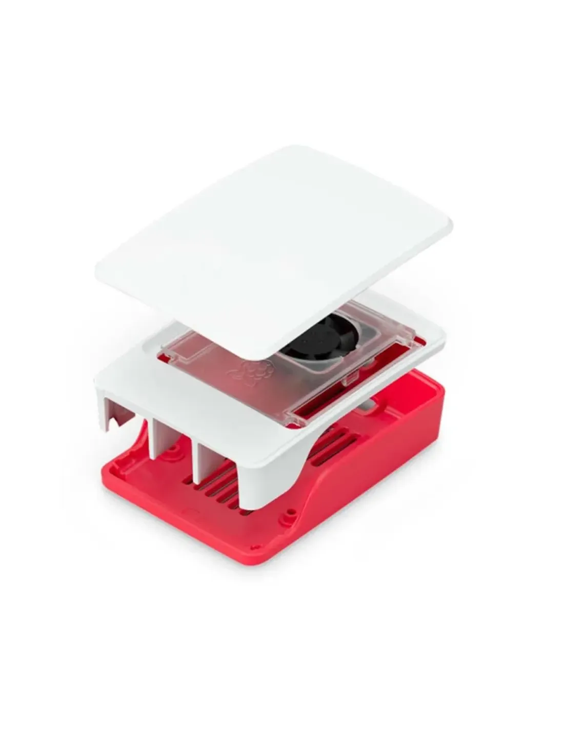 Carcasa raspberry pi 5 con ventilador roja y blanca