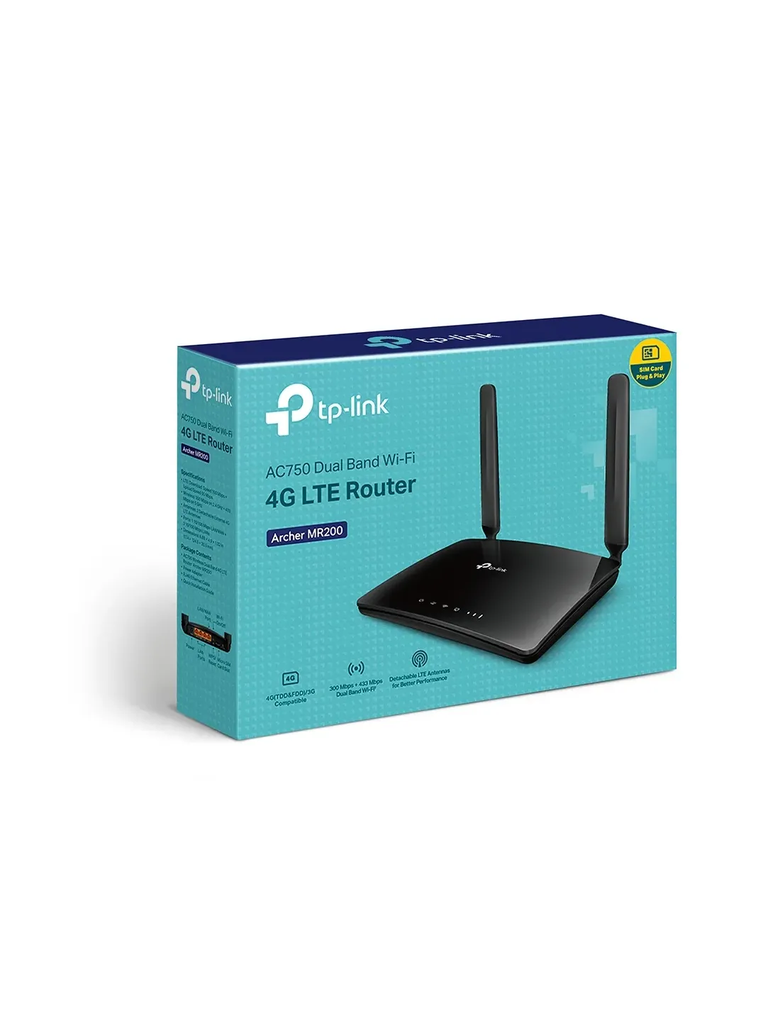 - Comparta su red 4G LTE con múltiples dispositivos Wi-Fi y disfrute de velocidades de descarga de hasta 150Mbps- Potente, antenas integradas que proporcionan conexiones inalámbricas estables y mejor cobertura- No requiere configuración, tan solo inserte una tarjeta SIM y enciéndalo para disfrutar de una rápida conexión inalámbrica- Crea redes Wi-Fi de doble banda simultánea, con un máximo de velocidad de hasta 300Mbps en la banda de 2.4GHz y 433Mbps en la banda de 5GHz- Ofrece opciones y flexibilidad con el puerto LAN/WAN, permitiéndole elegir su tipo de conexiónComparta Su Red 4G LTEAproveche al máximo la innovadora red 4G LTE con el Archer MR200, que permite conseguir velocidades de descarga de hasta 150Mbps. El Archer MR200 le permite compartir su red 4G LTE con múltiples dispositivos Wi-Fi, así podrá disfrutar de películas HD, descarga rápida de archivos y video chats sin que la estabilidad sufra. Gran Cobertura y Wi-Fi de Doble BandaEl router 4G LTE crea una red Wi-FI de doble banda simultánea que puede repartir los datos a velocidades de hasta 733Mbps. Las dos redes inalámbricas independientes, utilizan las bandas de 2.4GHz y 5GHz, proporcionan rendimiento optimizado minimizando las interferencias en la de señal. La incorporación de las avanzadas antenas y de la última tecnología inalámbrica le permite disfrutar de conexiones estables y cobertura increíble.No Requiere ConfiguraciónCon un módem 4G LTE integrado y una ranura para tarjeta SIM integrada, lo único que necesita hacer es insertar una tarjeta SIM y encender el Acher MR200. Disfrutar de Wi-Fi rápido y estable en una red 4G LTE nunca fue tan fácil.Wi-Fi Donde Sea NecesarioEl Archer MR200 ofrece practicidad y versatilidad inigualable. La capacidad de establecer rápidamente potentes redes inalámbricas puede ser tremendamente importante. El Archer MR200 es la perfecta solución si está en casa o trabajando en una ubicación remota. Tan solo conéctelo y aumente al instante la productividad y permanezca conectado en una amplia variedad de entornos.Conexión WAN Disponible como BackupCon la incorporación del puerto WAN/LAN, el Archer MR200 puede también soportar una amplia variedad de tipos de conexiones, incluyendo cable, fibra y módems DSL.